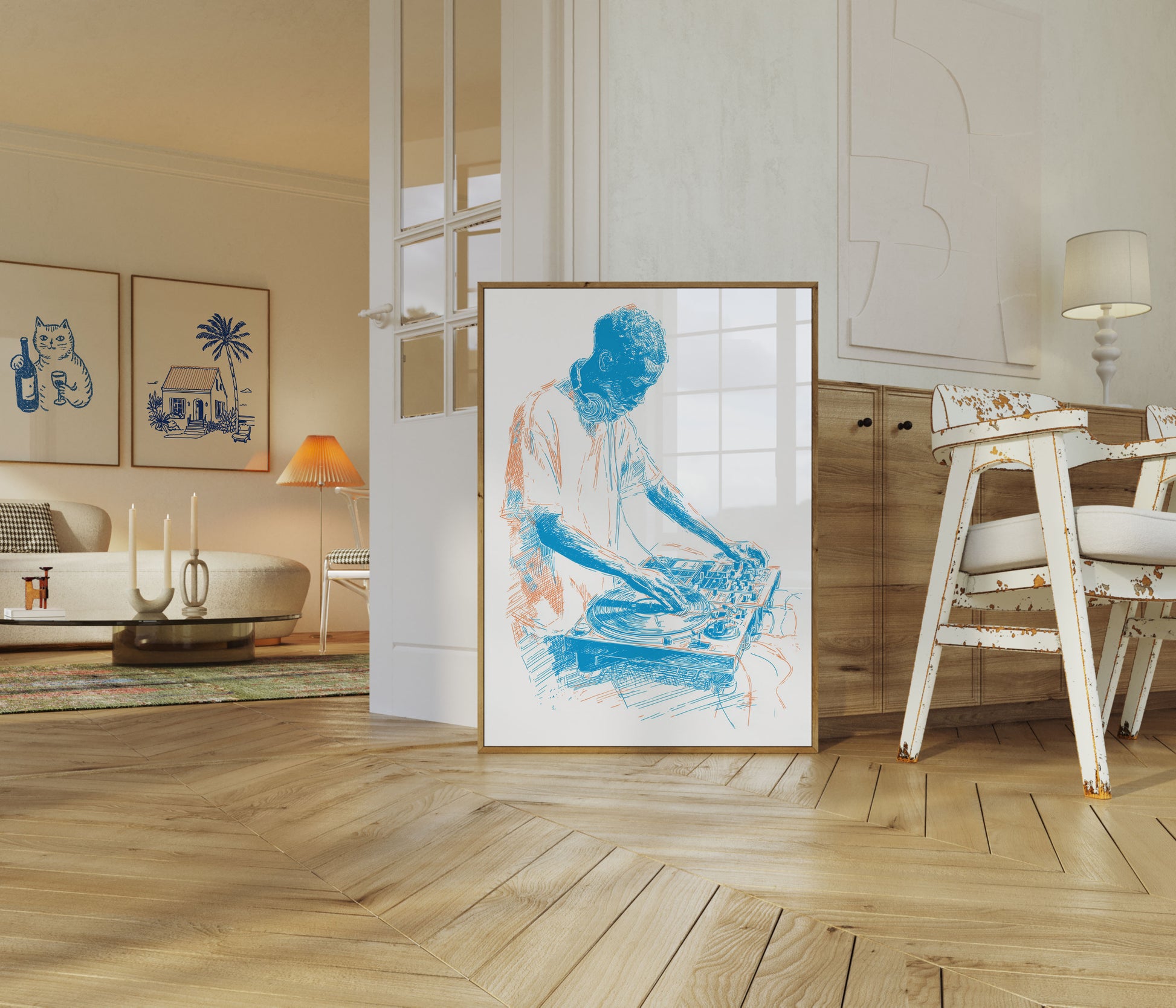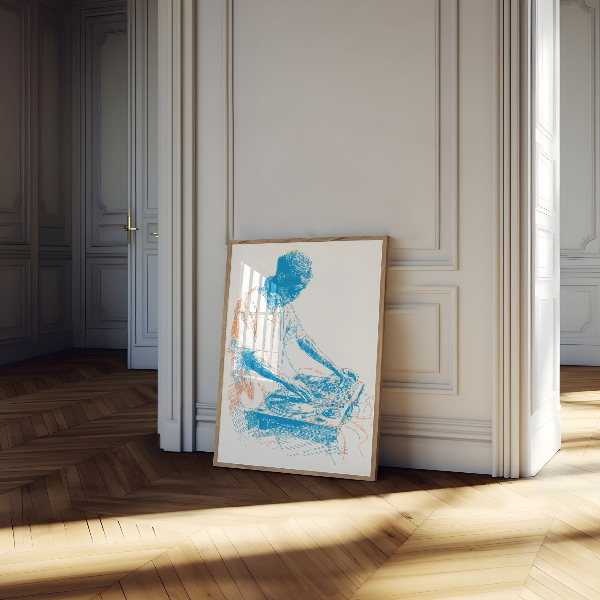 Immerse yourself in the electrifying world of music with this stunning blue and orange sketch of a DJ in action. Captured in dynamic line art, the image reveals the intricate movements of a musician masterfully working turntables, blending creative energy with technical precision. The dual-tone color palette creates a sense of motion and rhythm, bringing the art of spinning records to vibrant life.