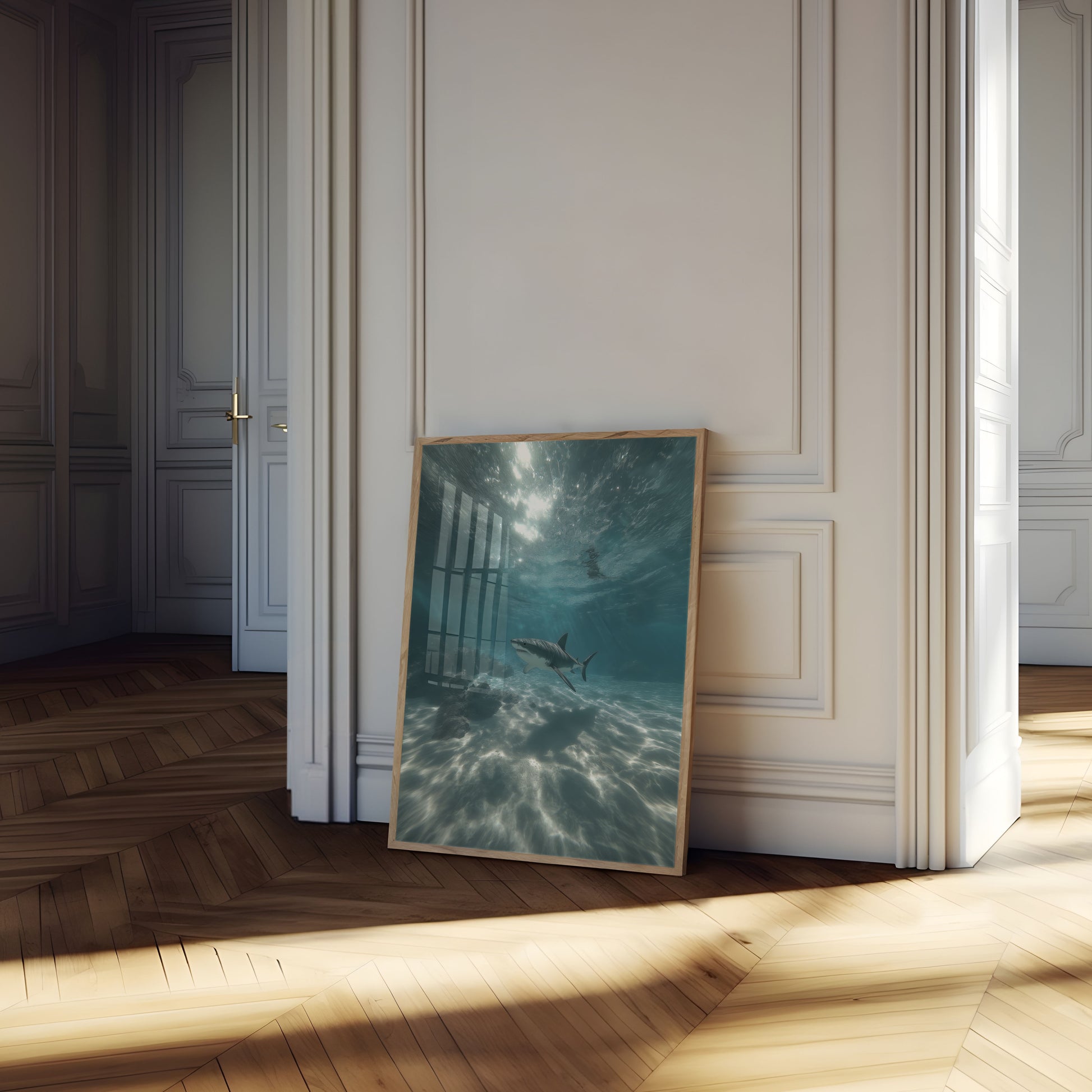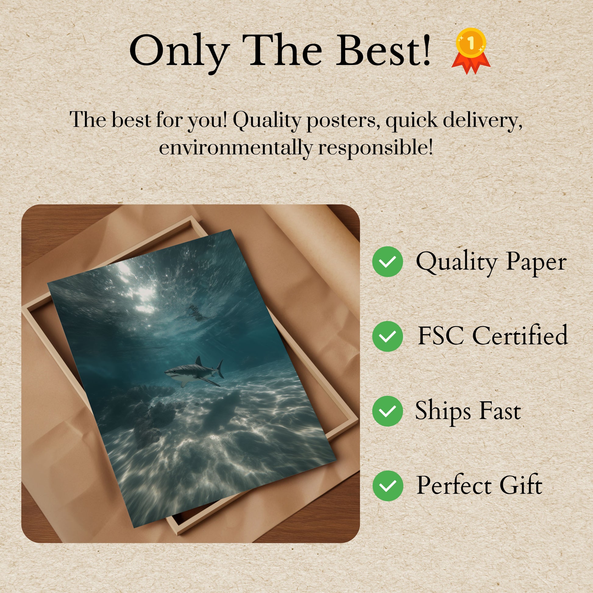 Dive into the mesmerizing depths of the ocean with this stunning shark poster that captures the raw beauty and mysterious allure of marine life. Sunlight filters through the turquoise waters, casting ethereal rays around a sleek shark gliding gracefully above the rocky seafloor. The image is a breathtaking blend of movement, light, and the primal essence of one of nature's most magnificent creatures.
