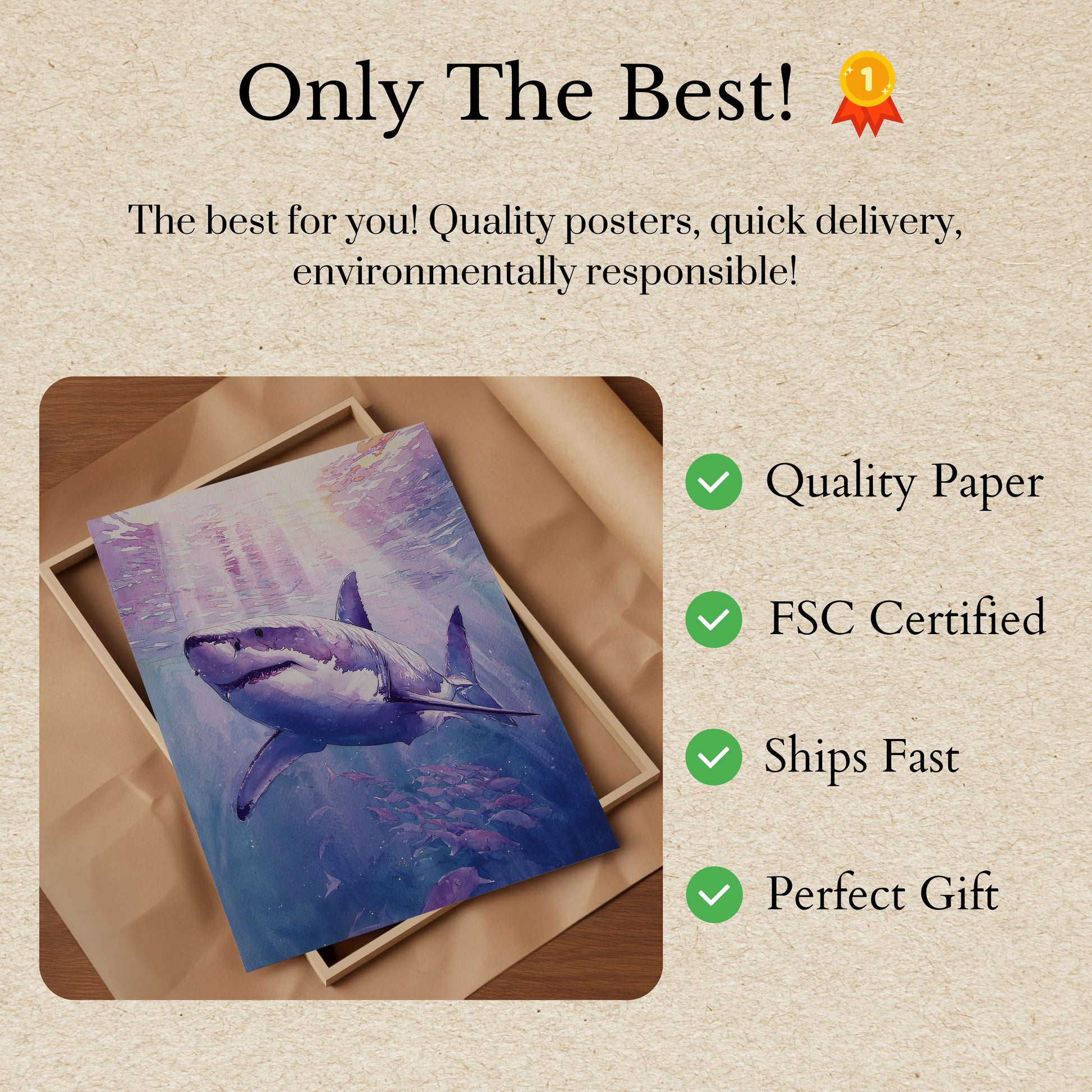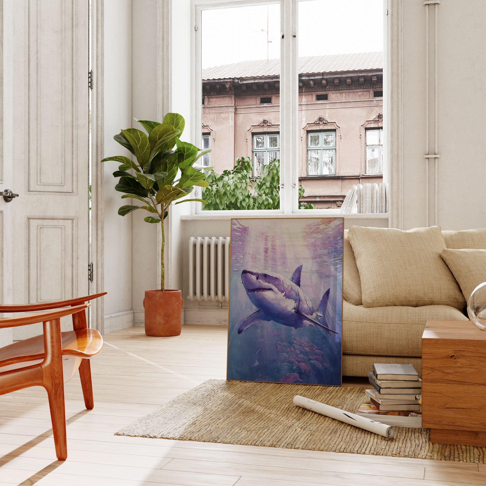 Dive into the mesmerizing world of this stunning watercolor shark artwork, where ethereal purple and blue tones create an otherworldly underwater scene. A powerful great white shark glides through luminous waters, surrounded by a school of smaller fish, capturing the raw beauty and grace of marine life. The soft, dreamlike quality of the painting transforms this apex predator into a breathtaking visual experience that will transport viewers to the mysterious depths of the ocean.
