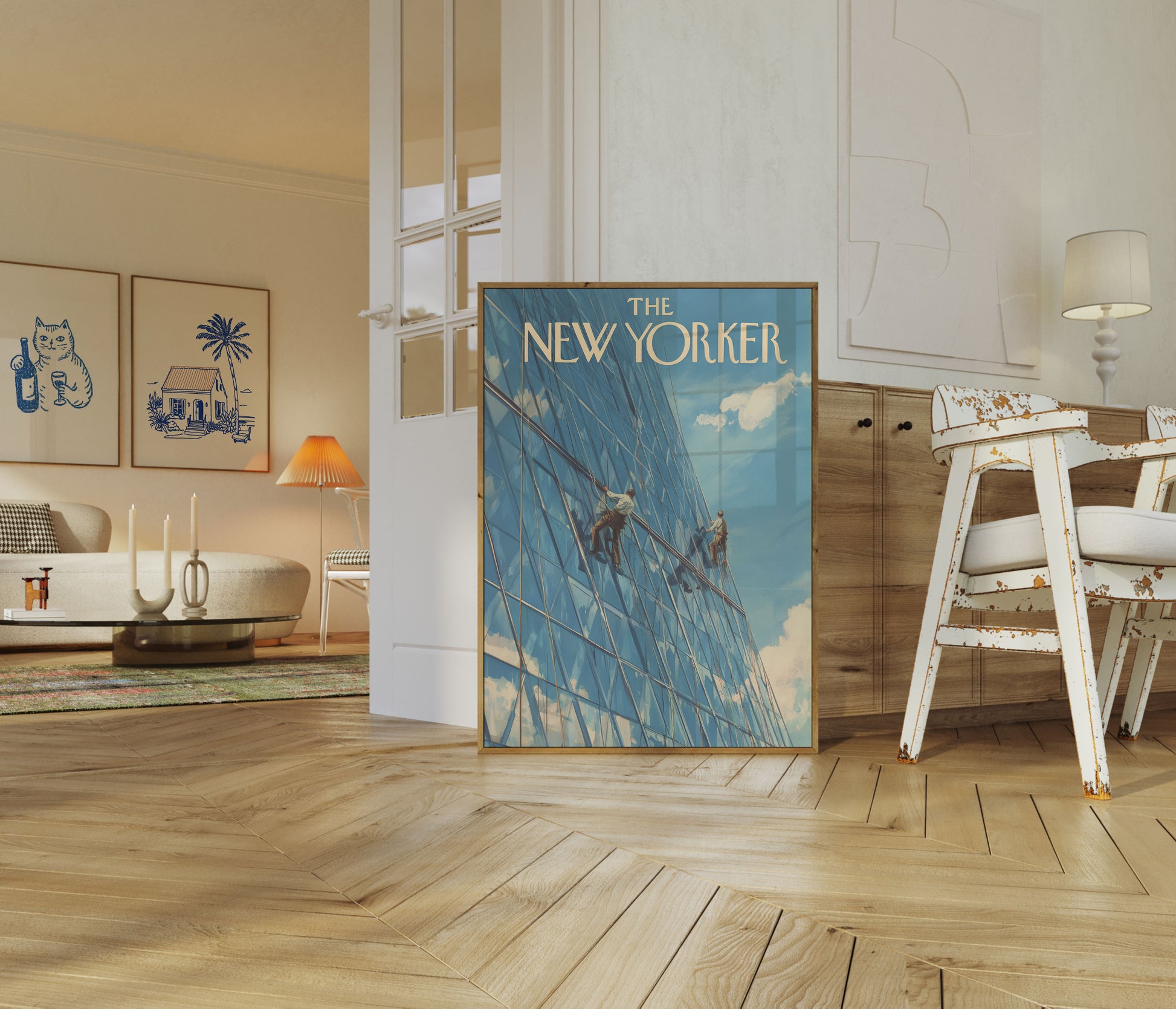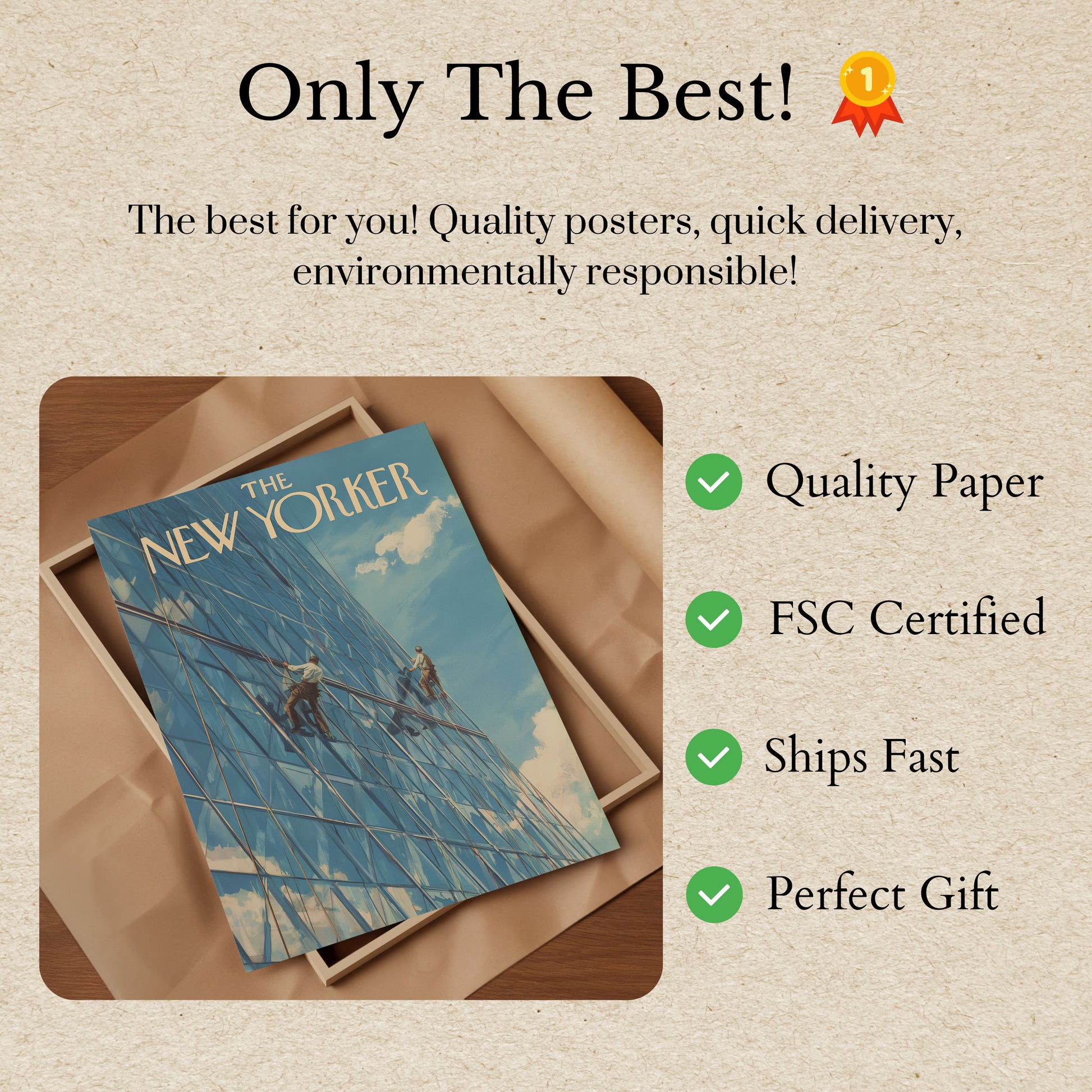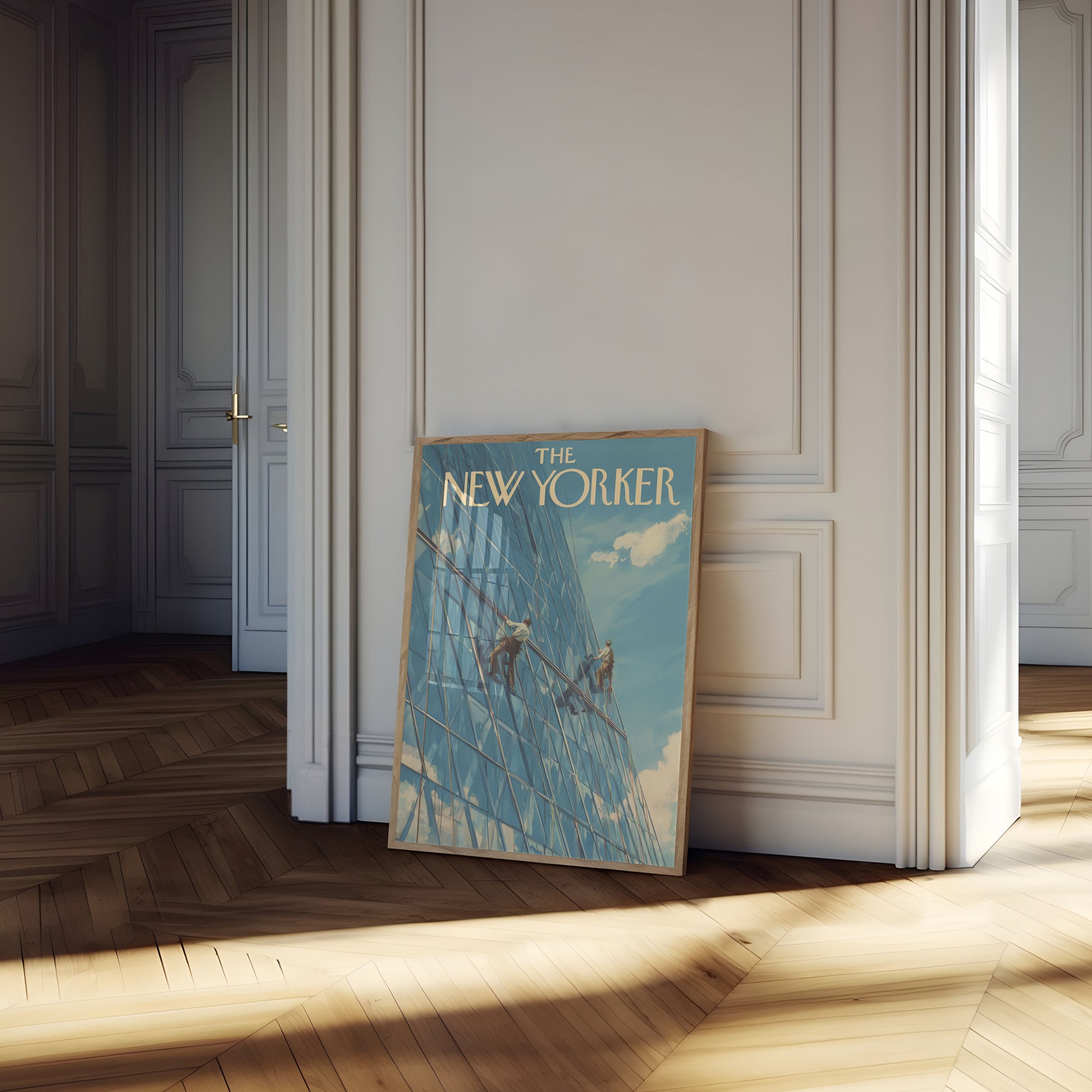 Experience the breathtaking ascent captured in this stunning New Yorker magazine cover illustration. Two workers scale a massive glass skyscraper, silhouetted against a serene blue sky with wispy clouds, creating a powerful metaphor of human ambition and urban exploration. The intricate glass facade and dramatic perspective evoke a sense of challenge, precision, and the extraordinary nature of everyday work.