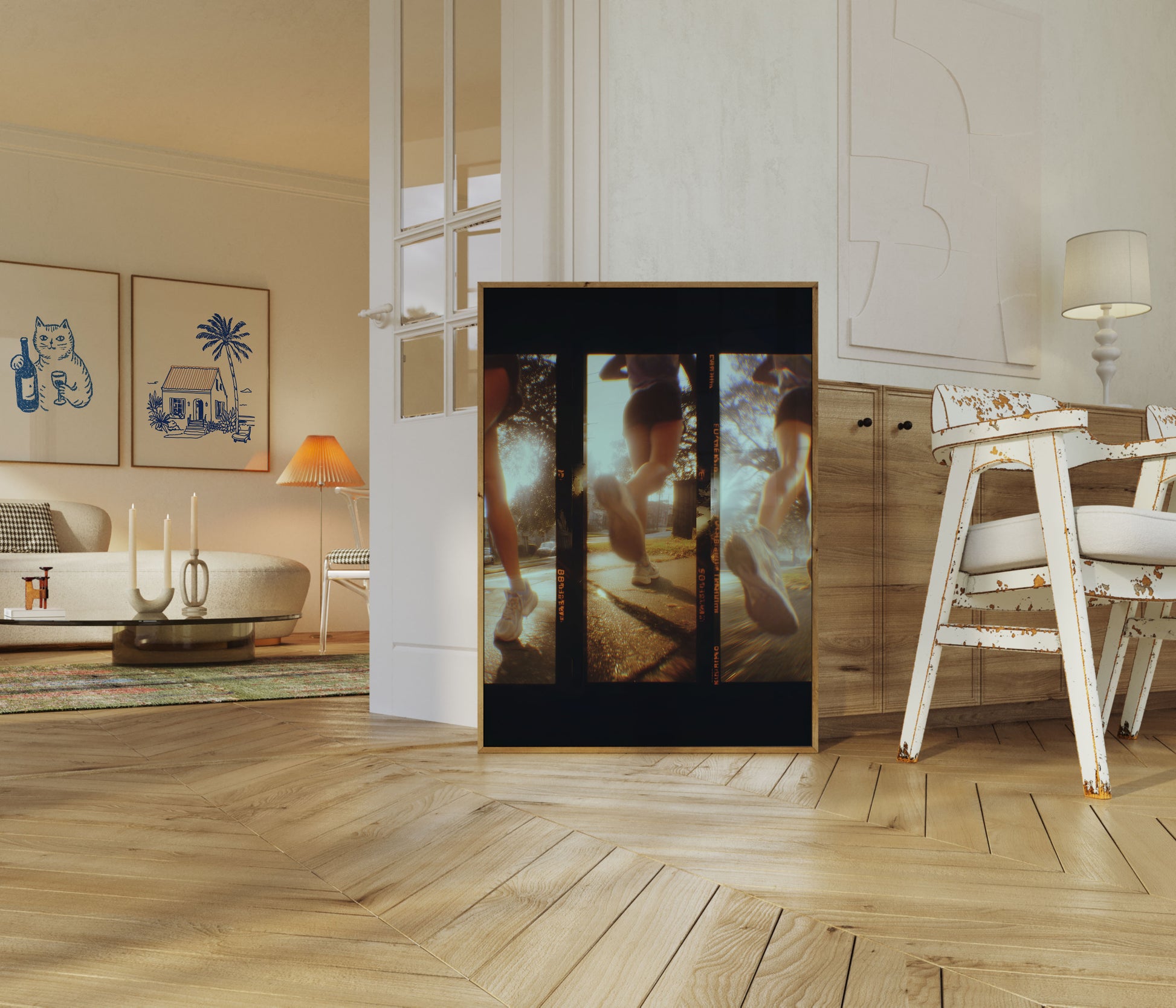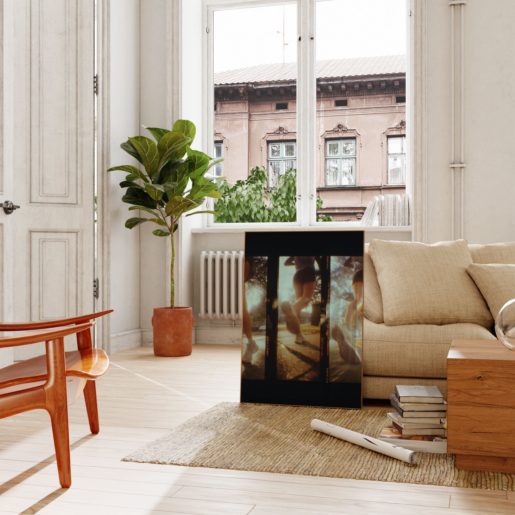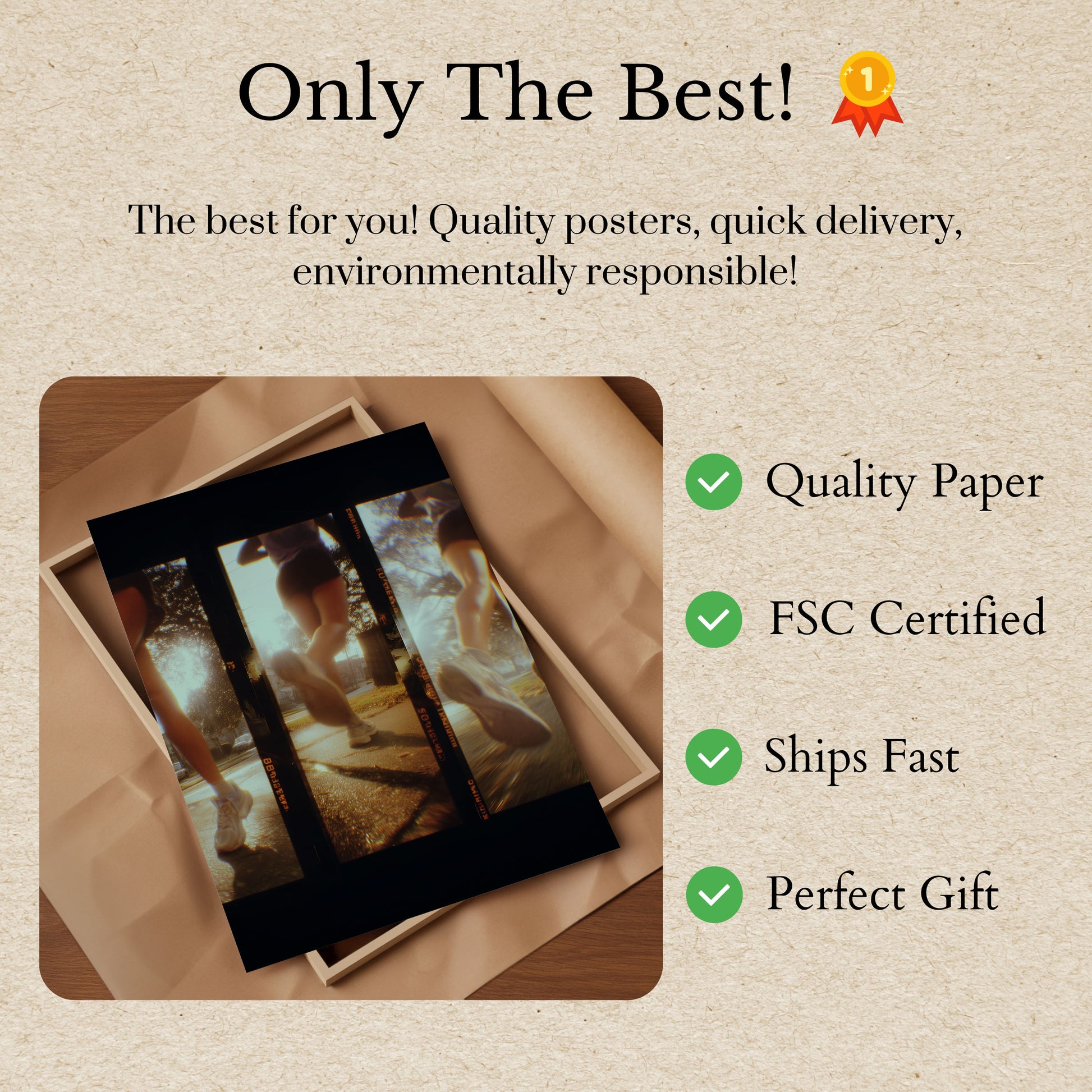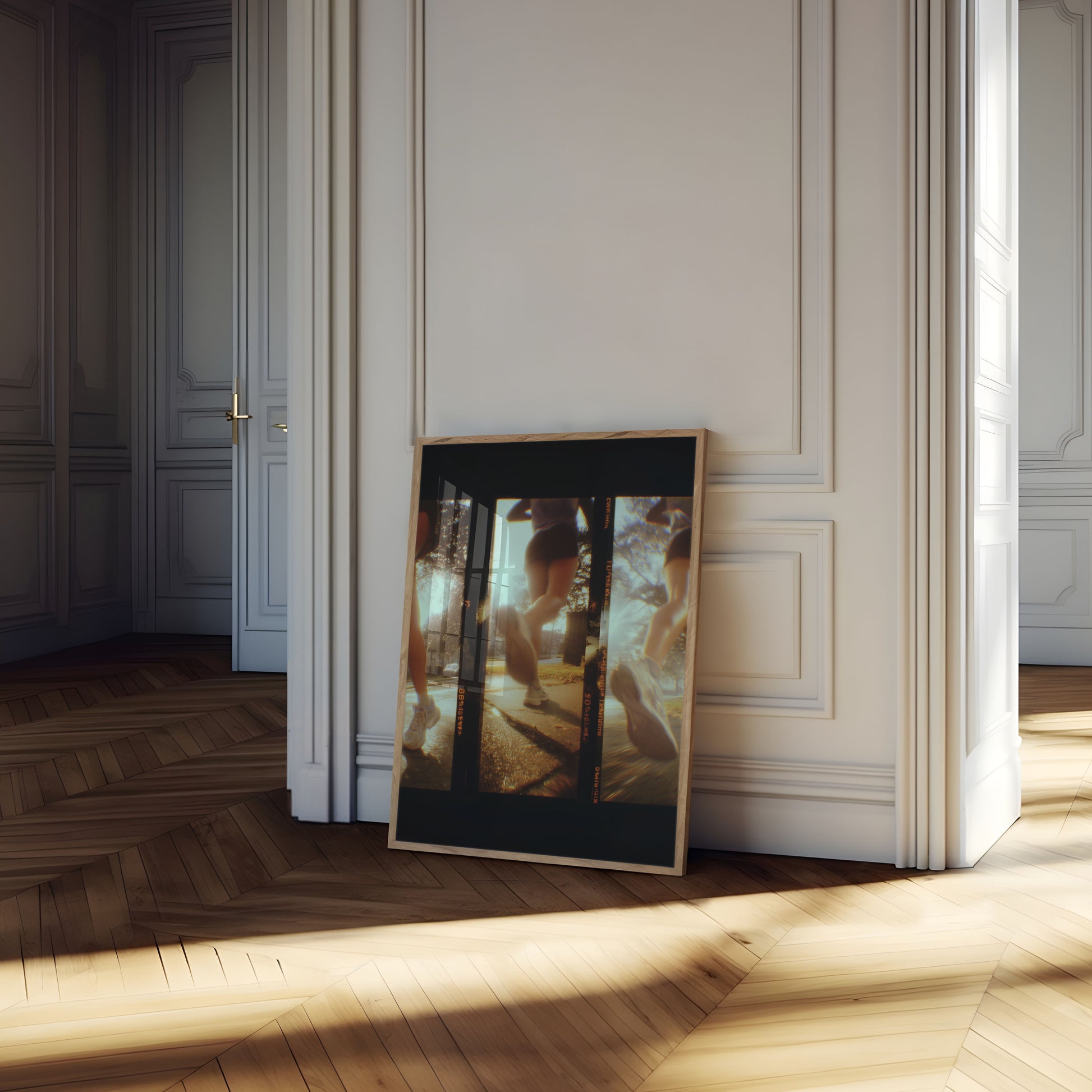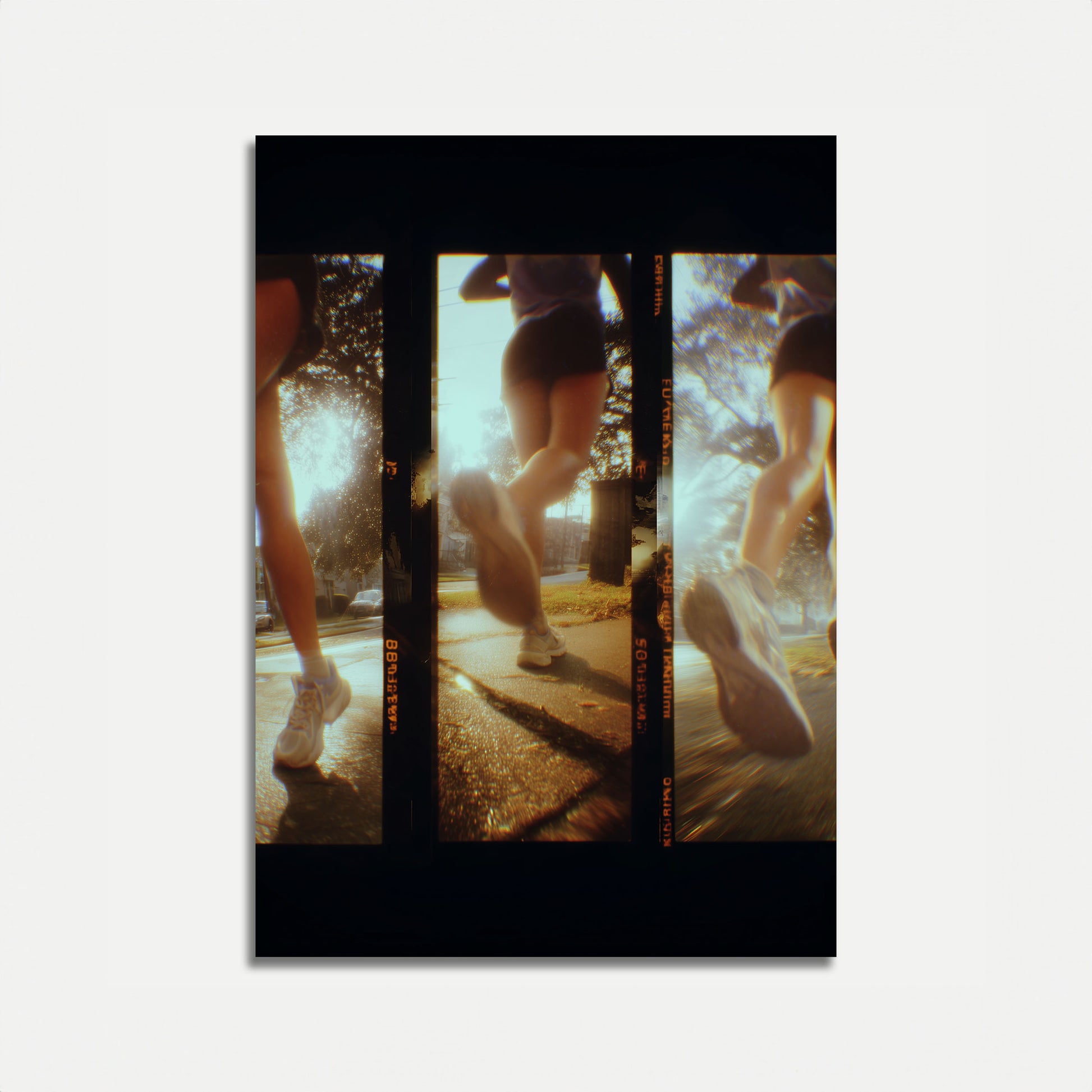 Capture the electric energy of urban running with this dynamic, multi-paneled poster that freezes the intense movement of athletic feet on a sunlit street. The image fragments create a sense of motion and momentum, with golden light and sparkling textures revealing the raw passion of street running. Each frame pulses with kinetic energy, inviting viewers to feel the rhythm and drive of an early morning workout.