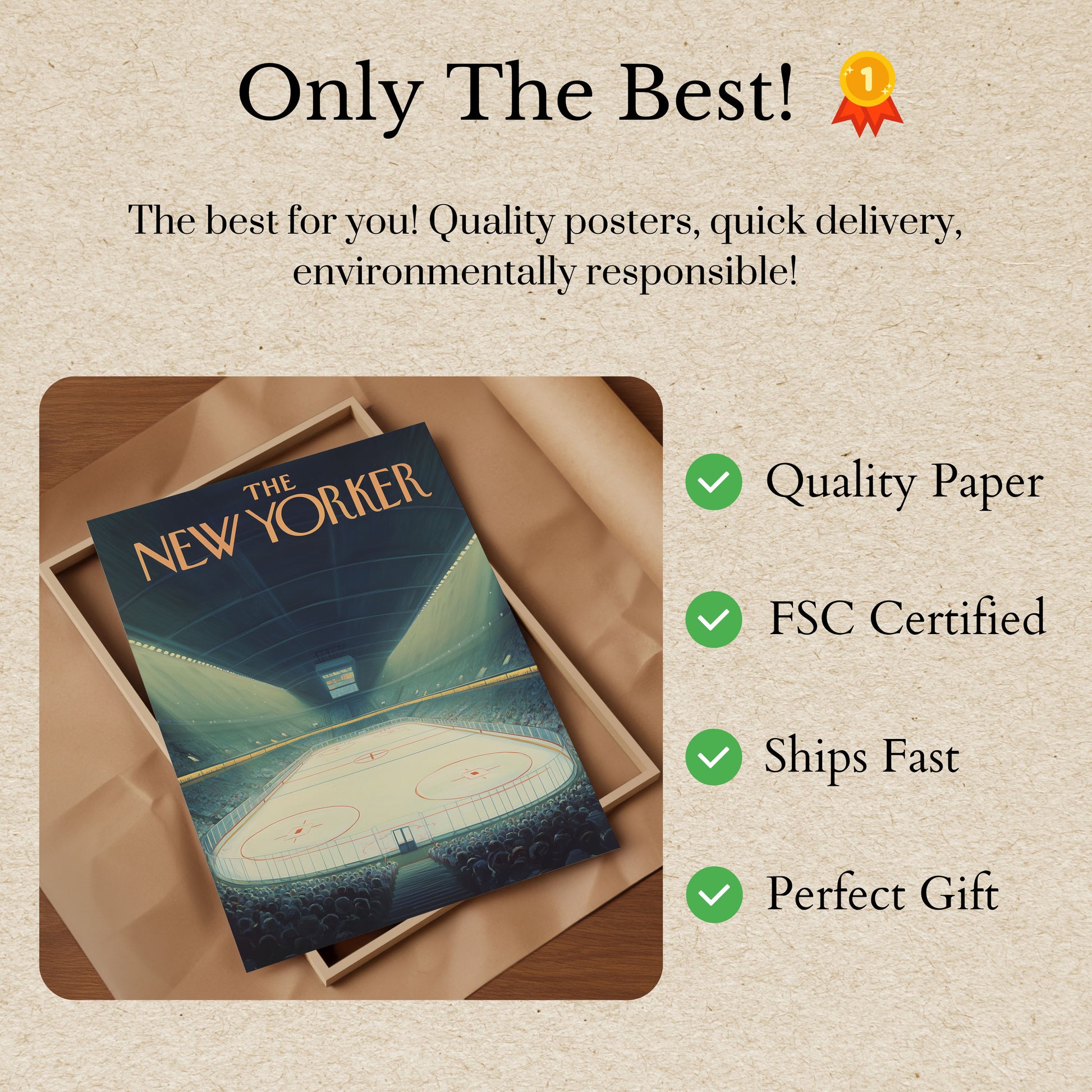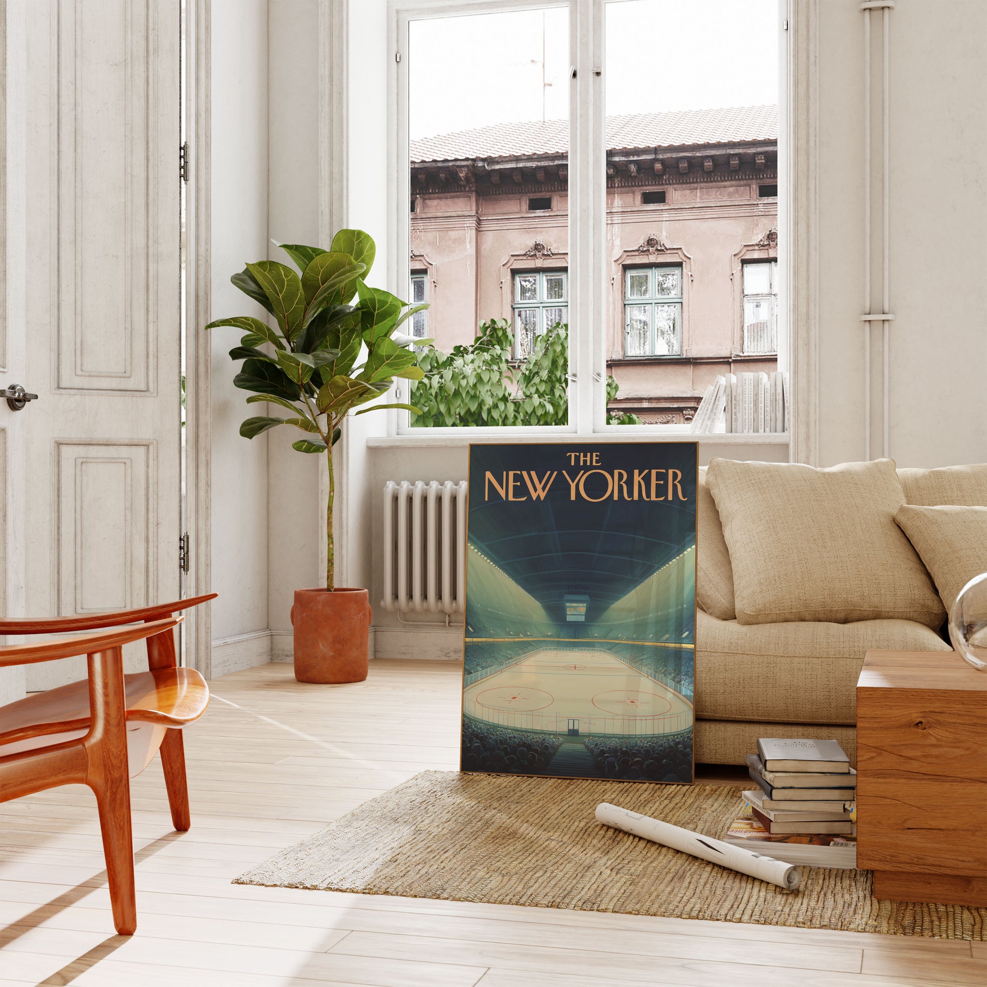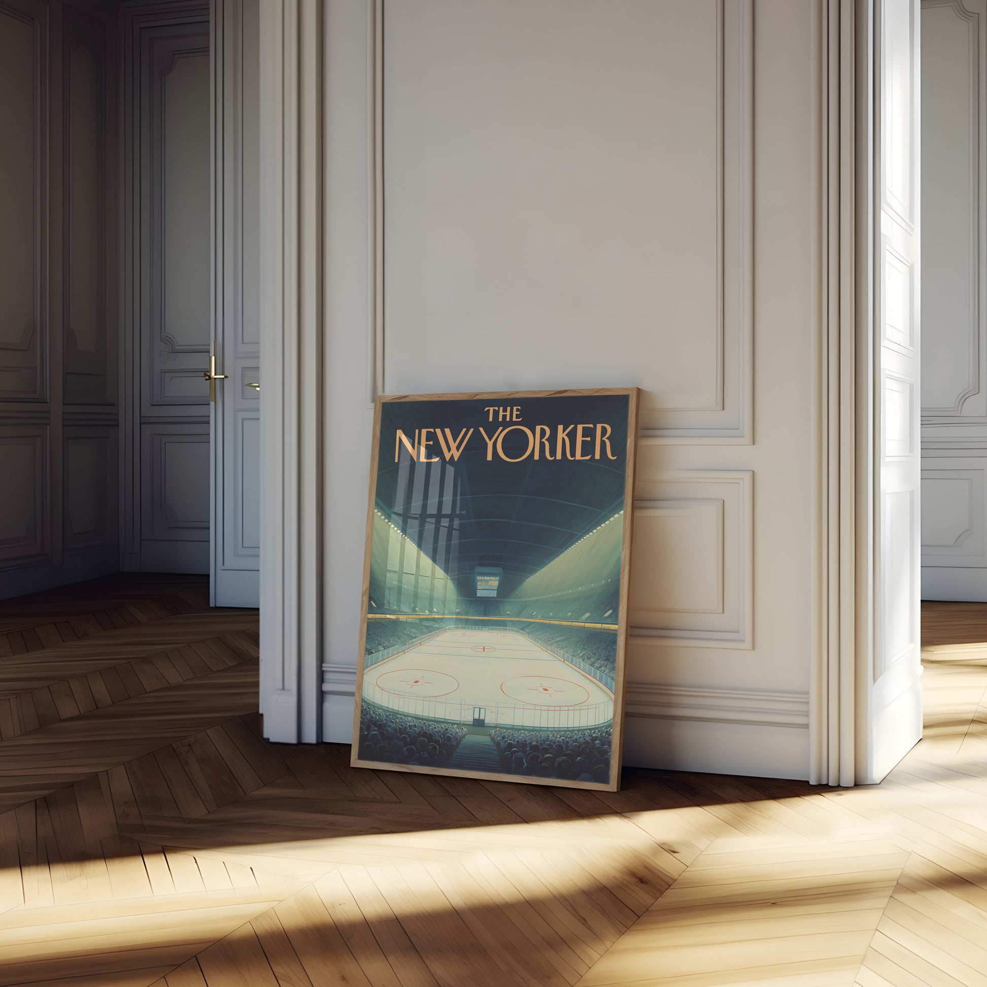Step into the mesmerizing world of a classic hockey stadium with this stunning New Yorker magazine-inspired poster. The artwork captures the breathtaking moment before a game, showcasing a luminous ice rink surrounded by towering stands, bathed in ethereal blue-green lighting that evokes nostalgia and anticipation. Every detail celebrates the architectural grandeur and electric atmosphere of a timeless sporting venue.