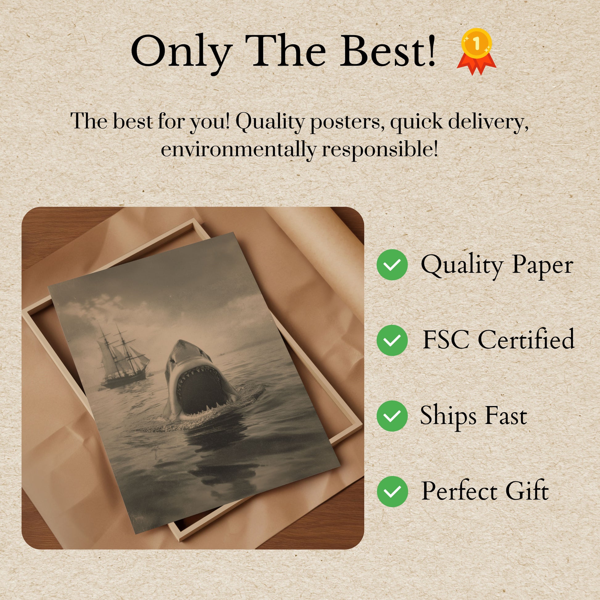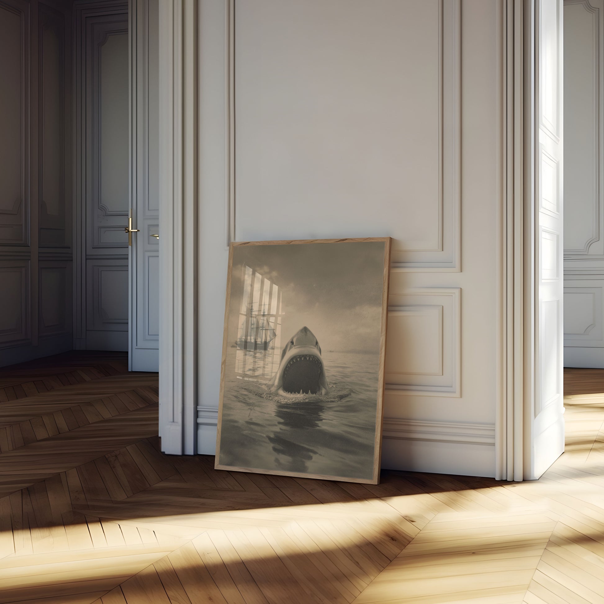 A haunting sepia-toned maritime scene captures a massive shark emerging from misty waters, with a classic sailing ship silhouetted in the distant background. The image evokes a sense of vintage maritime adventure and primal marine tension, blending historical nautical imagery with the raw power of a predatory creature. This atmospheric poster transports viewers to an era of oceanic exploration and untamed maritime mysteries.