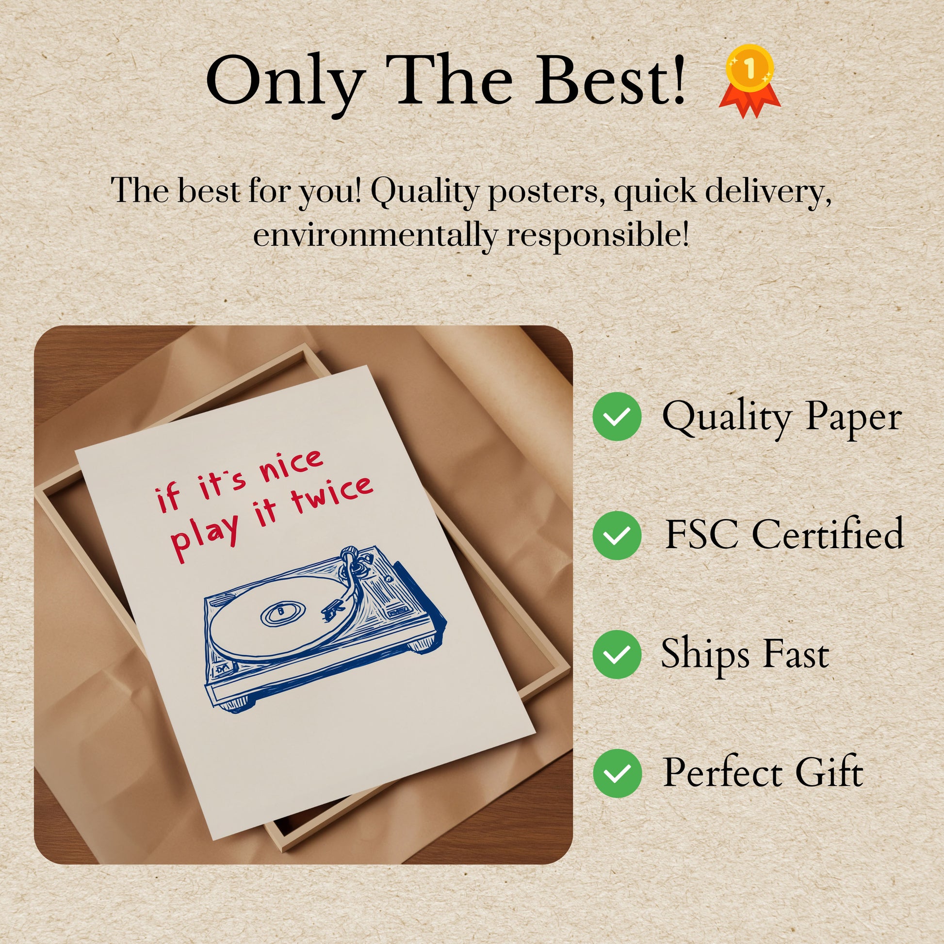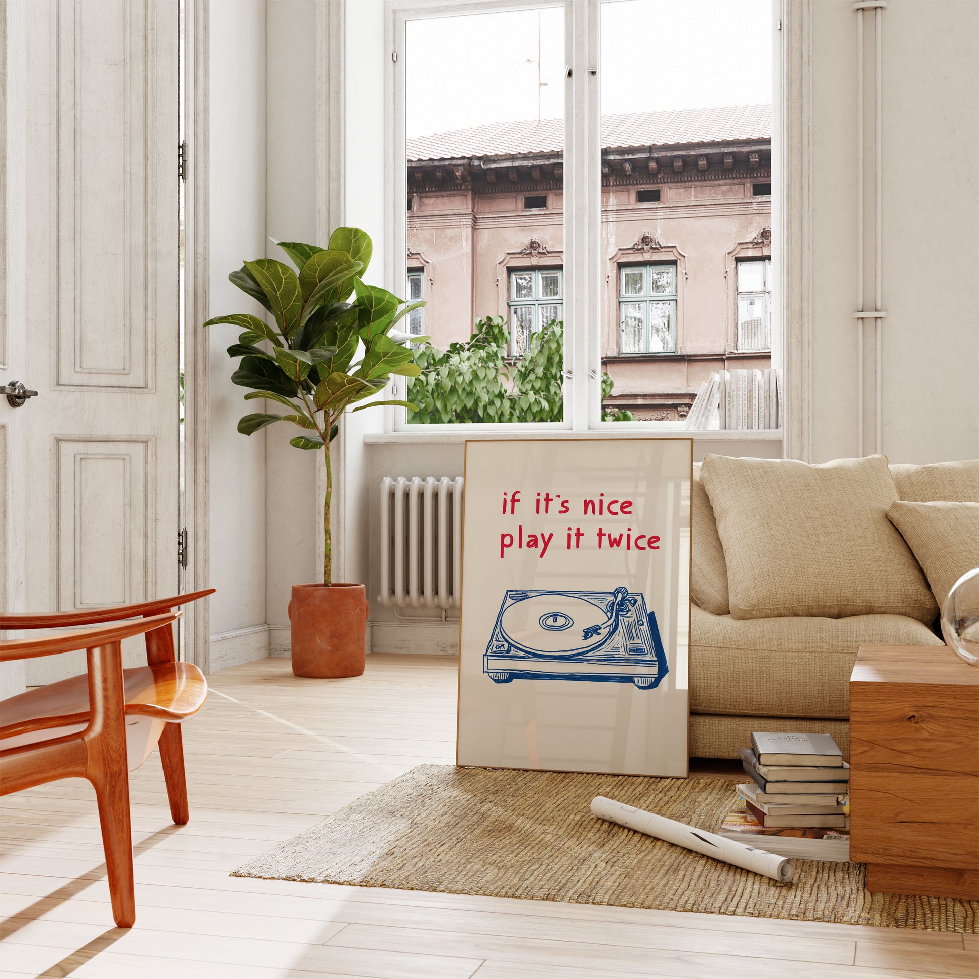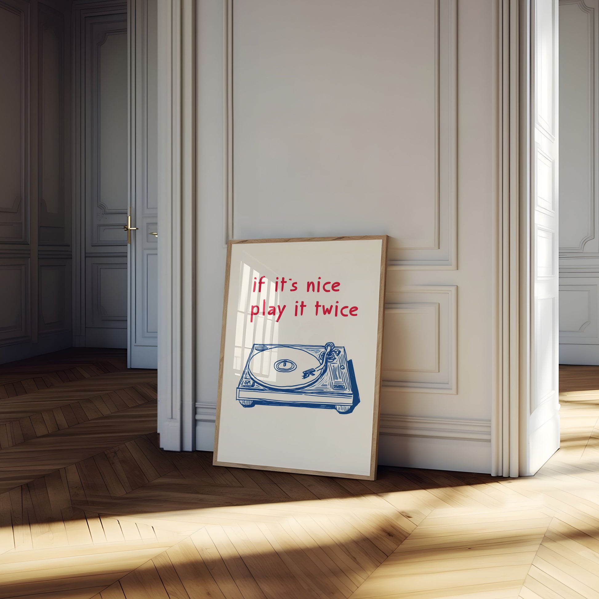 Celebrate the timeless charm of analog music with this striking blue and red illustration of a classic record player. The minimalist design captures the essence of musical nostalgia, featuring a detailed turntable with the playful text "if it's nice play it twice" in vibrant red typography. Perfect for music lovers, vinyl enthusiasts, and those who appreciate retro design aesthetics.