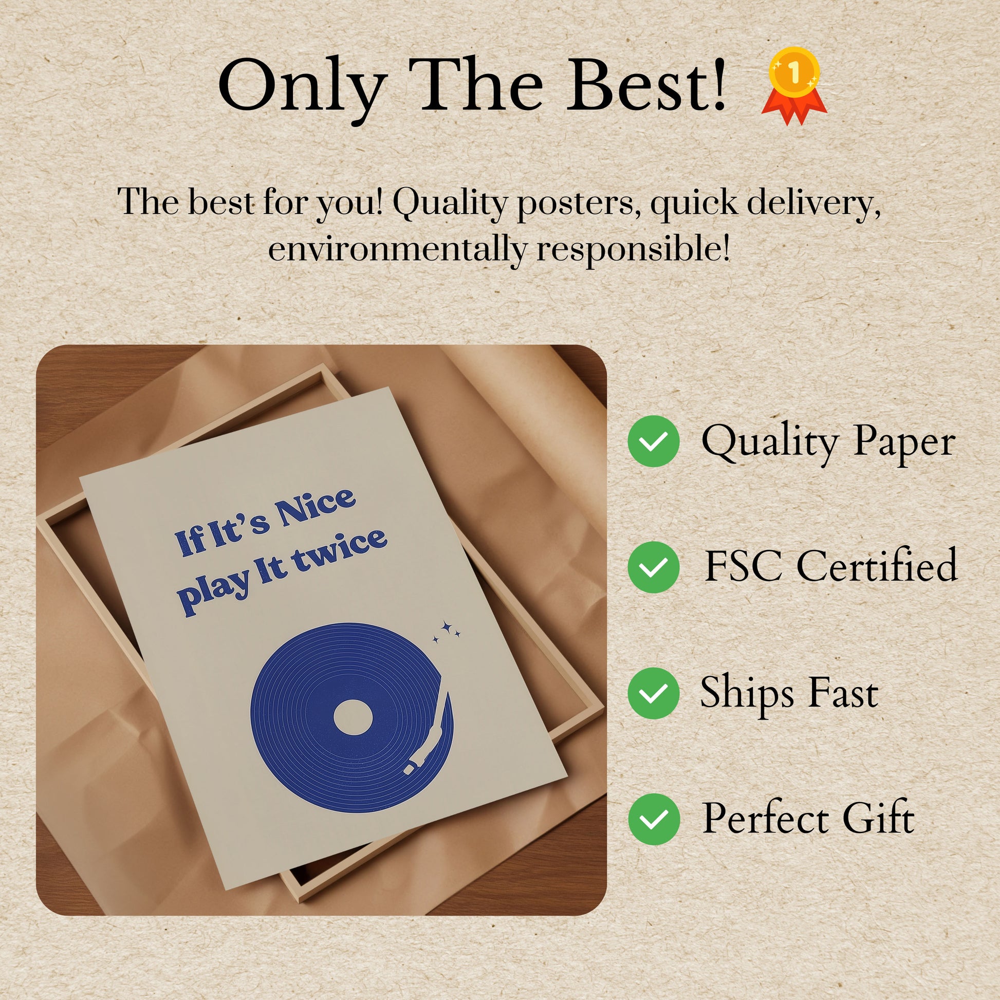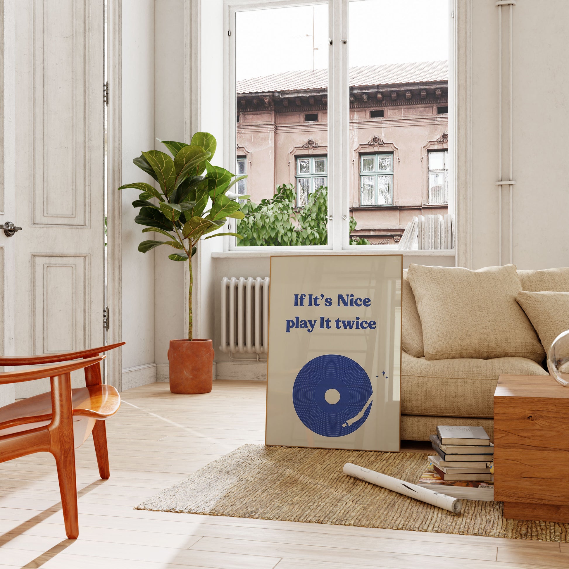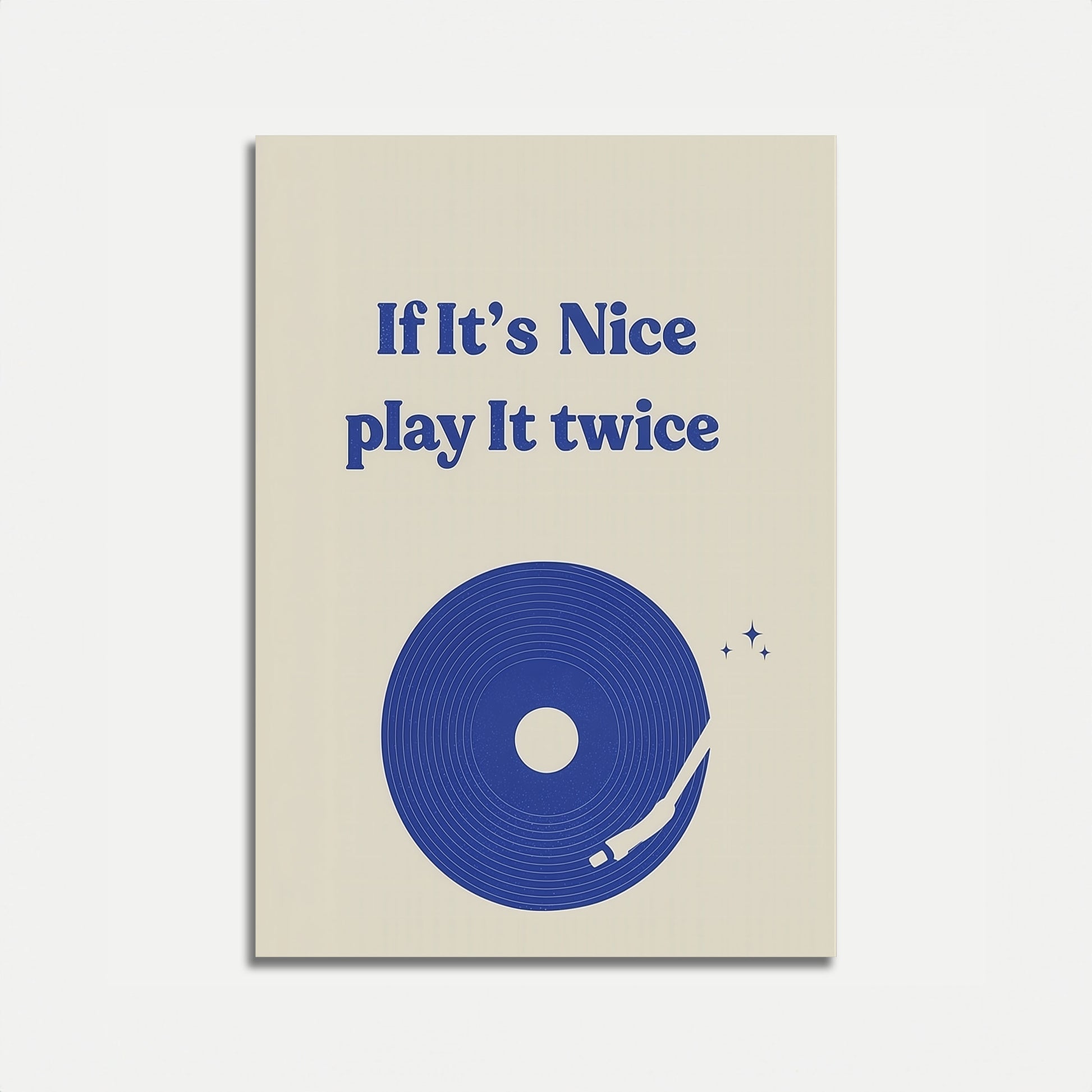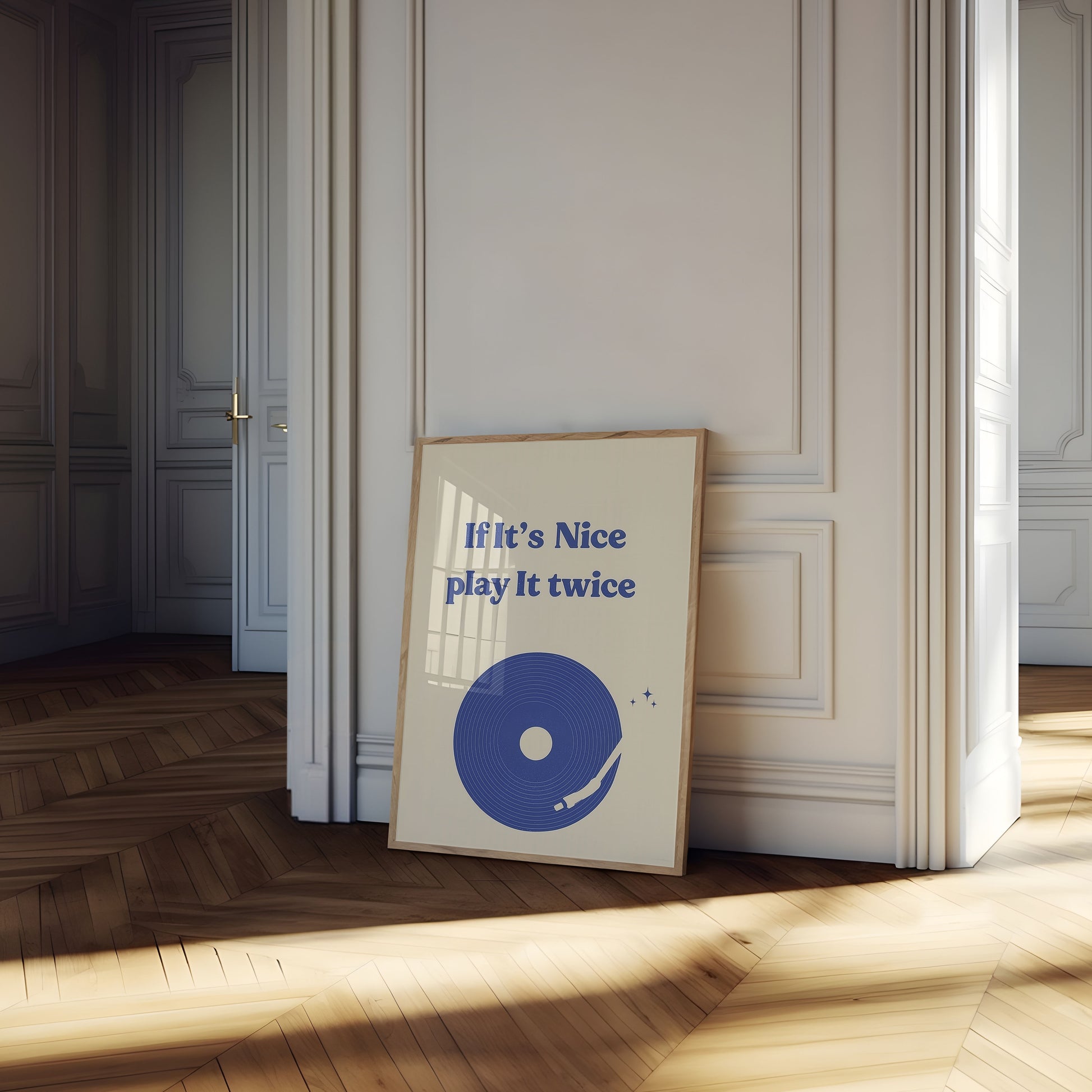 Embrace the nostalgic charm of analog music with this delightful blue and cream poster celebrating the art of listening. Featuring a classic vinyl record and the playful quote 'If It's Nice play It twice', this design captures the pure joy of music appreciation in a minimalist, retro-inspired style. Perfect for music enthusiasts, audiophiles, and those who cherish the warm, authentic sound of vinyl.
