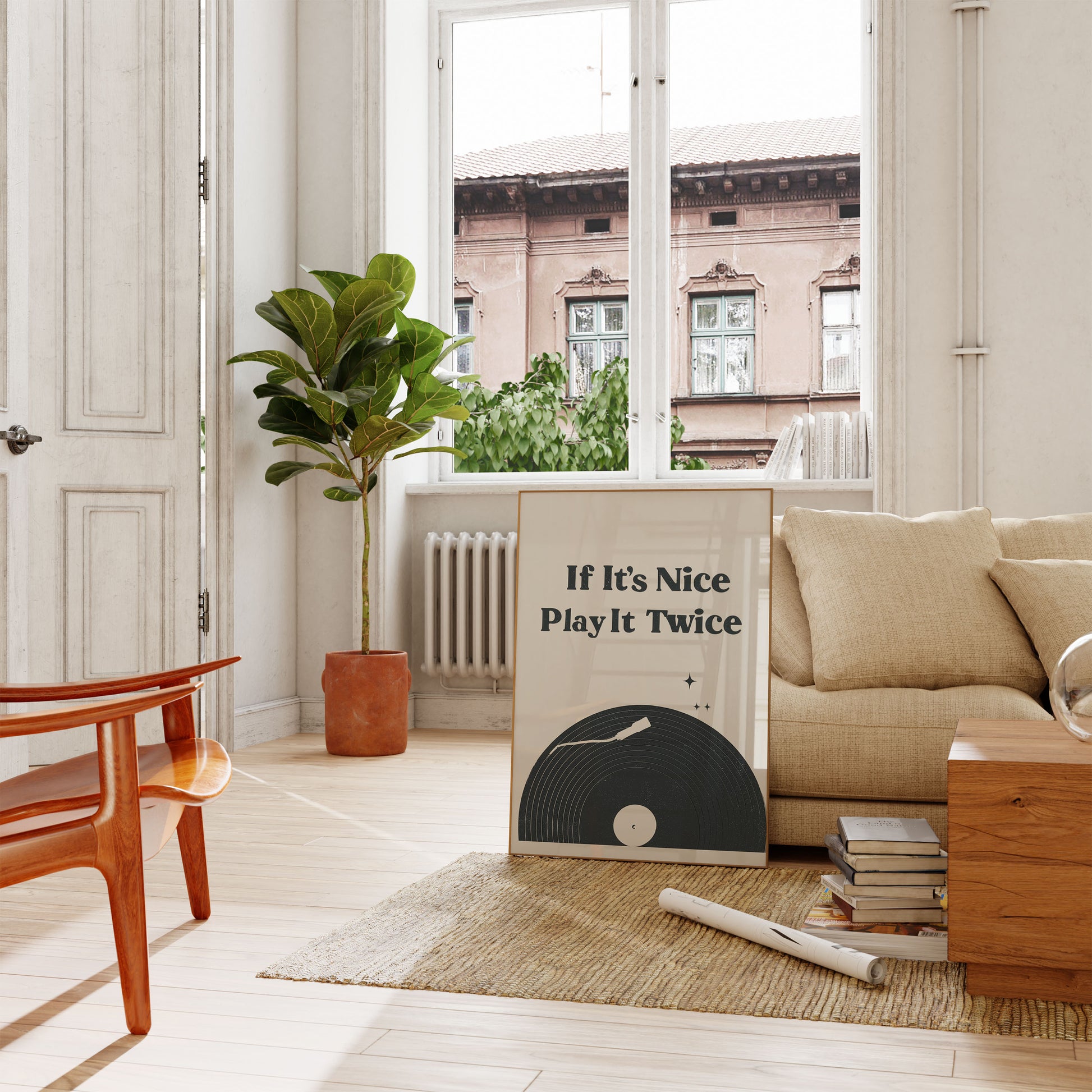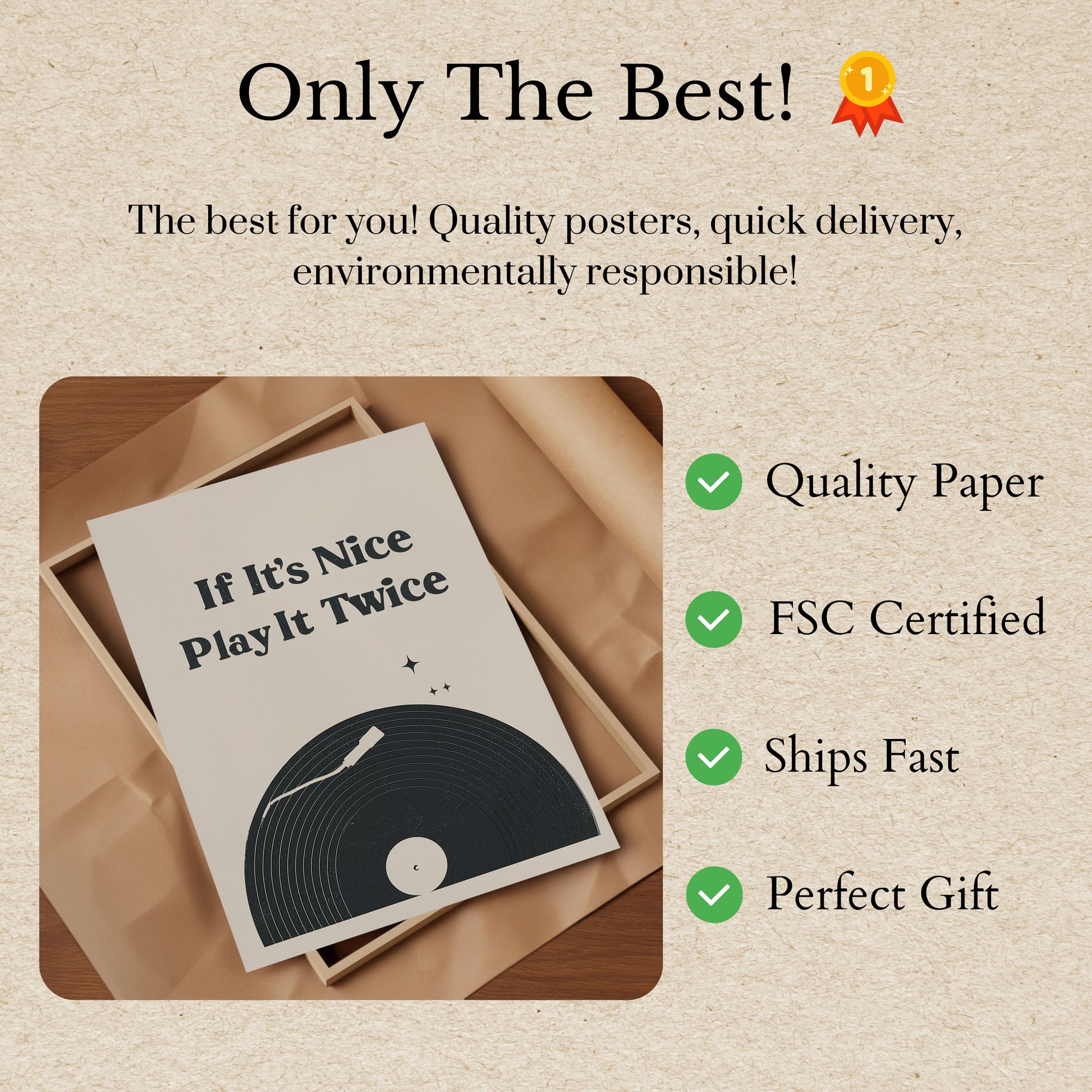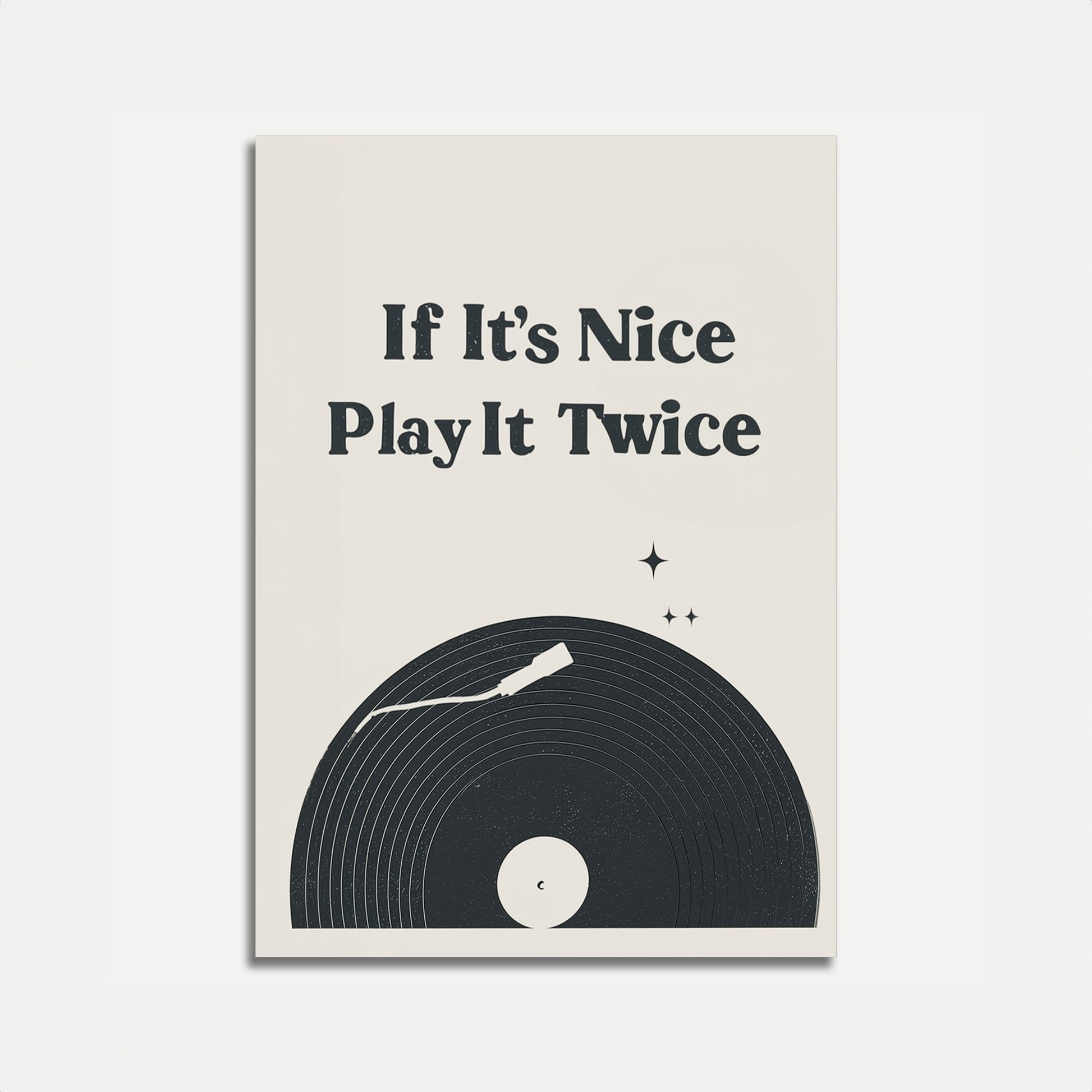 Celebrate the timeless charm of analog music with this minimalist poster featuring a classic vinyl record. The stark black and white design captures the essence of musical nostalgia, inviting viewers to relive the joy of playing their favorite tracks not just once, but twice. Crisp typography and a stylized record illustration create a powerful visual that speaks to music lovers and vintage enthusiasts alike.