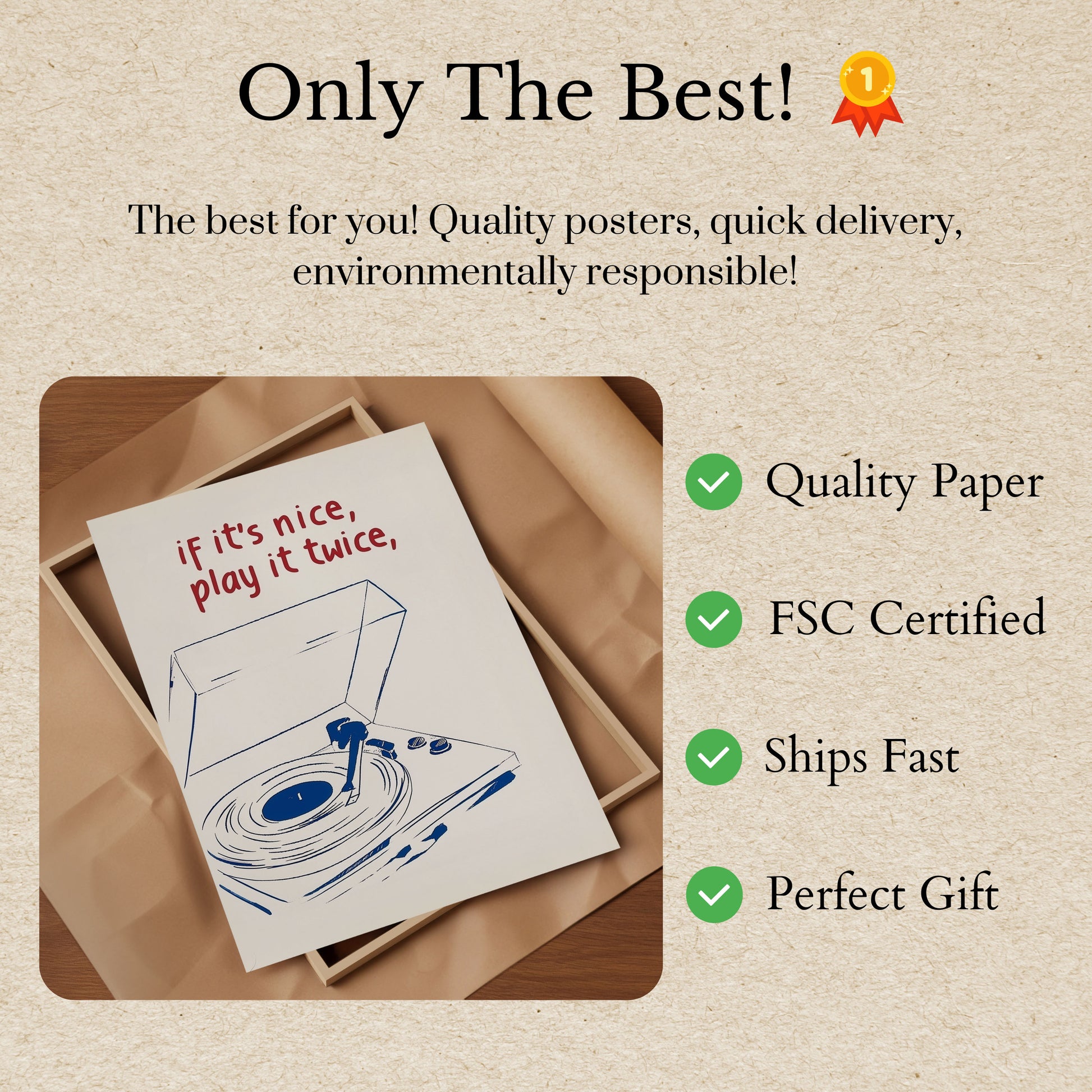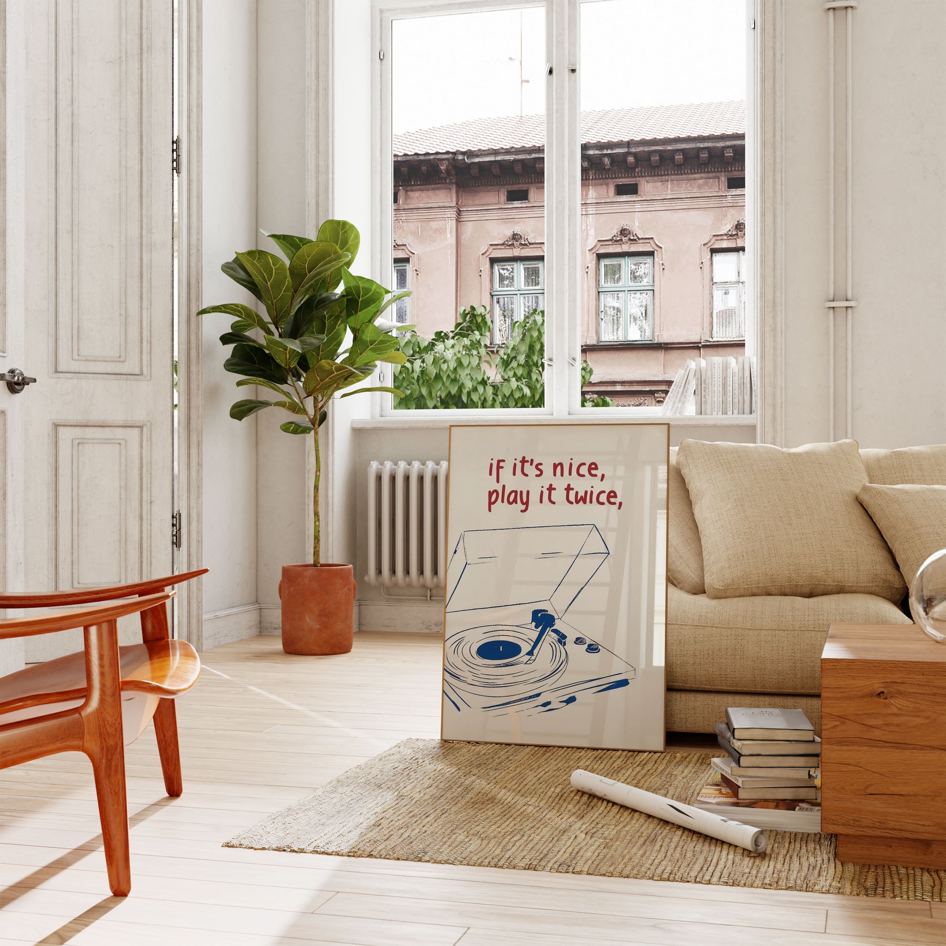 A charming minimalist illustration captures the pure joy of music with a classic turntable design. Rendered in bold red and blue tones, this poster celebrates the timeless philosophy of enjoying good music - if it's nice, play it twice. The simple line art and playful typography create a nostalgic tribute to analog sound and musical passion.