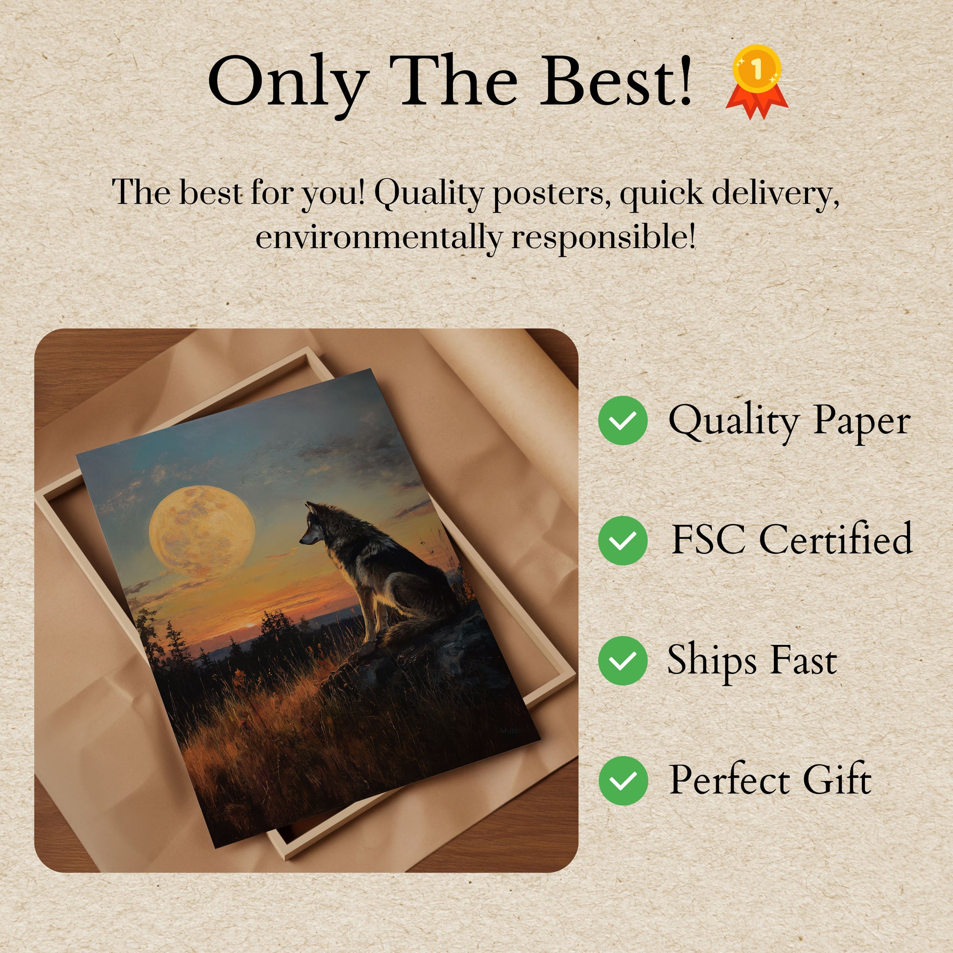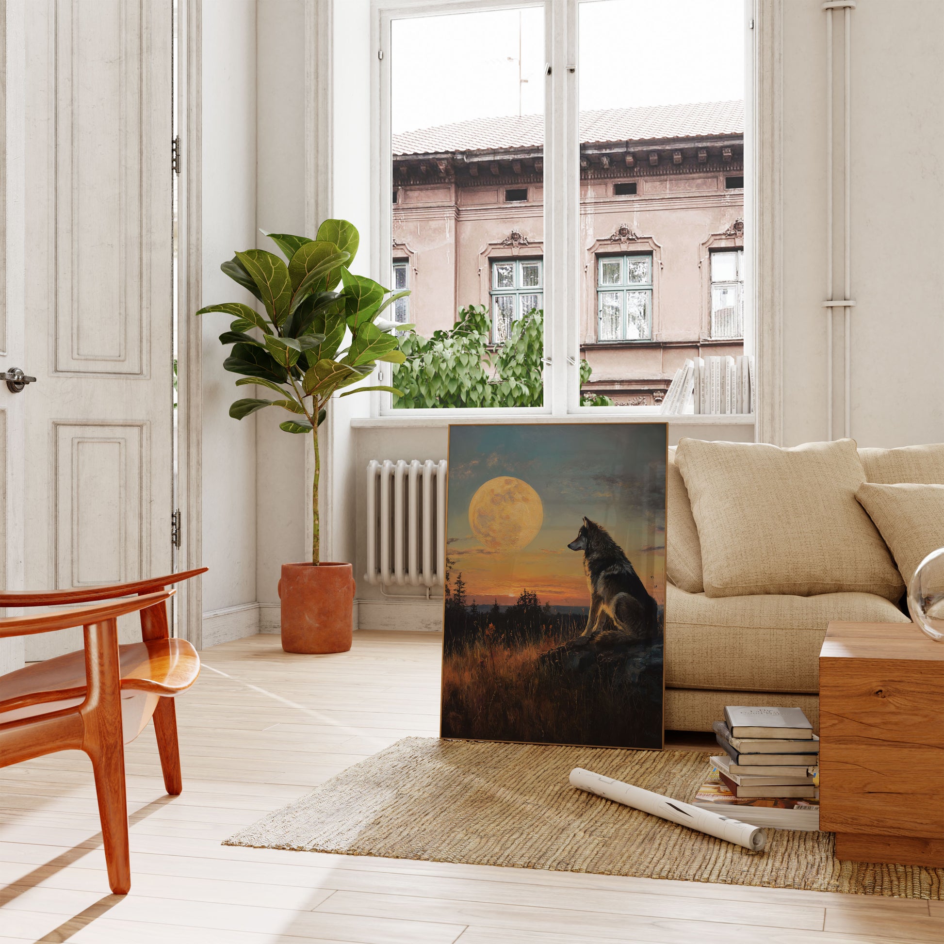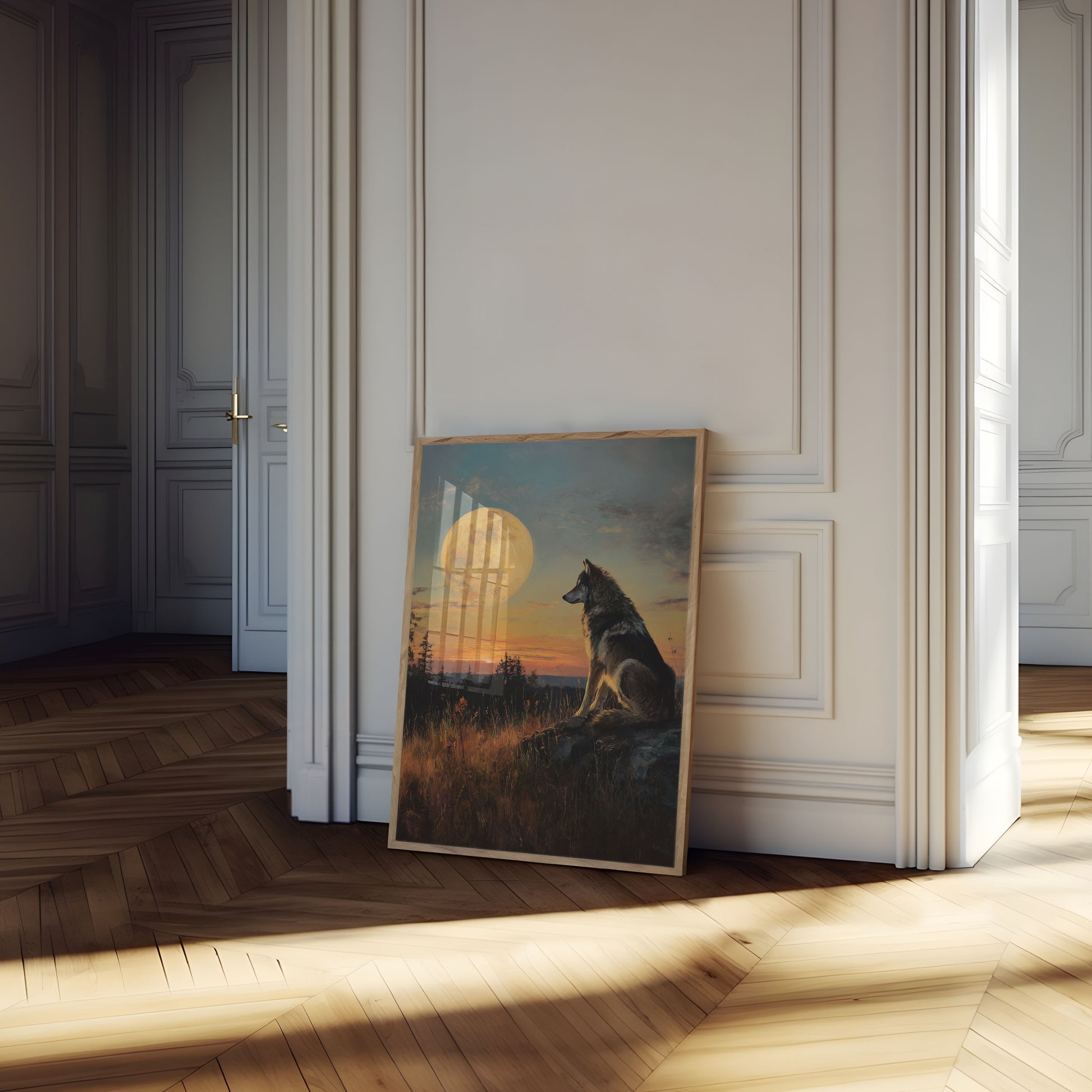 A majestic wolf sits atop a rocky outcrop, silhouetted against a breathtaking golden sunset and massive full moon. The painting captures a moment of serene contemplation, with autumn grasses swaying and distant pine trees framing the dramatic sky. Rich, warm colors and intricate details bring this wild scene to life, inviting viewers into a moment of profound natural beauty and quiet reflection.
