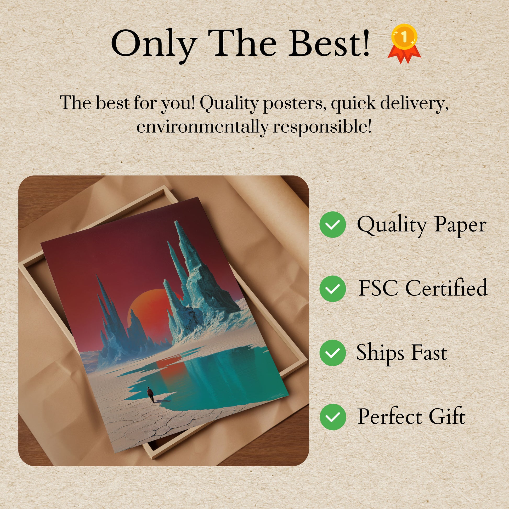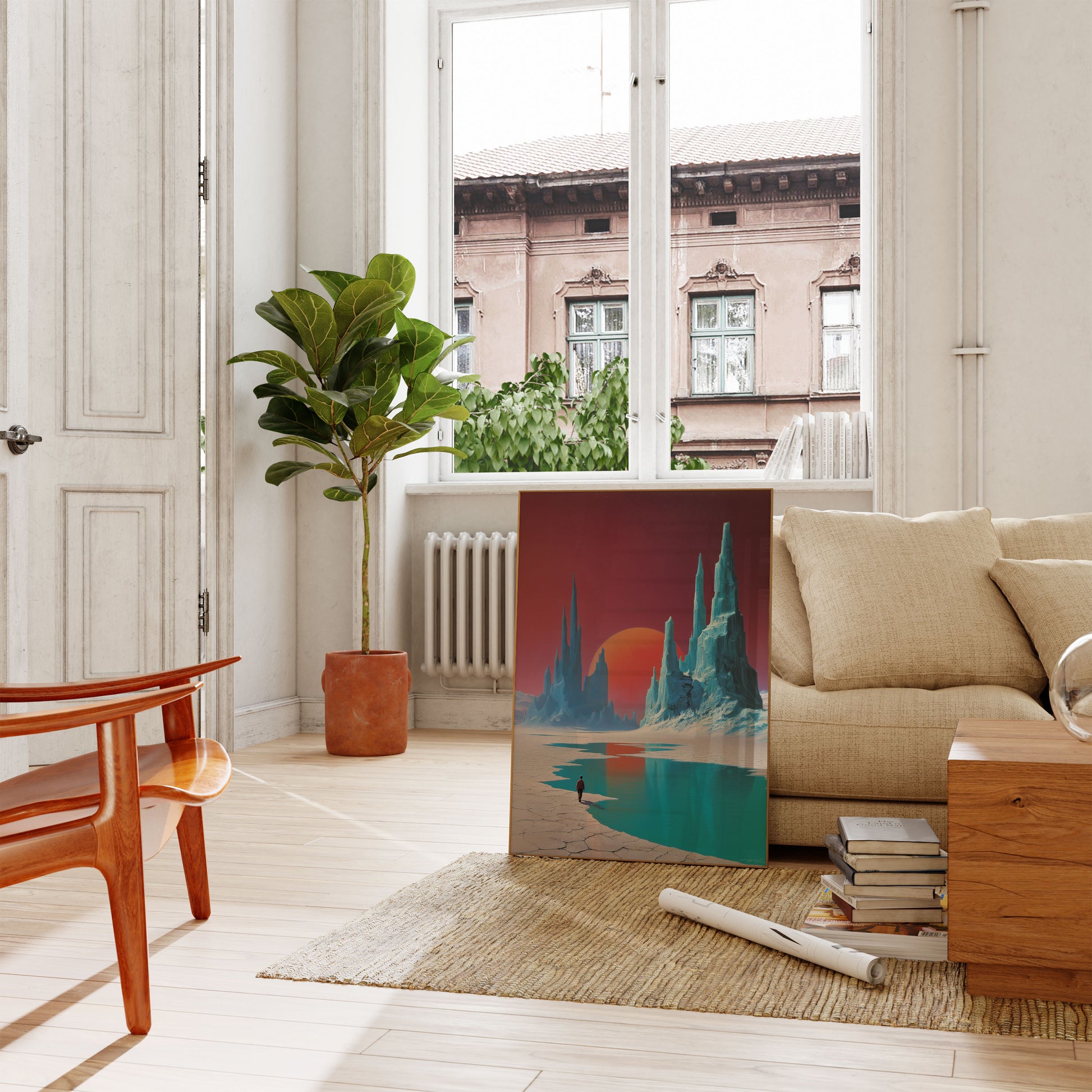 Entrez dans un domaine captivant et étrange avec cette superbe œuvre d'art de paysage de science-fiction. Des structures cristallines imposantes bleu glacé percent un ciel cramoisé dramatique, créant des reflets dans un lagon turquoise qui semble briller d'une lumière surnaturelle. Une silhouette solitaire se tient là, contemplant cette vue extraterrestre, évoquant un sentiment d'émerveillement, d'isolement et d'exploration cosmique qui captive l'imagination de quiconque rêve de mondes lointains et d'horizons impossibles. Le contraste frappant entre le ciel rouge chaud et les tons bleu froid crée une atmosphère surréelle et onirique qui transforme n'importe quel espace en une passerelle vers une autre dimension.