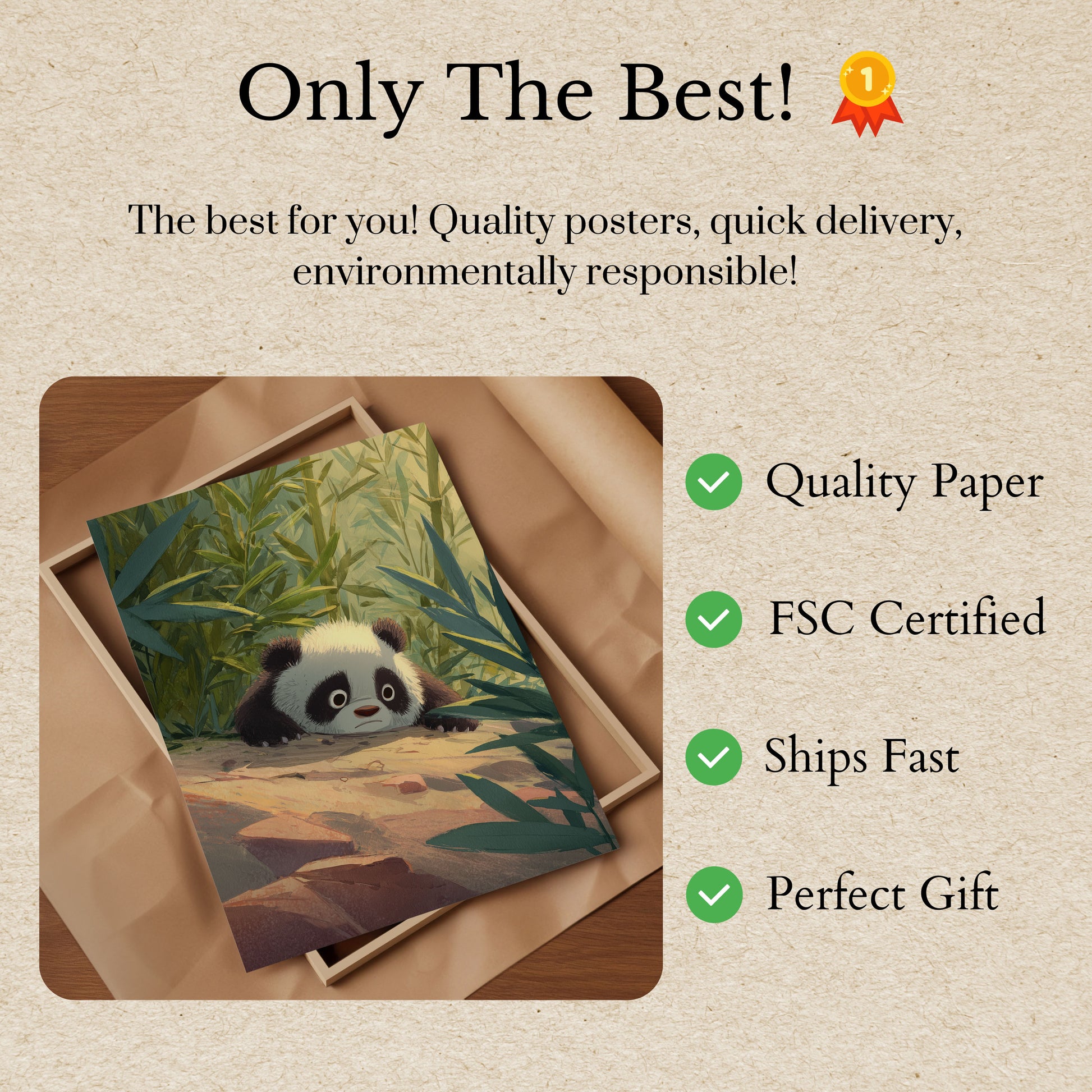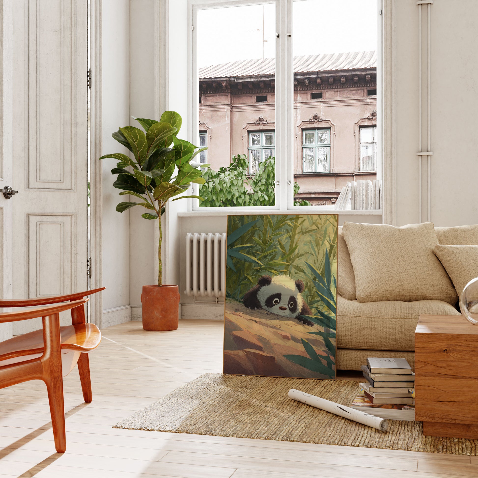 Cette charmante illustration capture un adorable panda qui regarde furtivement derrière une branche tombée, entouré de feuilles de bambou luxuriantes et de paysages forestiers naturels. La palette de couleurs douce et chaleureuse combine des verts délicats et des jaunes dorés avec les marques distinctives noires et blanches du panda, créant une atmosphère calme et accueillante. L'expression expressive et aux yeux écarquillés du panda curieux apporte de la personnalité et de la chaleur à n'importe quel espace, ce qui la rend parfaite pour les amoureux de la faune et ceux qui recherchent une touche de nature douce dans leur maison.