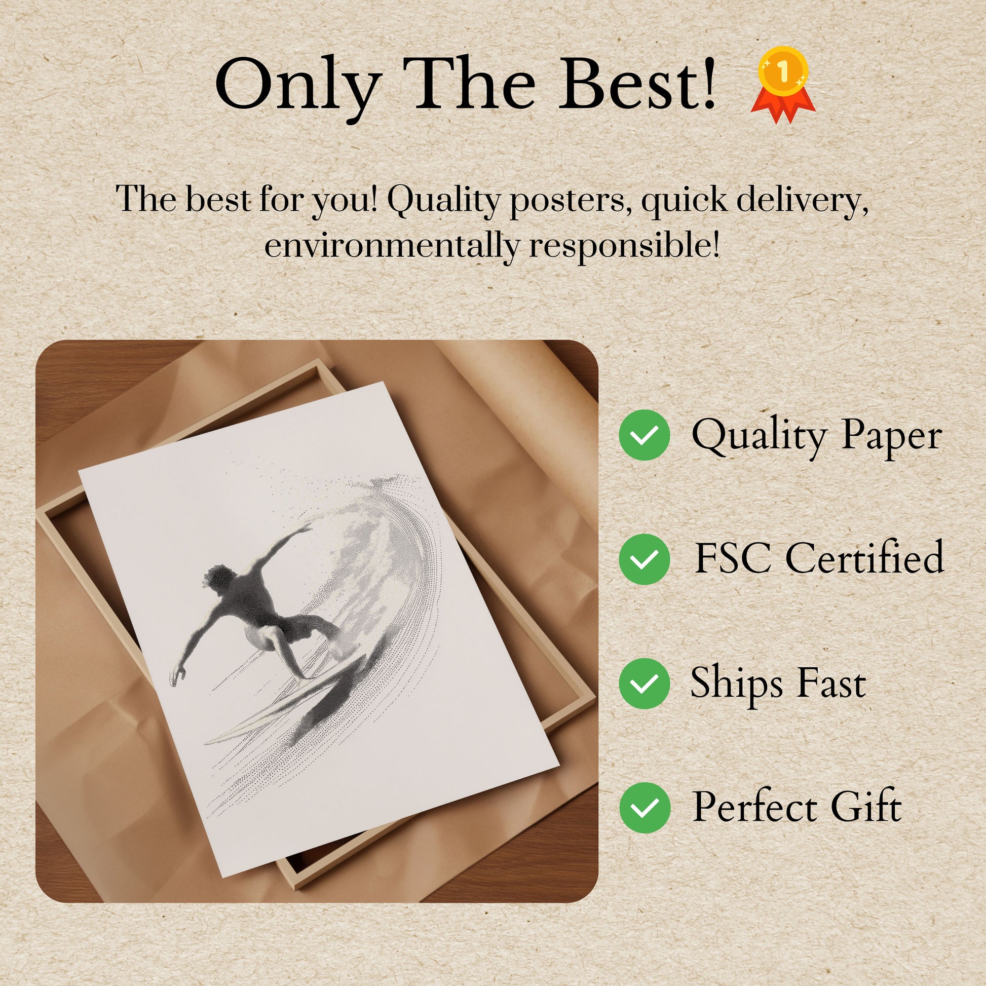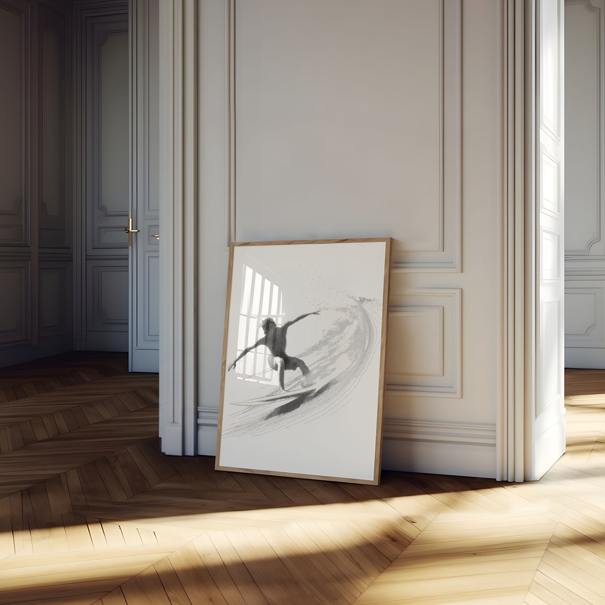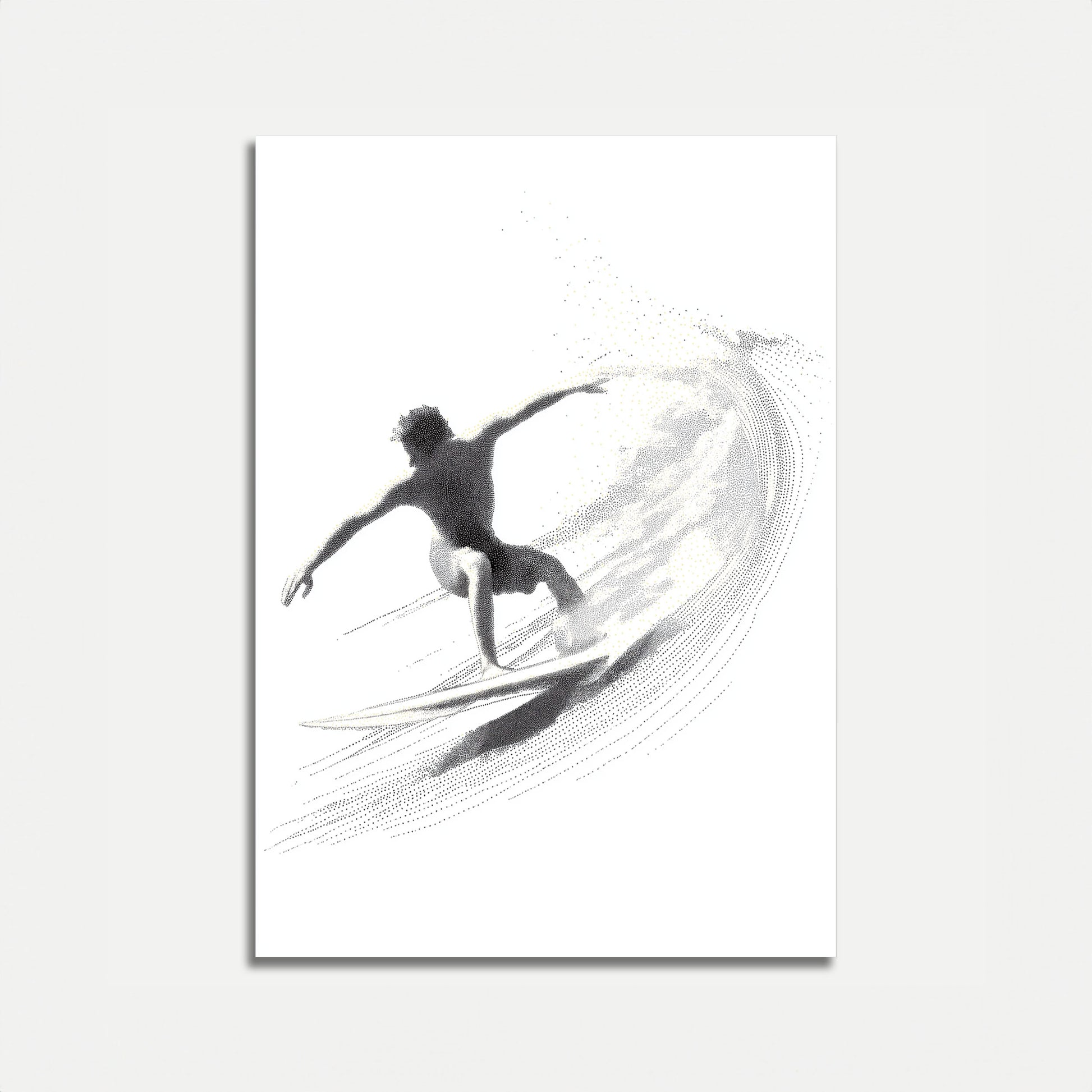 Ressentez l'énergie brute du surf capturée dans cette illustration pointilliste époustouflante. La silhouette se déplace sur une vague avec une grâce fluide, créant une danse hypnotique entre l'homme et l'océan à travers des détails pointillés complexes. Des lignes dynamiques et des dégradés subtils évoquent la vitesse et le mouvement d'un moment de surf parfait.