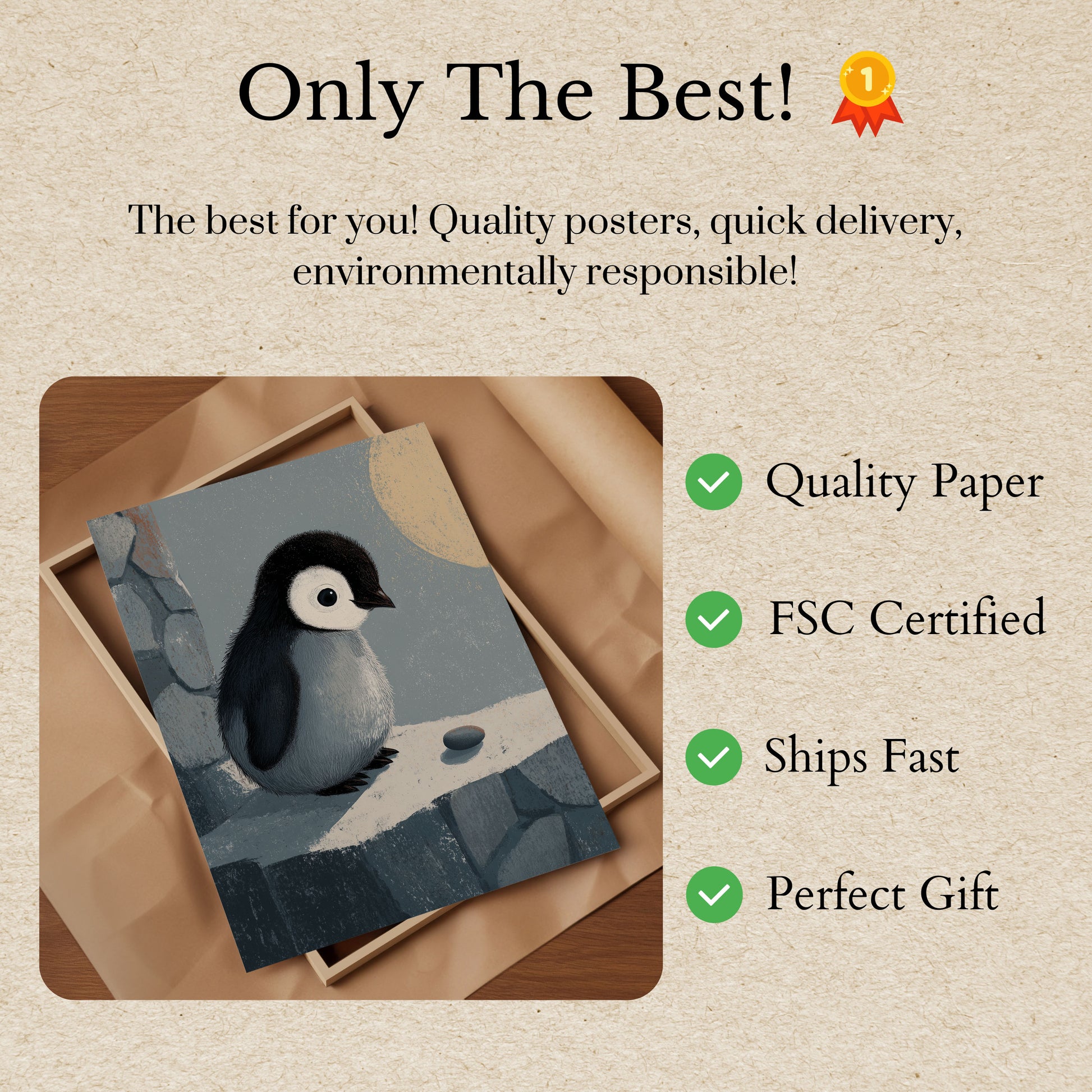 Parfait pour les chambres d'enfants, les salons des enfants, ou tout espace qui a besoin d'une touche de charme arctique et d'innocence, cette affiche célèbre la merveille de la faune d'une manière douce et accessible. La composition minimaliste concentre toute l'attention sur le petit pingouin attachant, ce qui en fait un ajout délicieux aux maisons des amoureux des animaux.