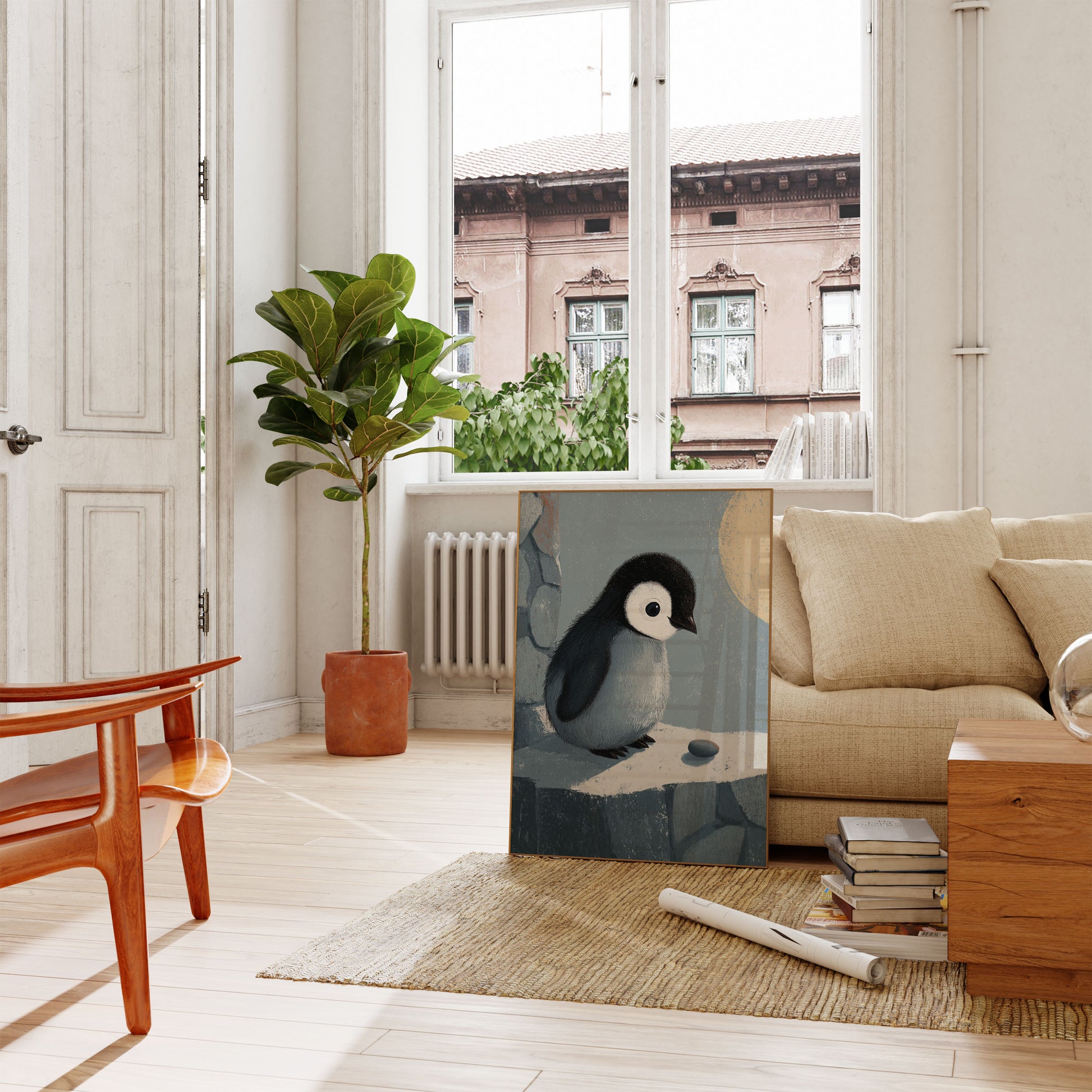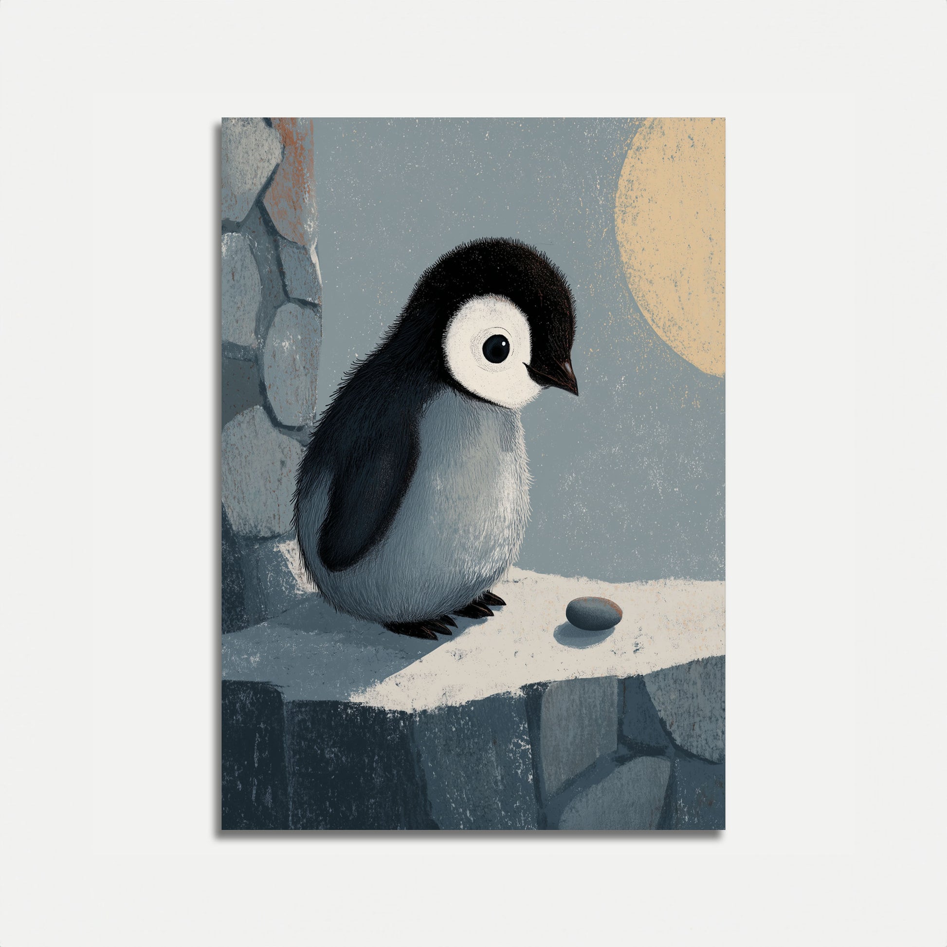 Rencontrez le plus adorable petit pingouin que vous ayez jamais vu ! Cette illustration charmante capture un bébé pingouin duvetteux avec son plumage distinctif noir et blanc et ces yeux incroyablement grands et expressifs qui vous feront fondre le cœur. La palette de couleurs douce et atténuée de gris frais, de crèmes chauds et de bleus doux crée une atmosphère sereine et paisible, tandis que les détails délicats des plumes duveteuses du petit pingouin donnent vie au personnage.