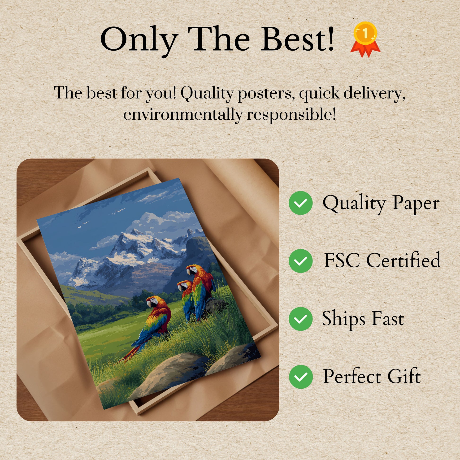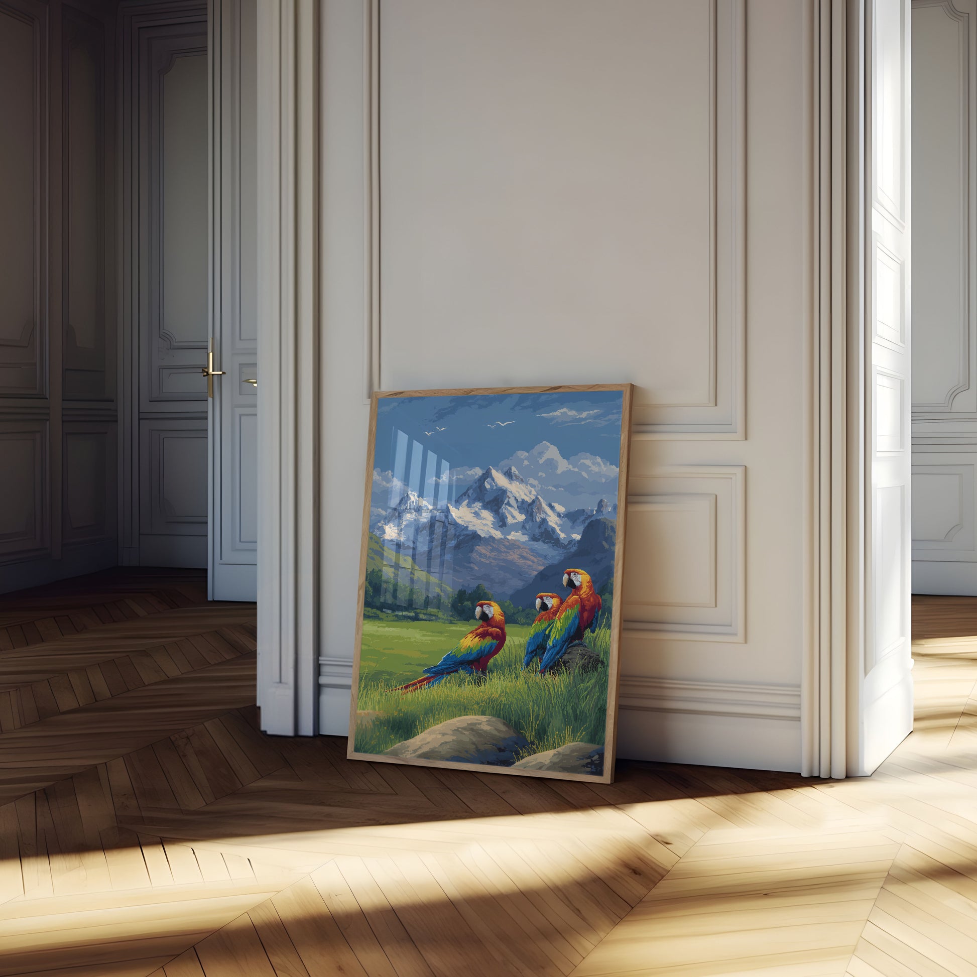 Cette œuvre d'art époustouflante capture trois aras vibrants perchés avec élégance dans une prairie alpine luxuriante, avec des pics de montagne enneigés s'élevant majestueusement en arrière-plan. Les rouges brillants, bleus et or des perroquets créent un contraste frappant avec le paysage serein d'herbe verte et de montagnes towering couvertes de neige. La composition équilibre parfaitement l'émerveillement de la faune avec des paysages naturels à couper le souffle, évoquant une beauté tropicale rencontrant la majesté des montagnes. Les nuages doux et le ciel bleu clair complètent cette scène paisible mais dynamique qui apporte les résidents les plus colorés de la nature dans un cadre inattendu d'altitude élevée.