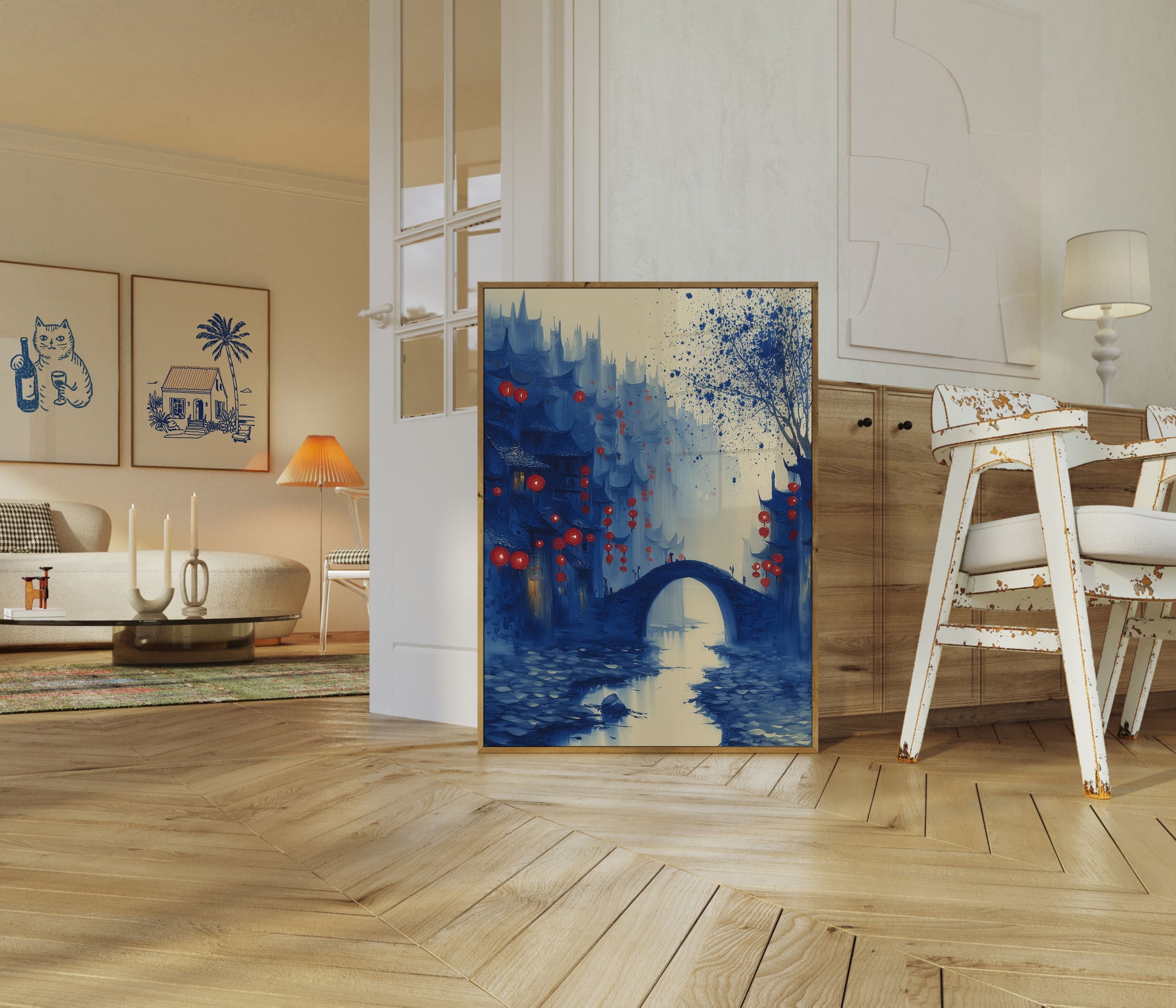 Plongez-vous dans un paysage envoûtant aux tons bleus où l'architecture ancienne rencontre une beauté éthérée. De délicats fanaux rouges flottent comme des orbes oniriques contre un paysage urbain brumeux, avec un pont de pierre gracieux surplombant une rivière tranquille. La scène capture un moment magique entre le crépuscule et l'imagination, mêlant des éléments architecturaux chinois traditionnels à une esthétique surréaliste inspirée de l'aquarelle.