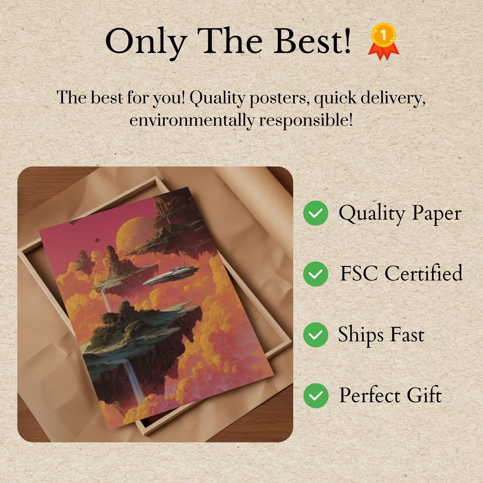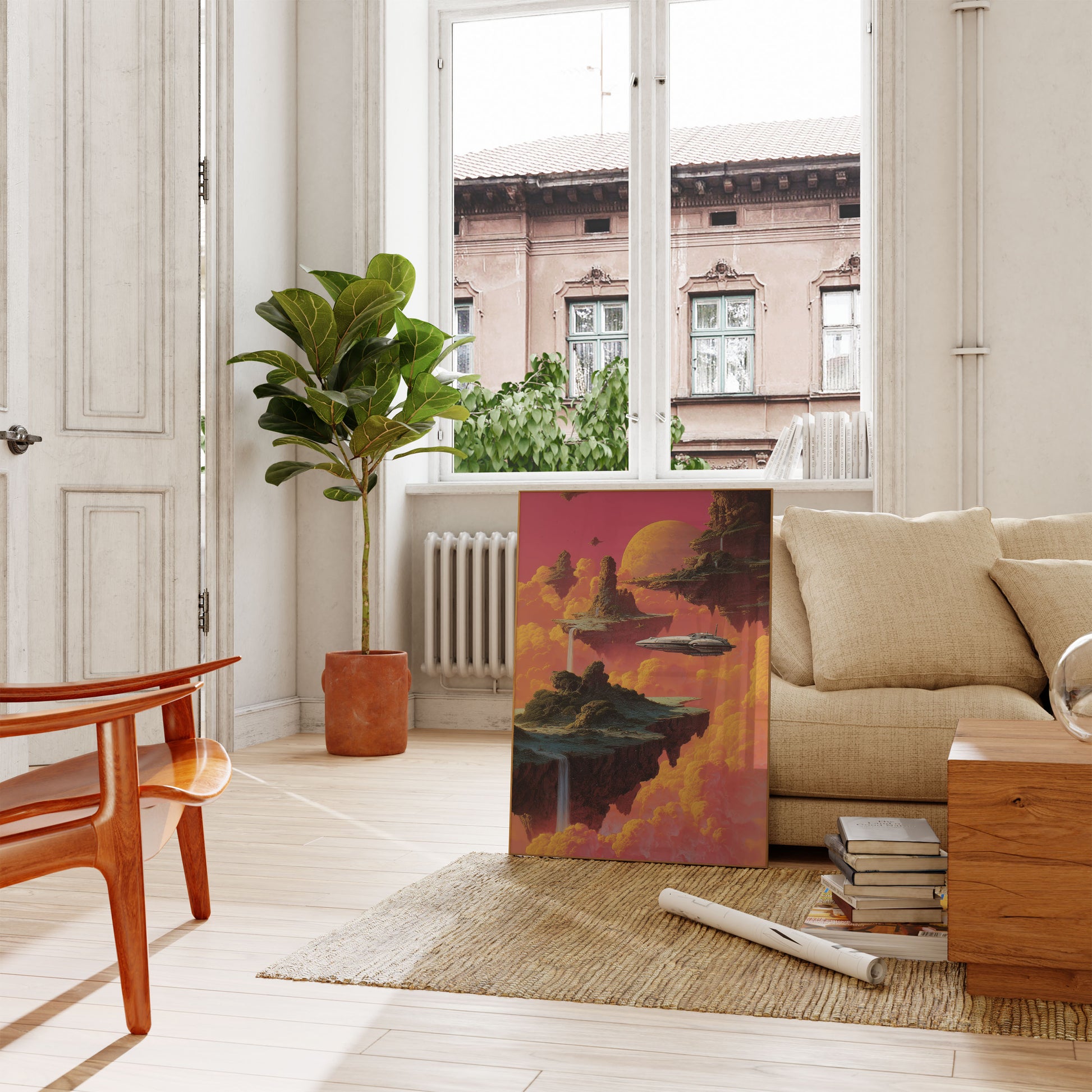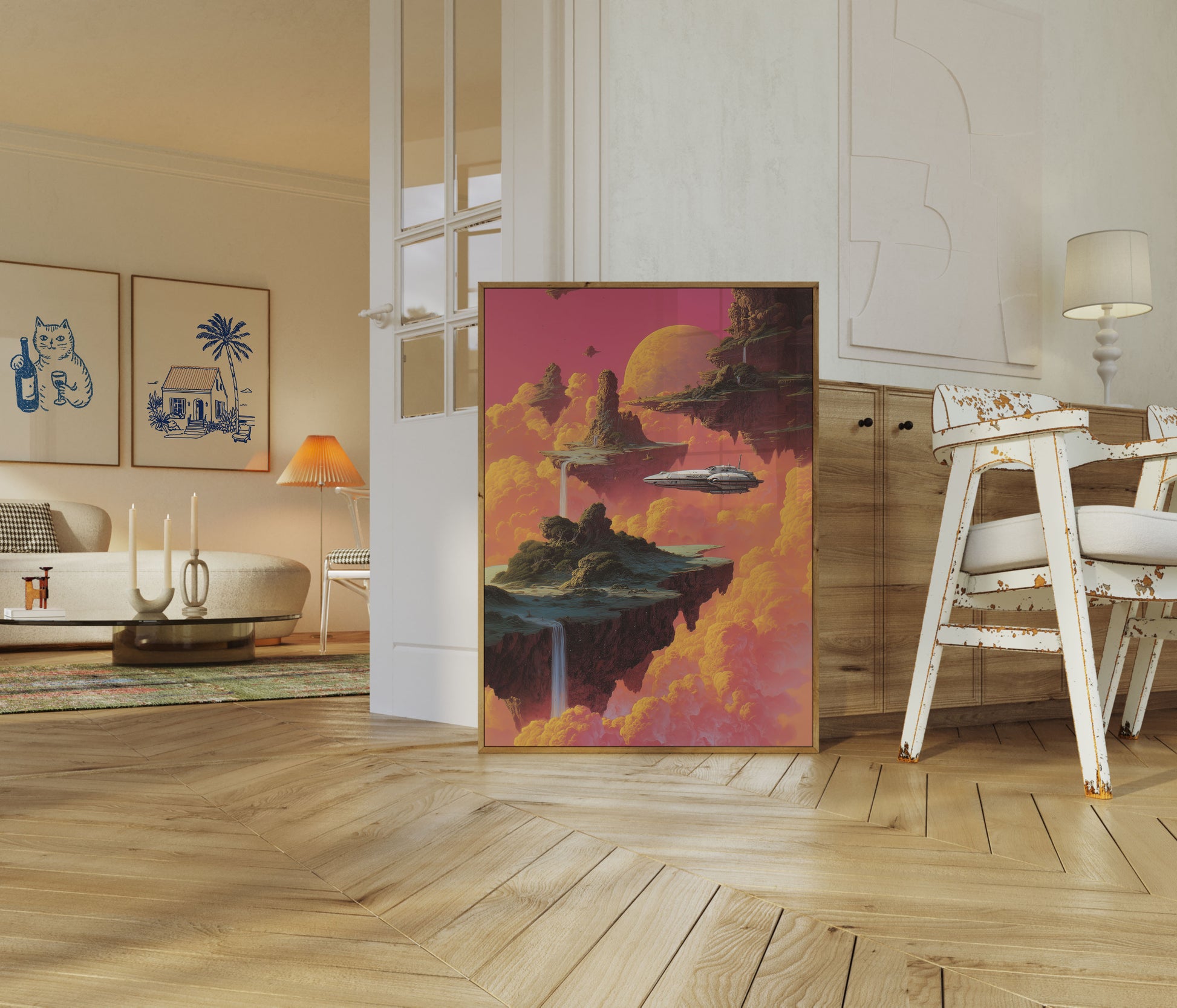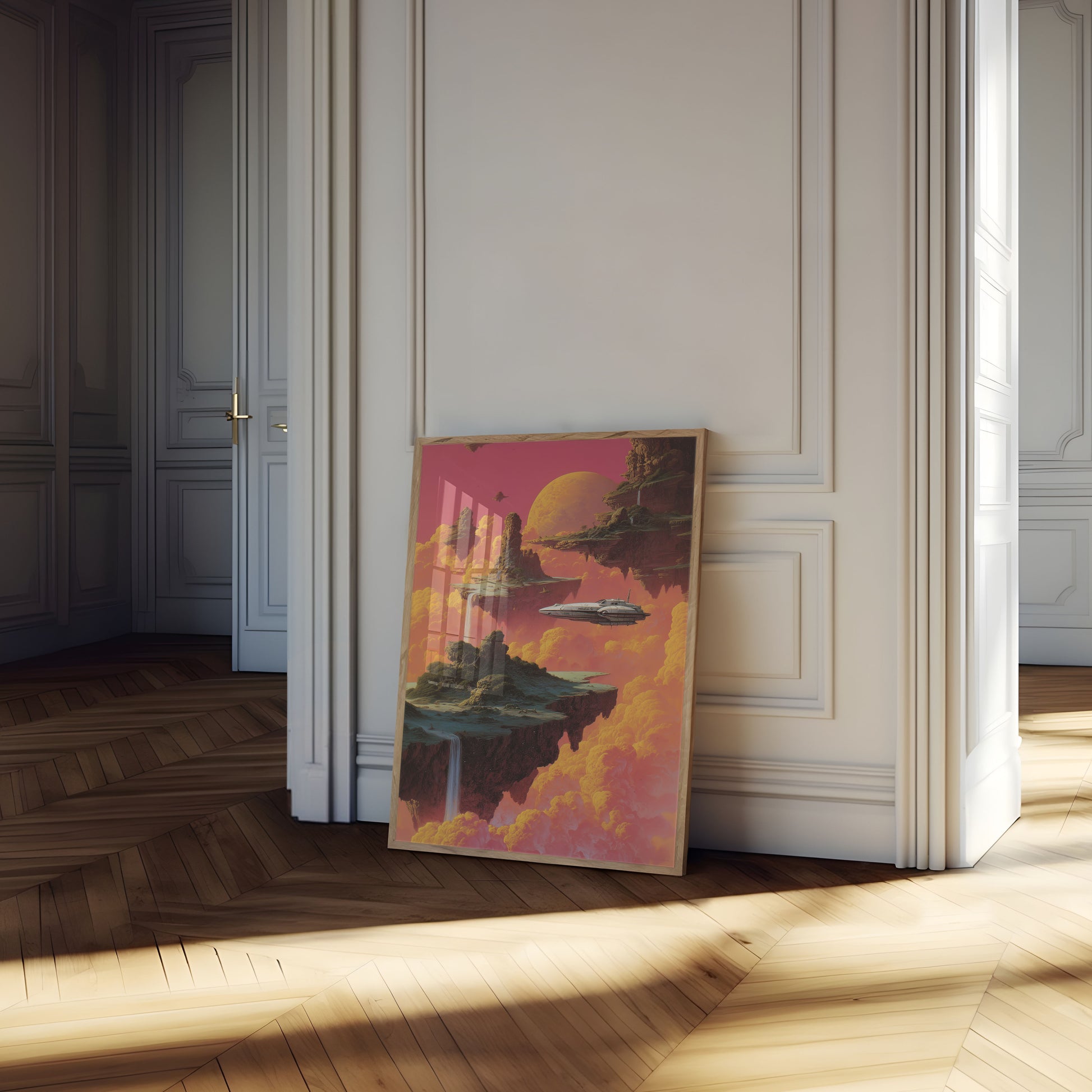 Transportez-vous vers un monde extraterrestre à couper le souffle où d'énormes îles flottantes dérivent à travers des nuages dorés sous une lune orange gonflée. Cette magnifique illustration rétro de science-fiction capture l'essence de l'art classique de l'exploration spatiale avec sa palette de couleurs chaudes et vibrantes de rose corail, d'oranges brûlées et de jaunes lumineux. Un élégant vaisseau spatial futuriste flotte gracieusement parmi les formations rocheuses imposantes, évoquant un sentiment d'émerveillement et d'aventure qui a défini l'âge d'or de la science-fiction. L'ambiance atmosphérique est à la fois sereine et aventureuse, mêlant la peinture de paysage surréaliste au design rétro-futuriste pour une pièce véritablement intemporelle qui célèbre les rêves d'exploration de l'humanité au-delà de notre monde.