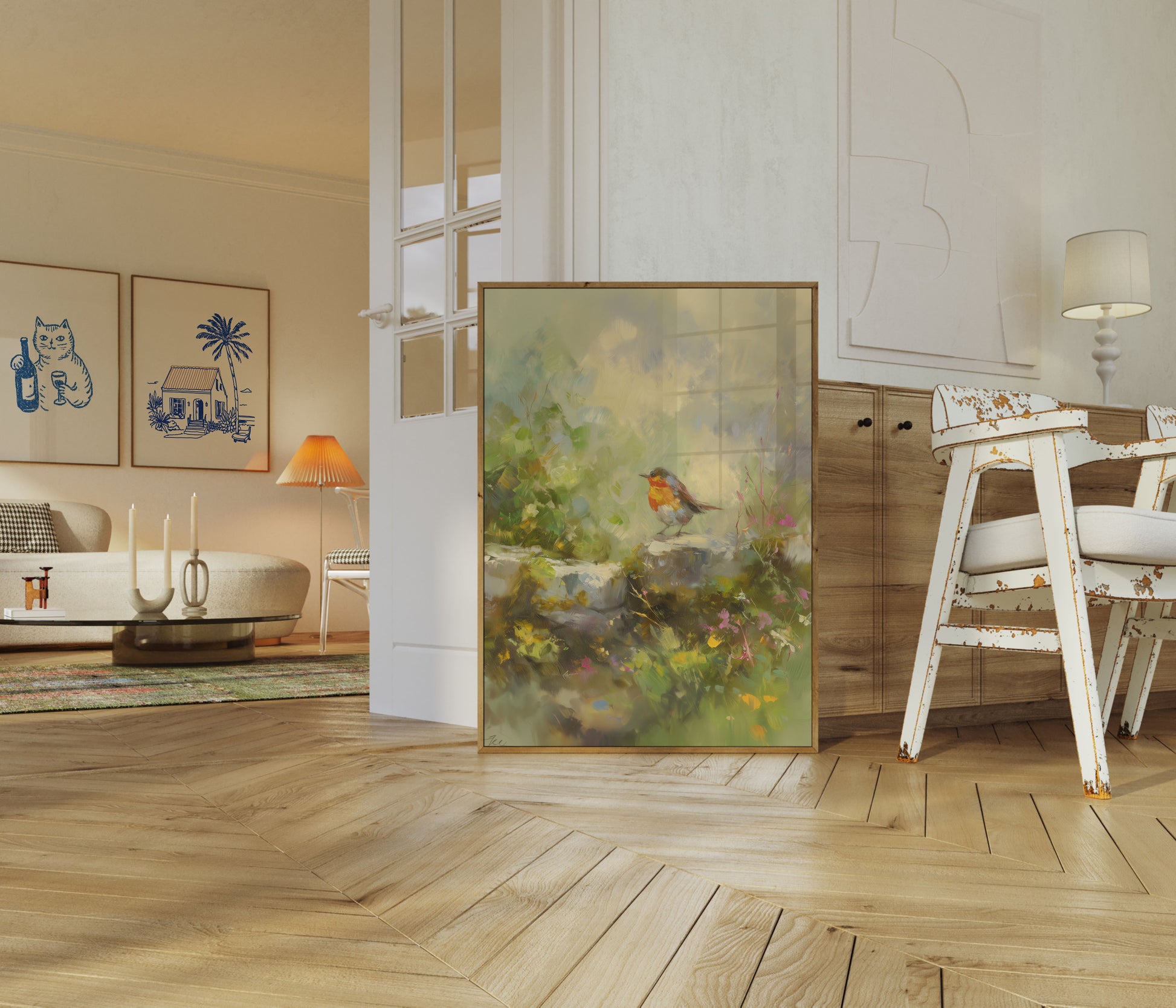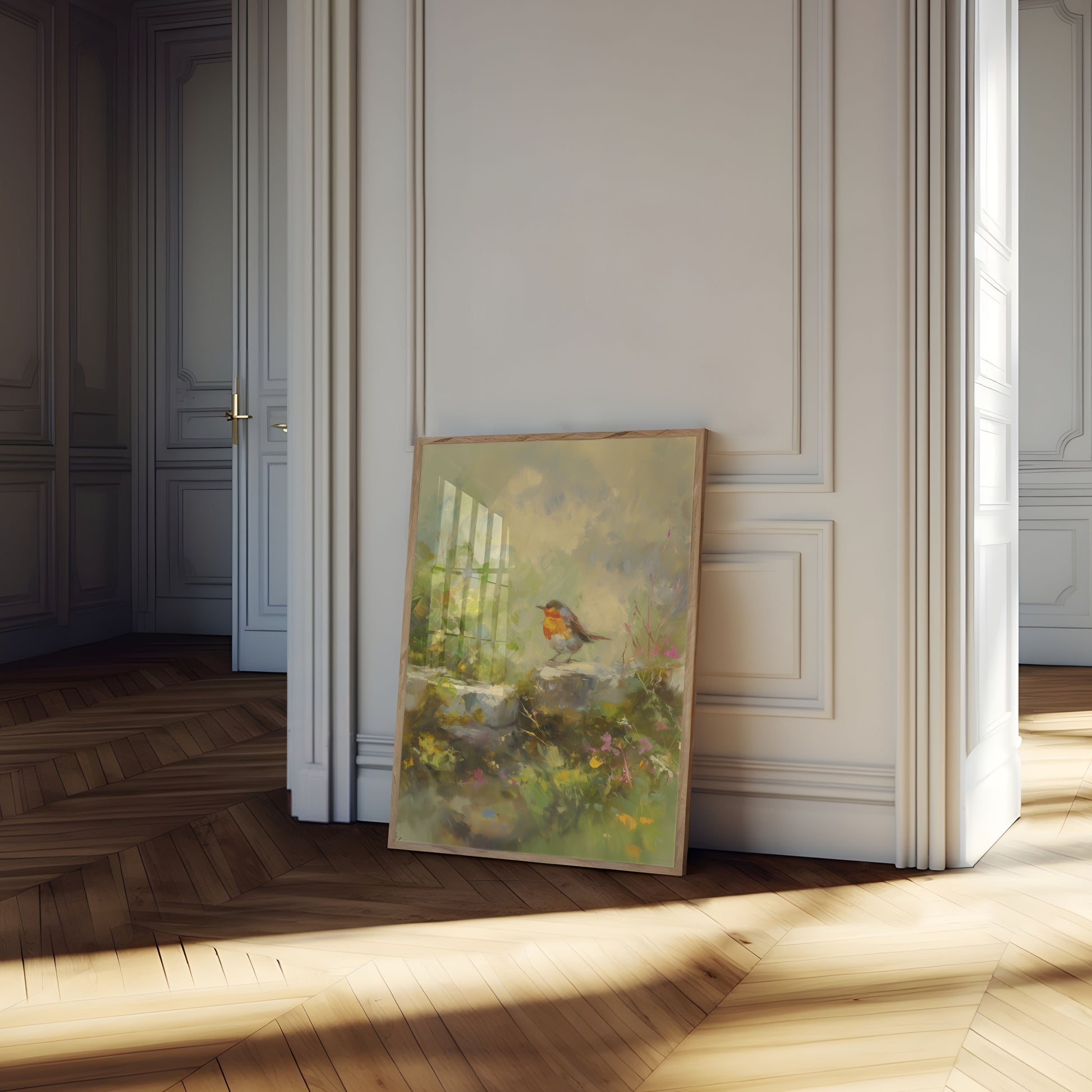 Découvrez la beauté sereine de cette scène de jardin enchanteur mettant en vedette un charmant rouge-gorge perché parmi les fleurs en fleur et le feuillage luxuriant. Peint avec des coups de pinceau doux et rêveurs, cette œuvre d'art capture un moment paisible dans la nature avec des pastels délicats et des couleurs chaudes et accueillantes. La poitrine orange-rouge vibrante du rouge-gorge crée un point focal frappant contre les verts doux et les blancs du jardin environnant, tandis que les fleurs roses et jaunes ajoutent des touches de couleur douce dans toute la composition. Cette illustration calme de la nature apporte un sentiment de tranquillité et de beauté naturelle à n'importe quel espace, parfait pour ceux qui aiment les oiseaux, les jardins et les merveilles paisibles de la nature.