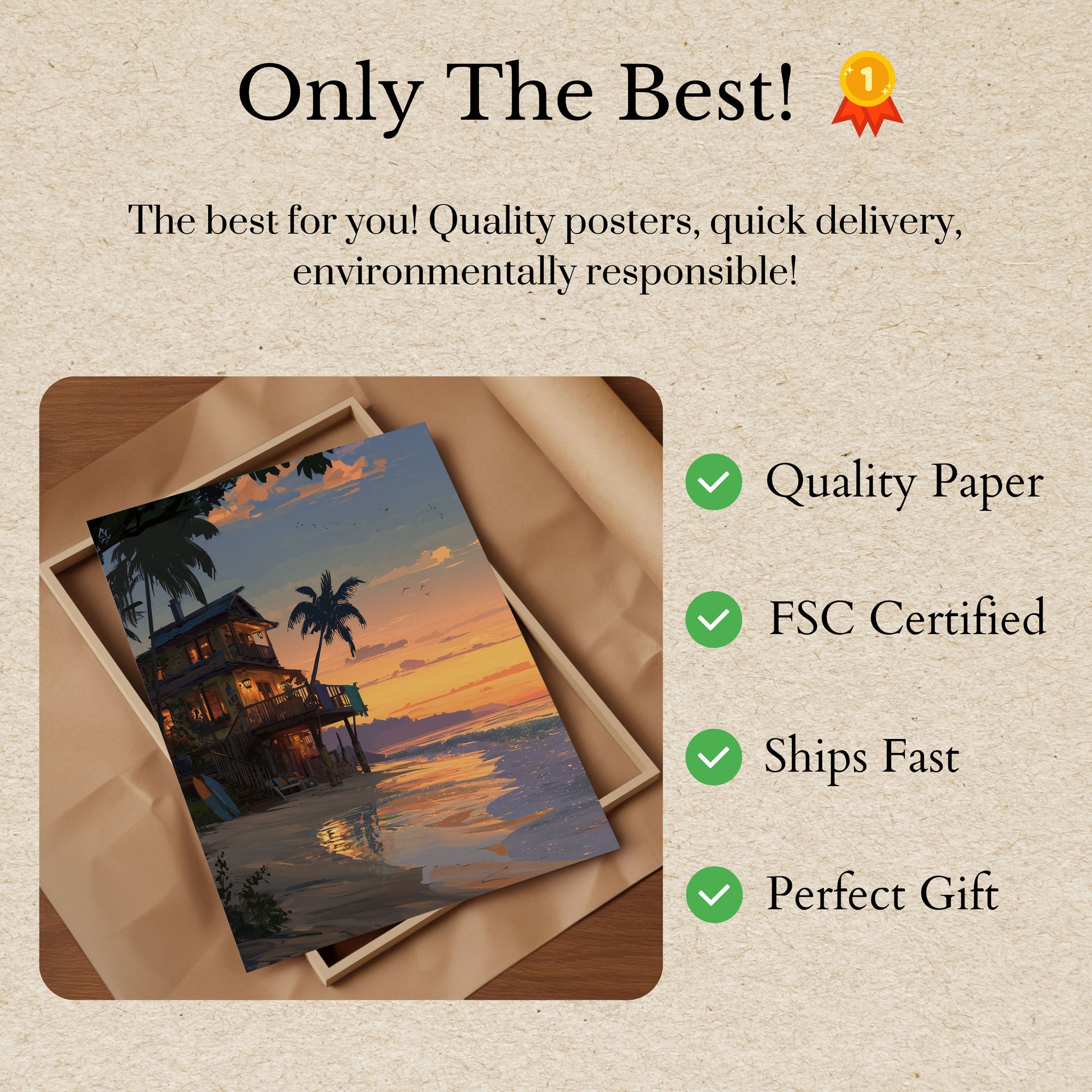 Plongez-vous dans la beauté paisible d'un coucher de soleil côtier avec cette scène de maison de plage saisissante. Des teintes orangées et dorées chaudes illuminent une charmante maison de plage en bois perchée sur pilotis, avec des palmiers en silhouette contre un ciel à couper le souffle. Les vagues douces reflètent les couleurs chaudes du coucher de soleil, créant un paysage côtier envoûtant qui capture l'essence de la détente tropicale.