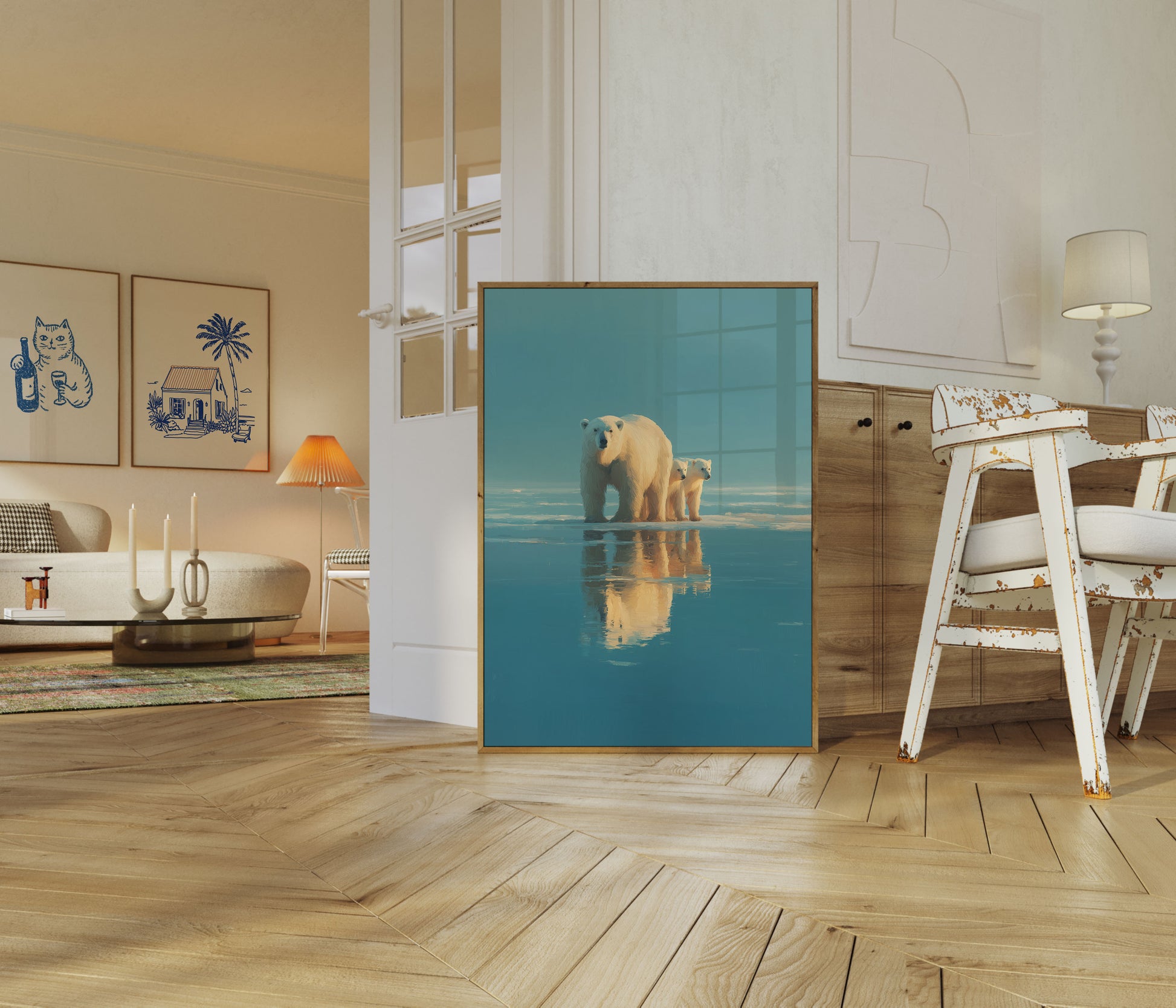 Immerse yourself in the serene beauty of the Arctic with this stunning polar bear portrait. A majestic adult polar bear stands protectively alongside two cubs on a delicate ice platform, their golden-white fur glowing against a tranquil teal background. The perfect mirror-like reflection creates a mesmerizing symmetry that captures the fragile beauty and resilience of these incredible Arctic creatures.