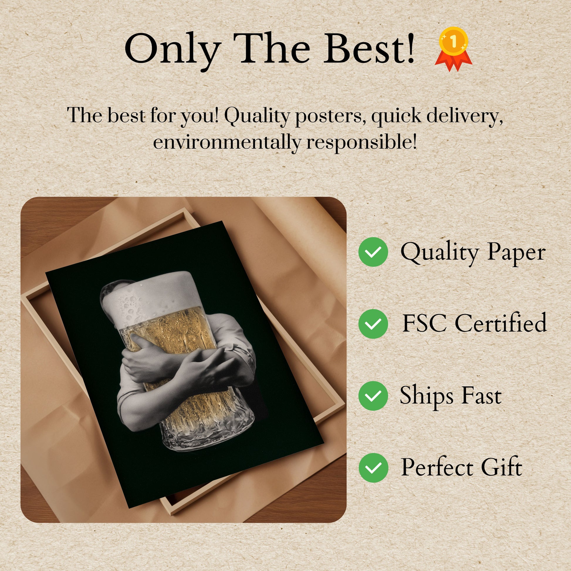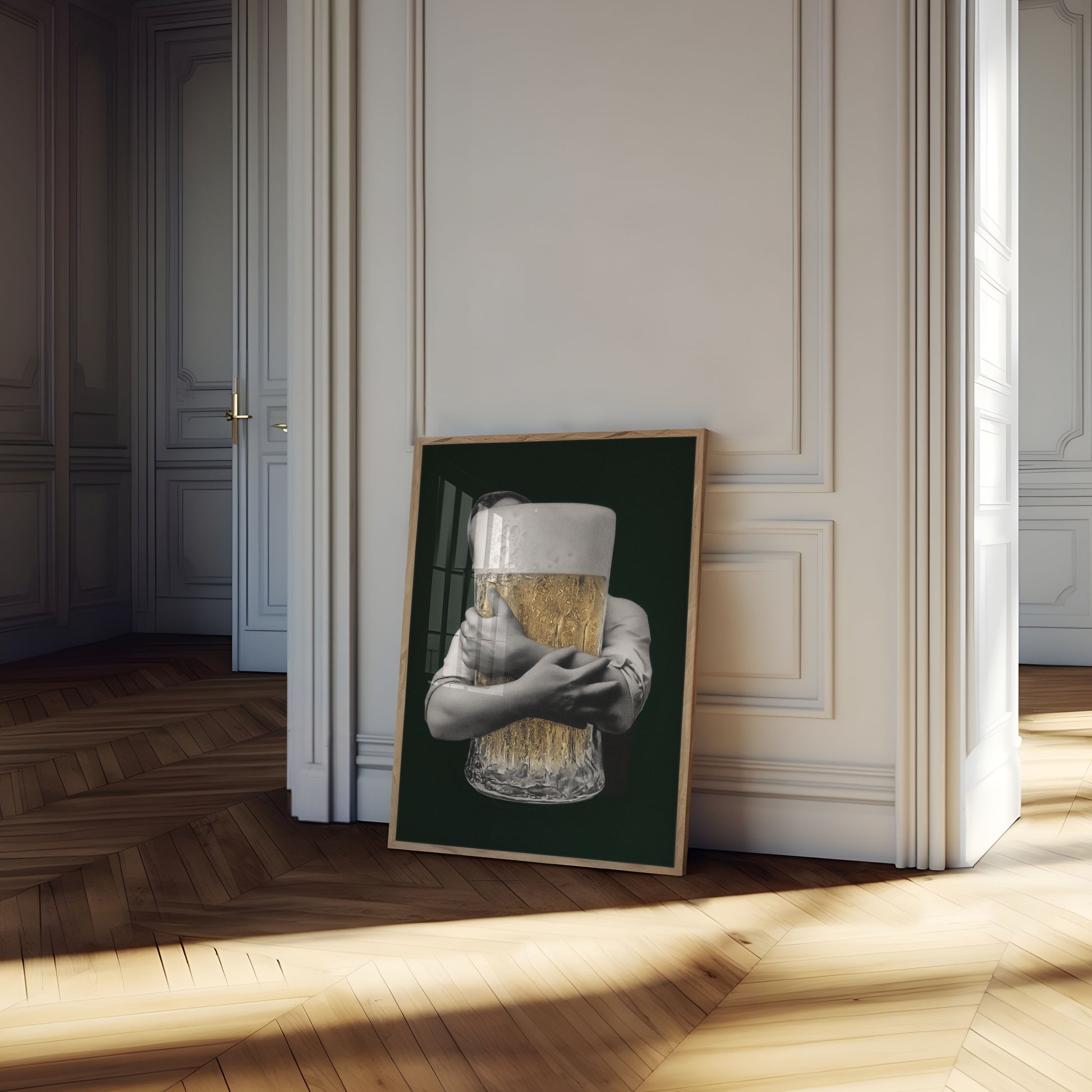A stunning monochrome artwork captures an intimate moment of connection between a hand and a golden beer glass. The image portrays a sense of comfort and companionship, with delicate gray arms tenderly hugging a luminous beer vessel against a deep green backdrop. This striking visual metaphor explores the emotional relationship between a person and their favorite beverage.