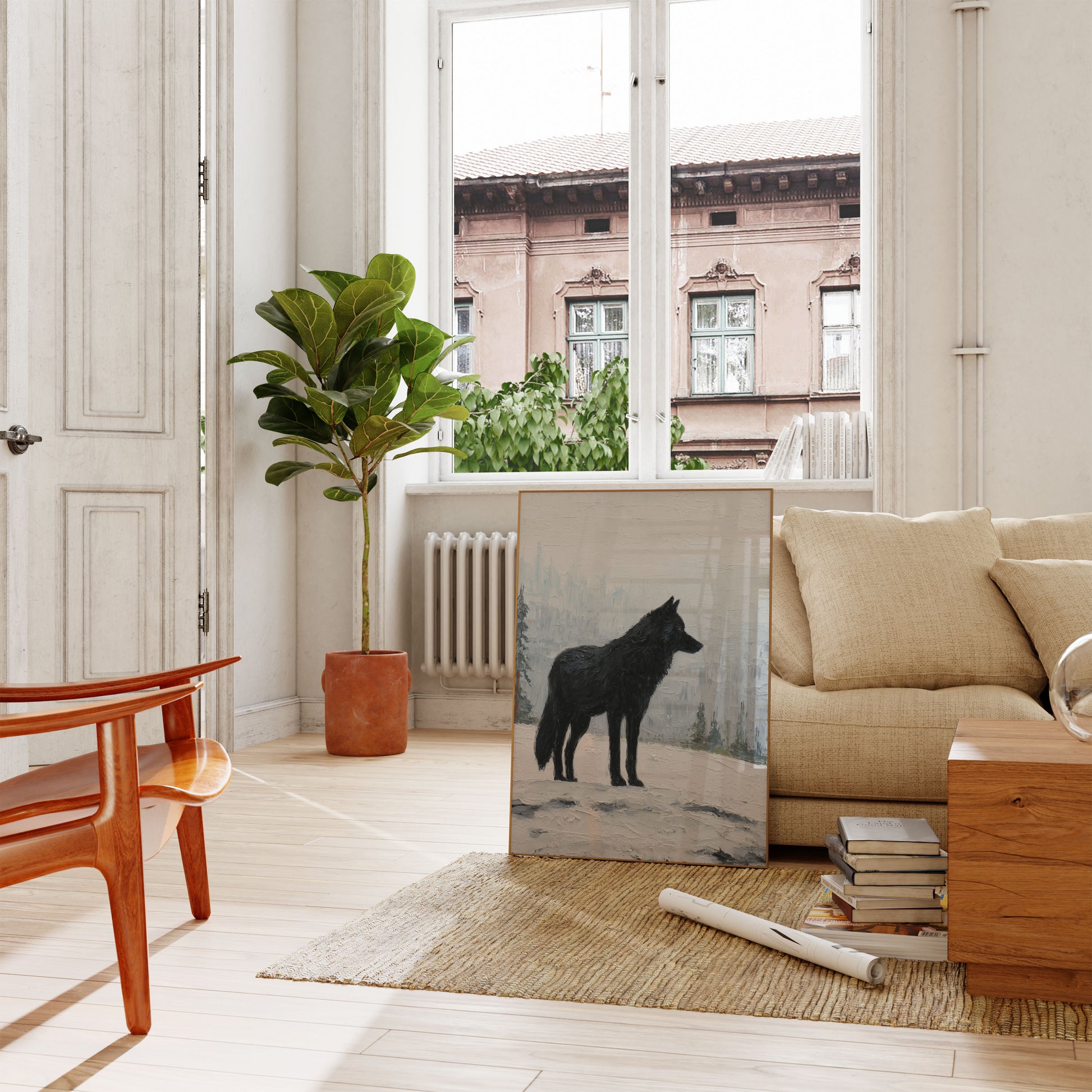 A hauntingly beautiful oil painting captures a lone black wolf standing stoically in a misty, snow-covered landscape. The stark contrast between the deep black of the wolf and the ethereal white and gray winter scene creates a powerful, contemplative atmosphere. Delicate pine trees fade into the background, emphasizing the wolf's solitary presence and silent strength.