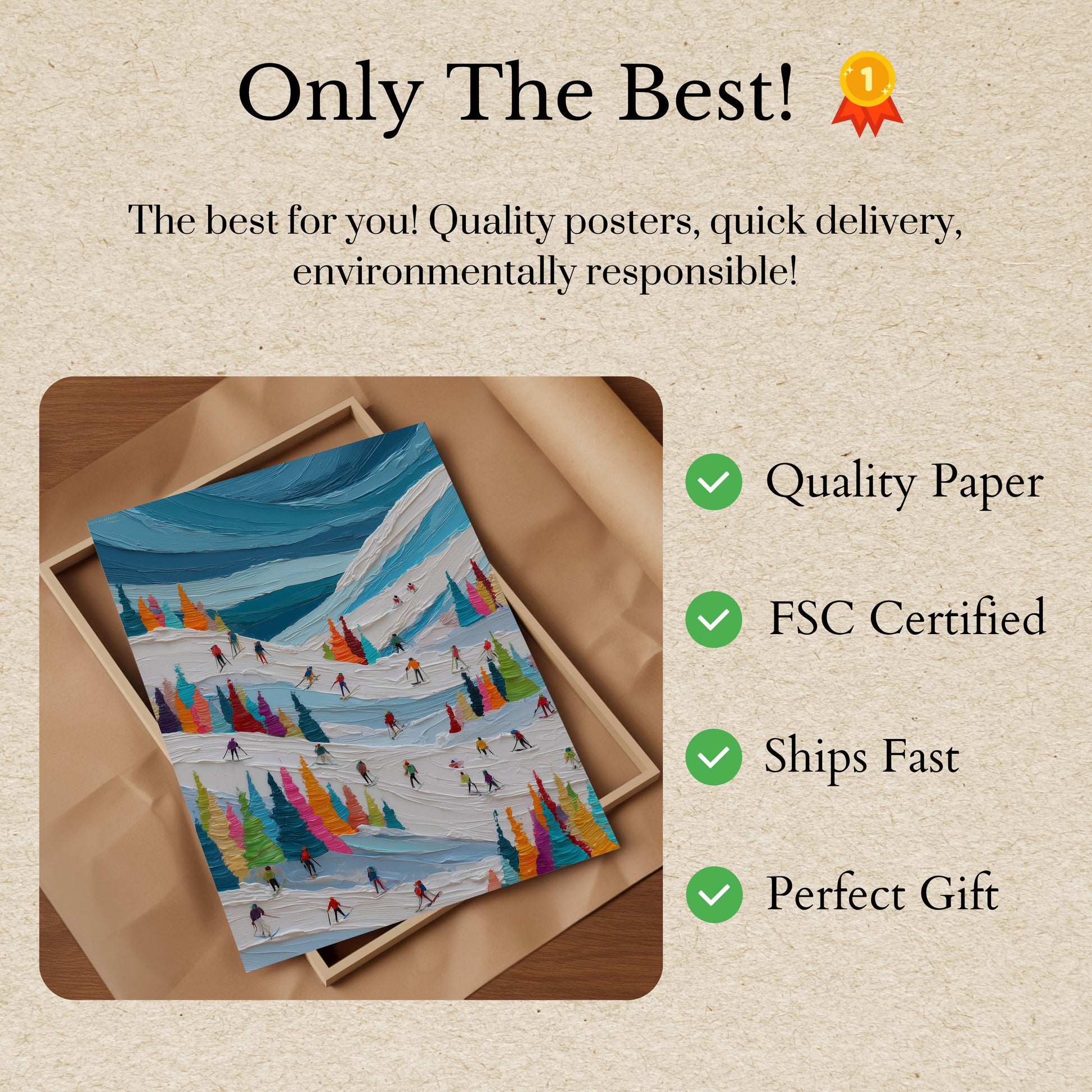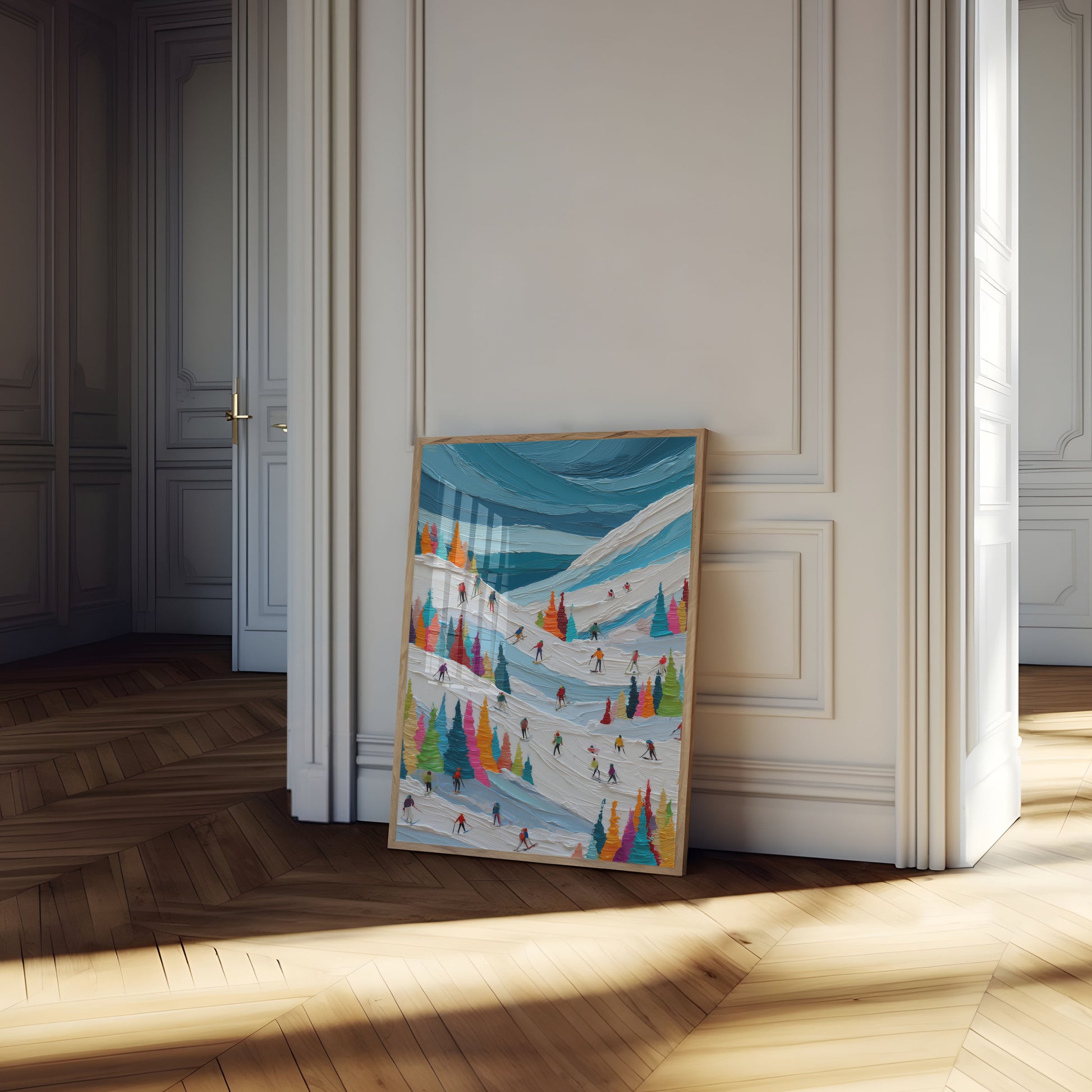 Experience a vibrant winter wonderland with this stunning ski landscape painting that transforms a traditional snow scene into a kaleidoscope of color. Featuring stylized alpine trees in brilliant hues of orange, pink, teal, and green, skiers traverse textured white slopes against a dreamy blue background, creating an enchanting and dynamic winter sports artwork. The textured oil painting technique brings incredible depth and movement to this joyful winter scene.