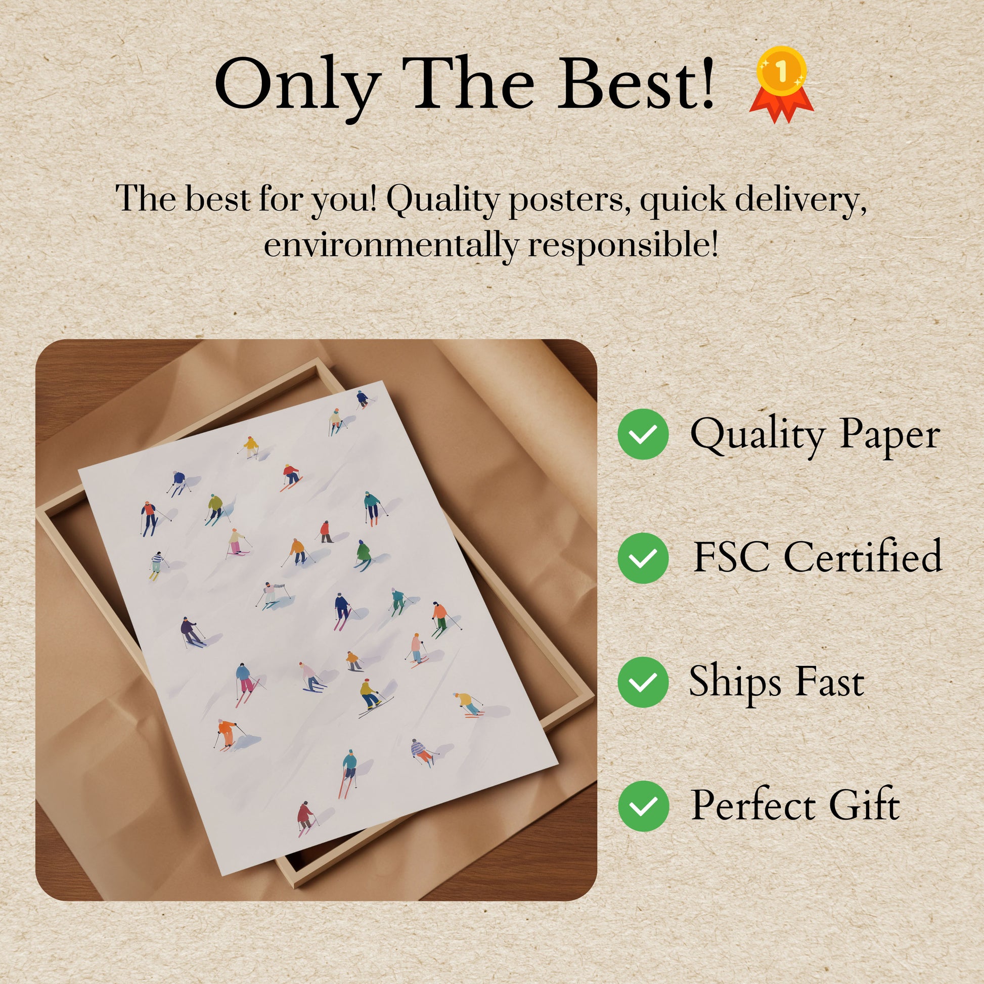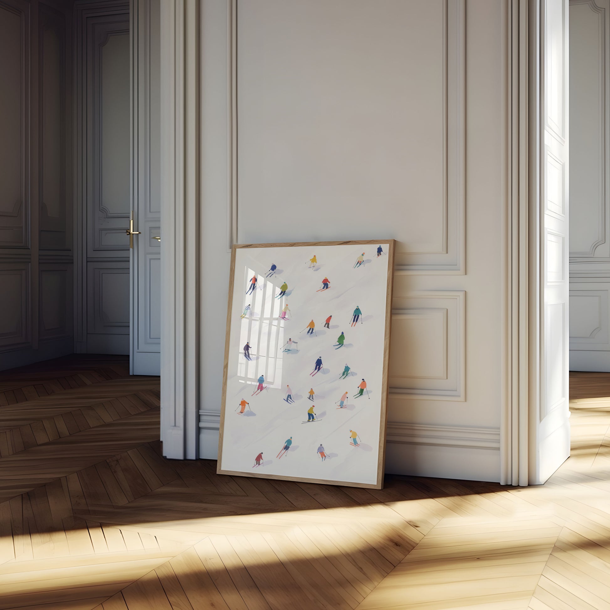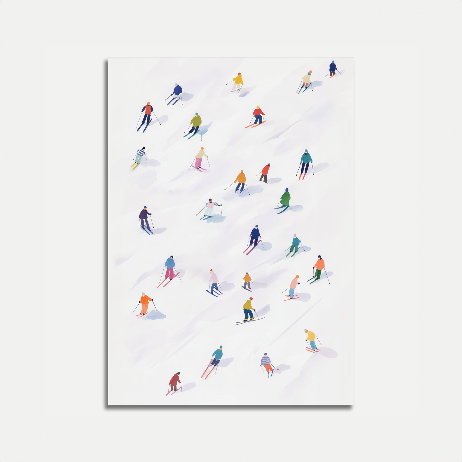 Capture the exhilarating spirit of winter sports with this vibrant skiing illustration featuring a diverse collection of skiers gliding across a pristine white landscape. Each figure is rendered in a unique, cheerful color palette, creating a dynamic and playful scene that celebrates the joy of skiing. The minimalist design and soft shadows bring a modern, artistic touch to this delightful winter sports artwork.