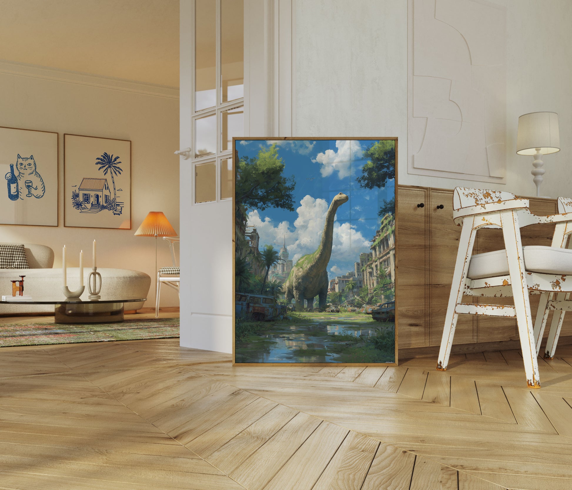 Immerse yourself in a breathtaking post-apocalyptic landscape where a majestic Brontosaurus roams through an overgrown urban wilderness. Lush vegetation reclaims abandoned vehicles and crumbling buildings, while the gentle giant stands as a serene guardian of this forgotten world. Dramatic cumulus clouds and a vibrant blue sky create a stunning backdrop that transforms destruction into an unexpected canvas of natural beauty and prehistoric wonder.