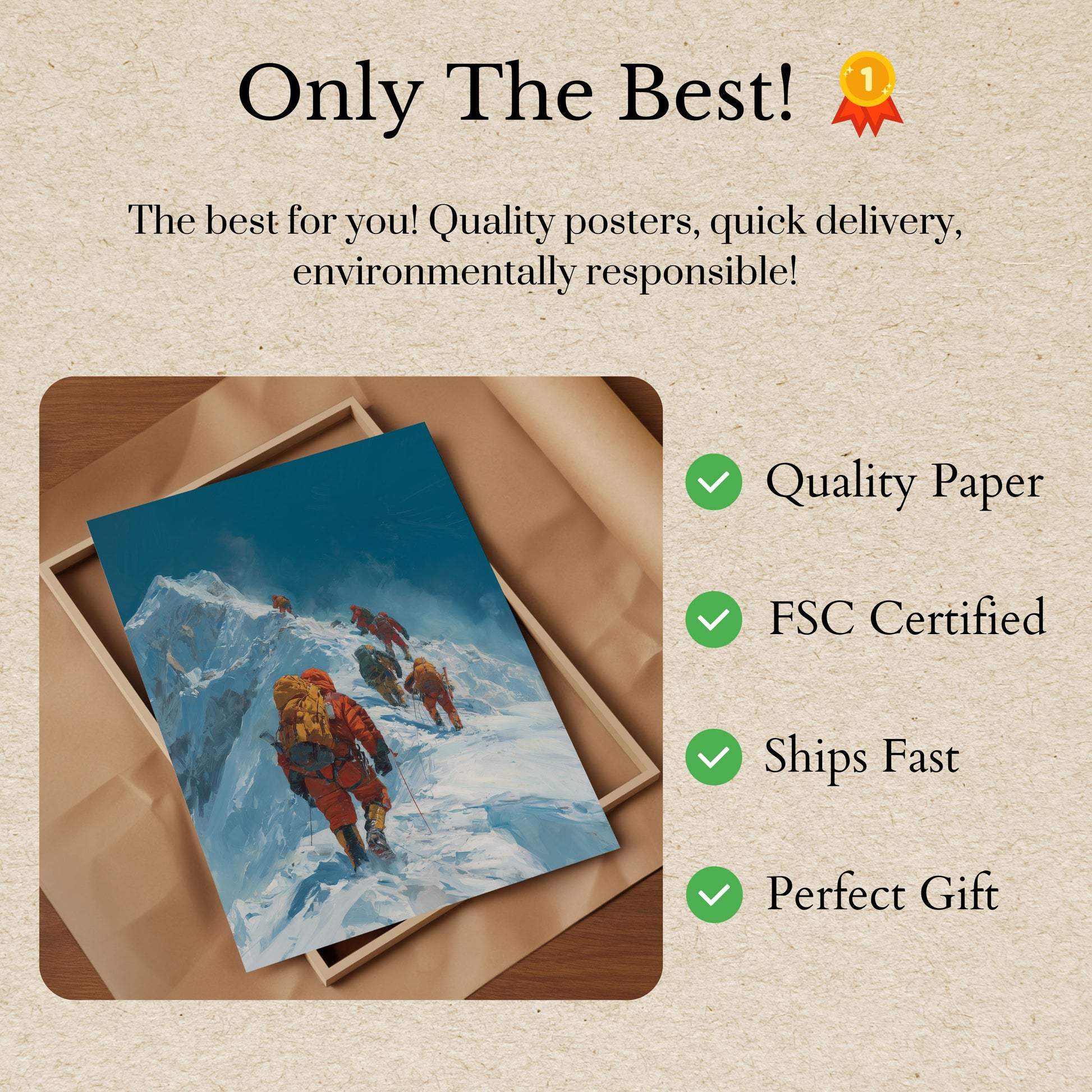 Experience the breathtaking challenge of high-altitude mountaineering with this stunning art print capturing the raw intensity of an Everest climbing expedition. Climbers in vibrant orange and yellow gear ascend a snow-covered mountain ridge against a dramatic teal-blue sky, showcasing the extraordinary human spirit of adventure and determination. The painting's dynamic brushstrokes and cool color palette bring the treacherous beauty of the world's highest peak to life with remarkable emotional depth.