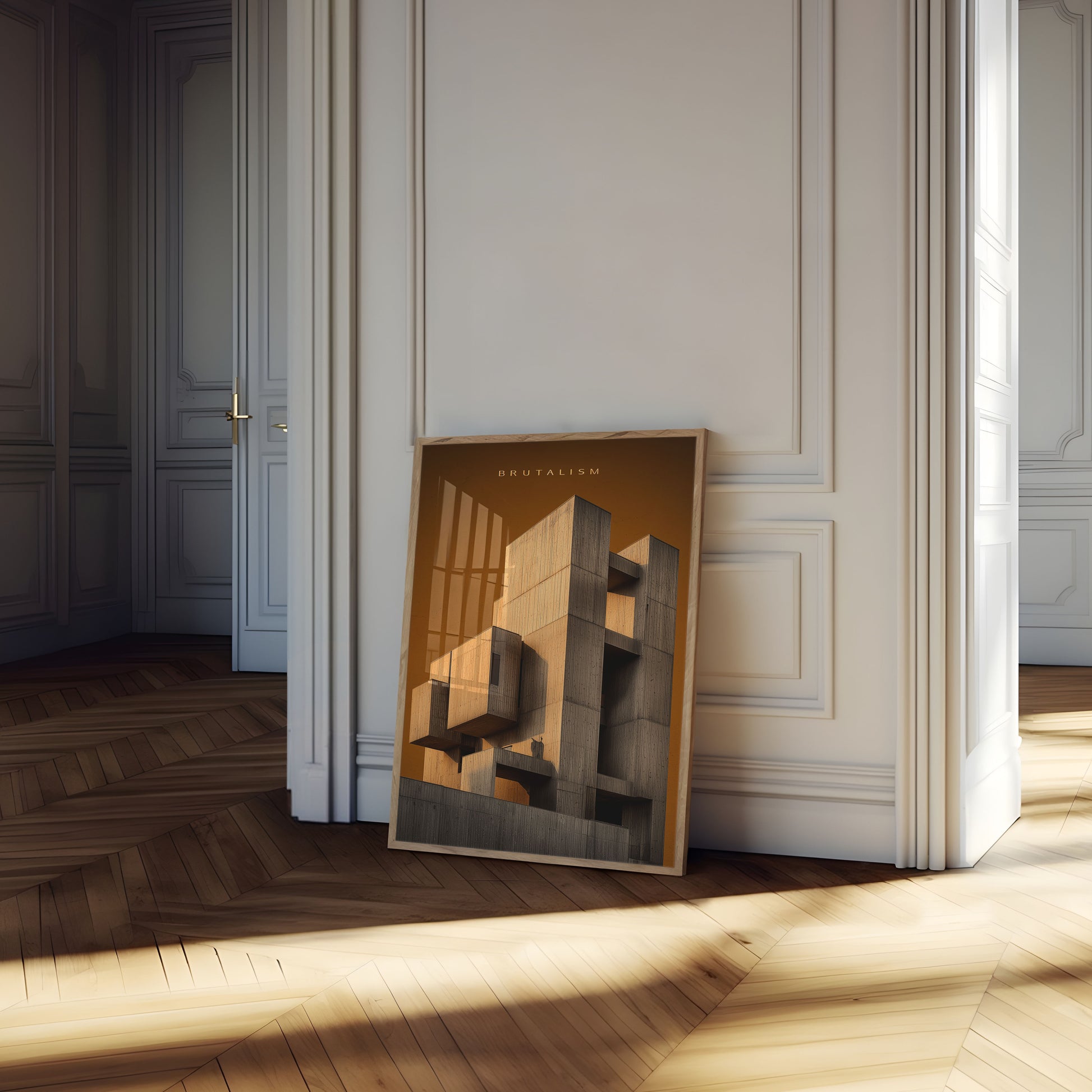 Dive into the raw, powerful world of architectural brutalism with this striking geometric design. Featuring interlocking concrete volumes bathed in warm, amber light, this poster captures the bold essence of modernist architectural philosophy. The angular, layered structures create a mesmerizing interplay of light, shadow, and architectural form that commands attention and transforms any space.
