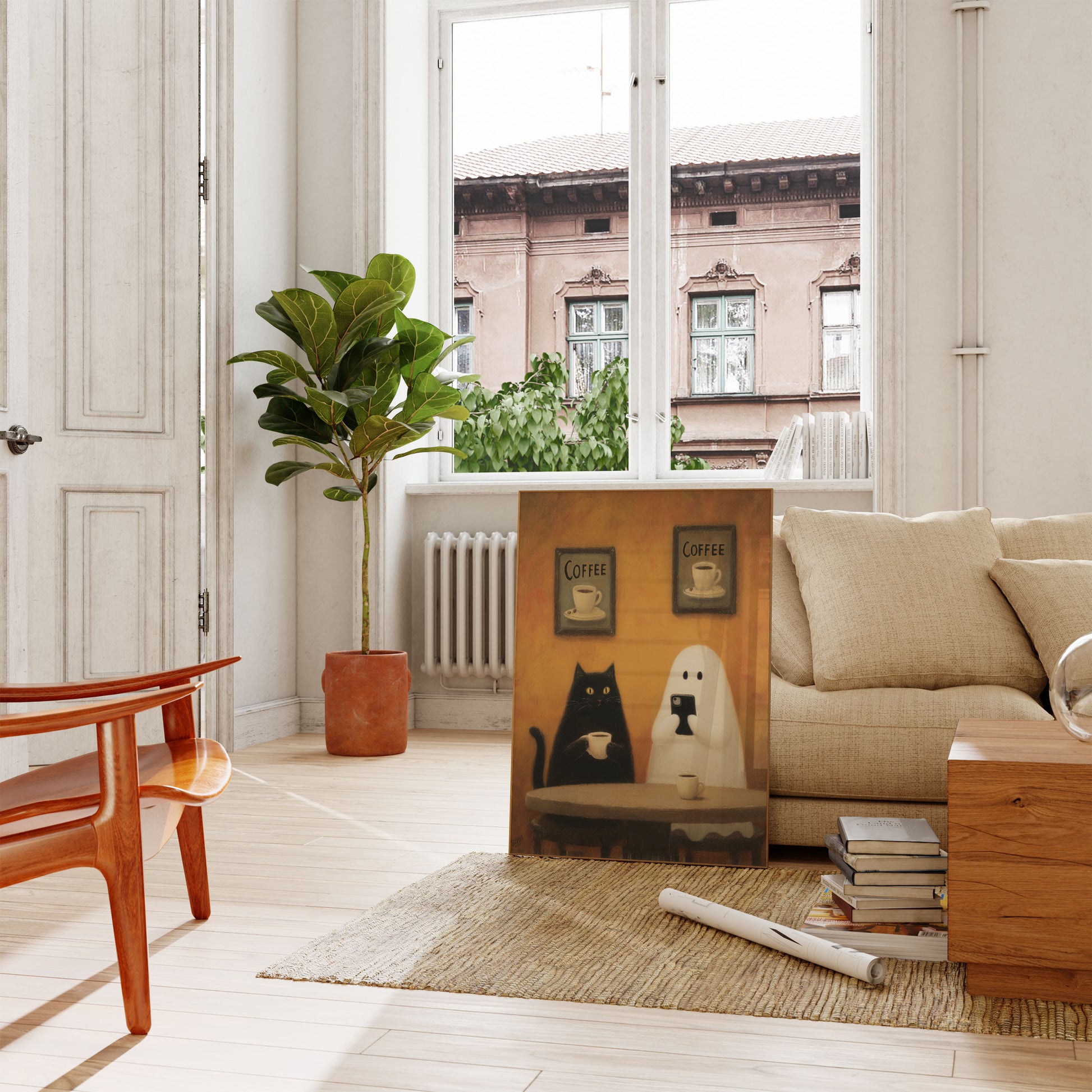 A charming and surreal illustration featuring a black cat and a friendly ghost sharing a moment over coffee. Set against a warm, golden-orange background with vintage coffee art prints, this delightful poster captures an adorable and whimsical scene of unexpected friendship. The playful interaction between the black cat holding a coffee cup and the ghost scrolling on a smartphone creates a unique and magical atmosphere that's sure to spark joy and conversation.