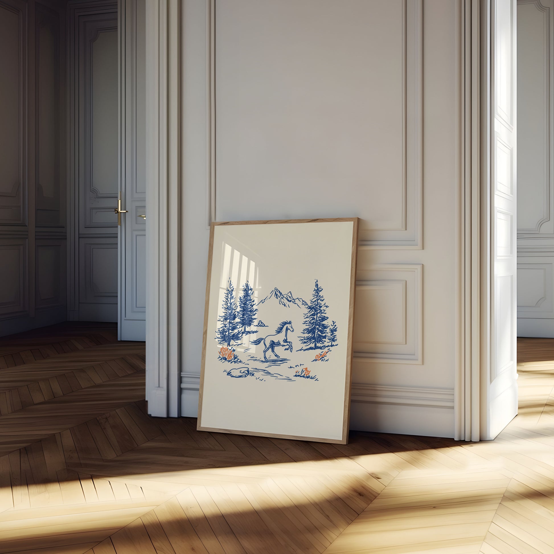 Échappez-vous vers un serein pré alpin avec cette affiche magnifiquement illustrée mettant en vedette un cheval fougueux se cabrant dans une vallée montagneuse pittoresque. Le style élégant de trait en bleu profond capture la liberté et la grâce de l'animal majestueux, encadré par des arbres à feuilles persistantes imposants et un pic enneigé dramatique au loin. Les fleurs sauvages orange chaud et les éléments naturels ajoutent une touche de couleur et de chaleur à cette scène de nature paisible, créant un équilibre parfait entre tranquillité et aventure qui apporte la beauté de la nature directement dans votre espace.