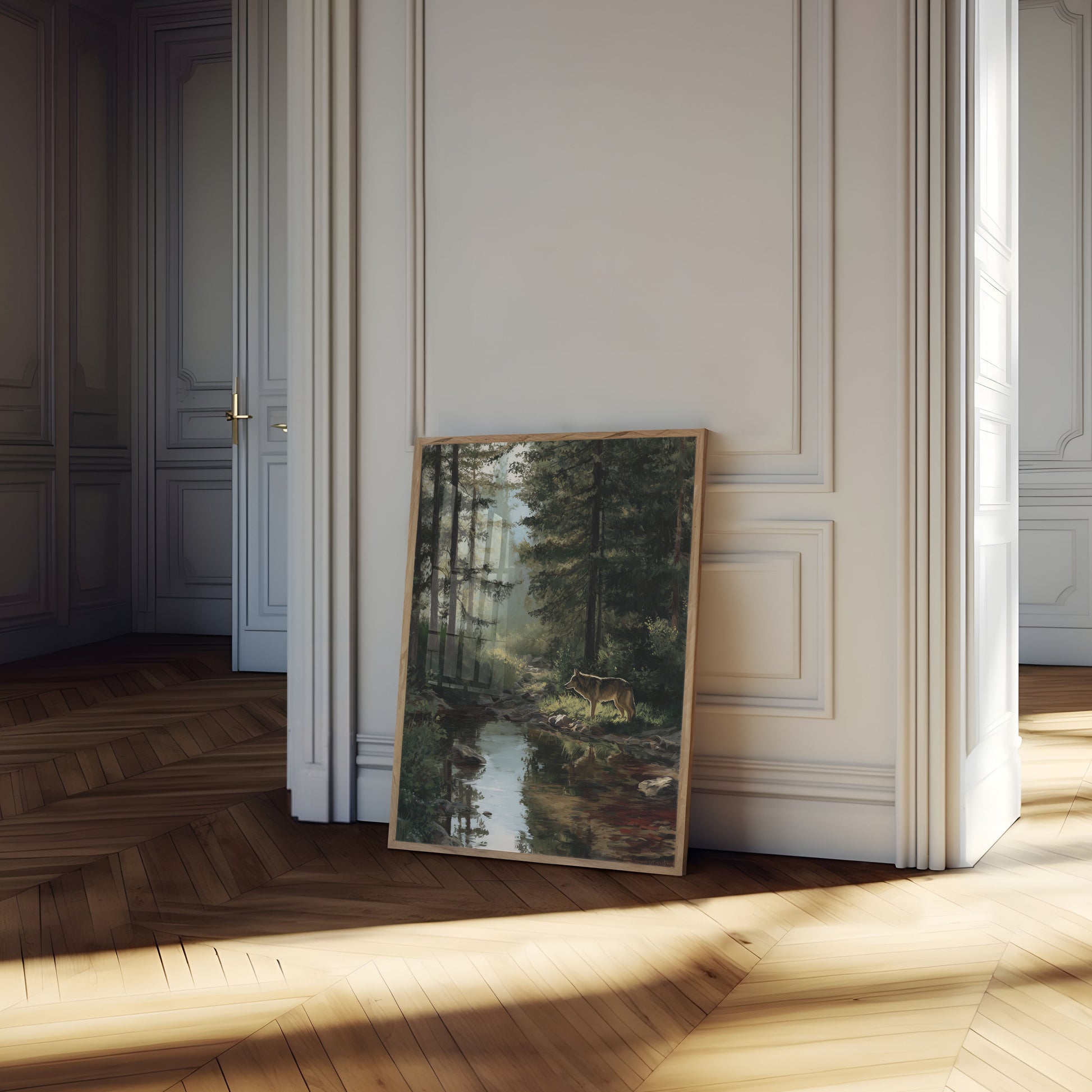 Immerse yourself in the tranquil beauty of a misty forest, where a solitary wolf stands guard beside a serene woodland stream. Soft, ethereal light filters through ancient pine trees, creating a magical atmosphere of quiet contemplation and wild wilderness. This stunning landscape captures the raw, untamed spirit of nature in a breathtaking moment of stillness and reflection.
