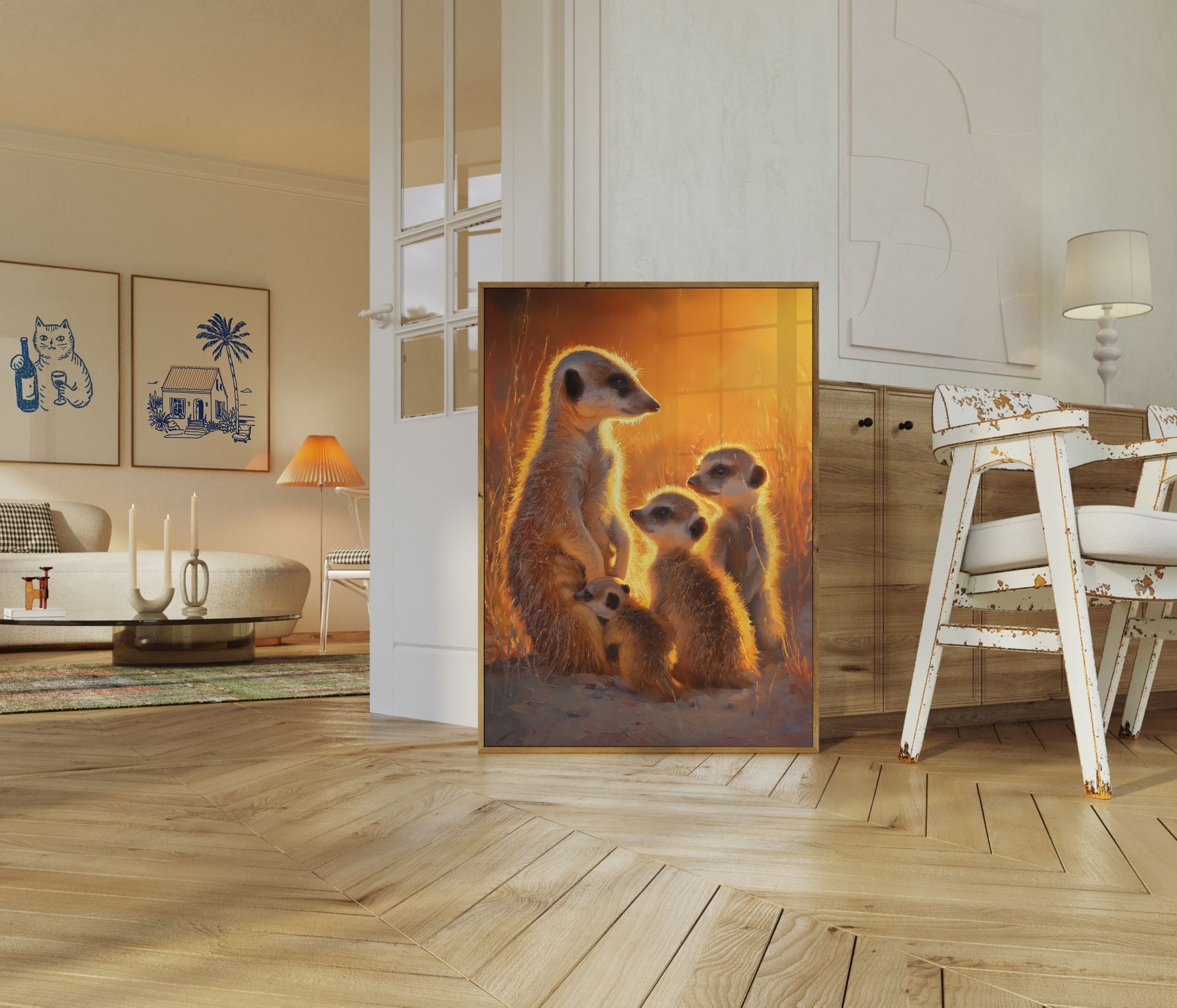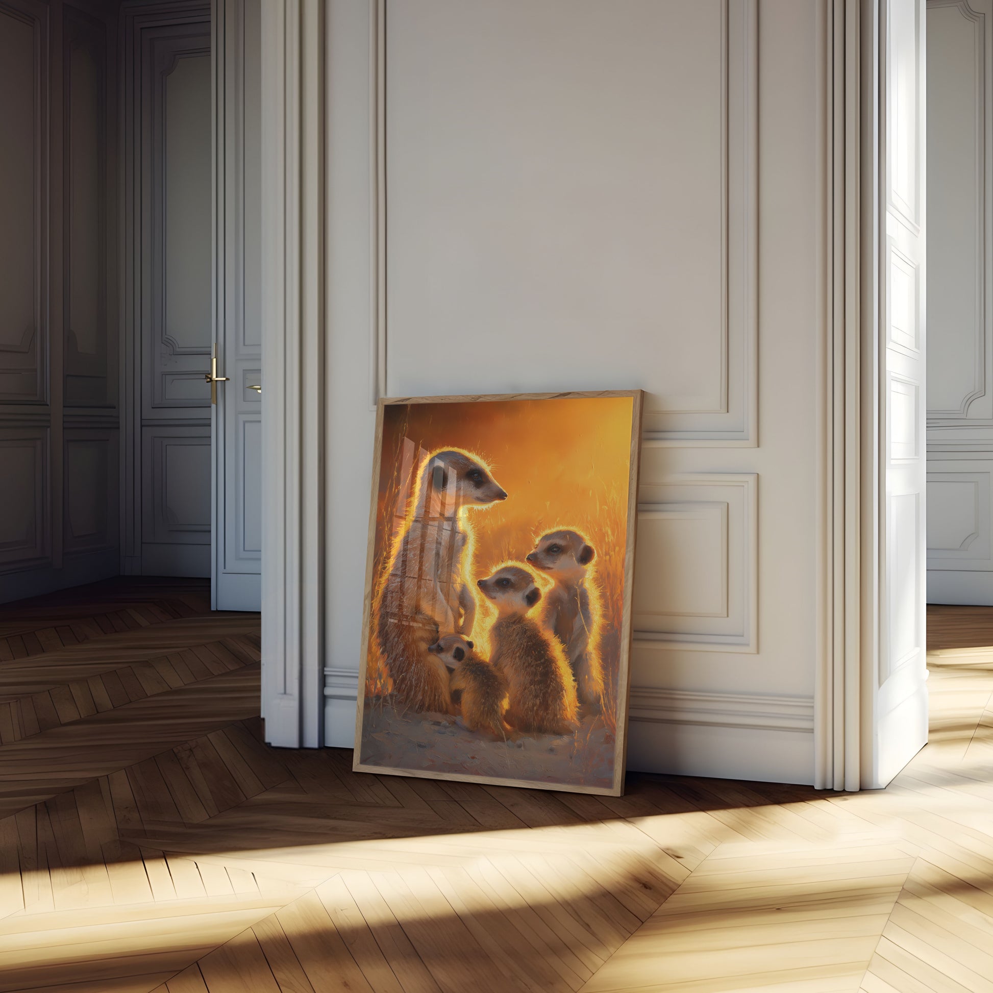 Découvrez la chaleur de la savane africaine avec ce magnifique portrait de famille de suricates baigné dans la lumière dorée du soleil. Le suricate adulte monte la garde tandis que trois jeunes suricates s'assoient alertes à ses côtés, leur fourrure lumineusement rétroéclairée par une douce lueur orange chaud. Cette belle œuvre d'art capture l'essence des liens familiaux et de la protection de la faune sauvage, avec les herbes du désert qui brillent à la lumière ambrée et créent une atmosphère à la fois de sérénité et de vigilance qui définit la vie des suricates.