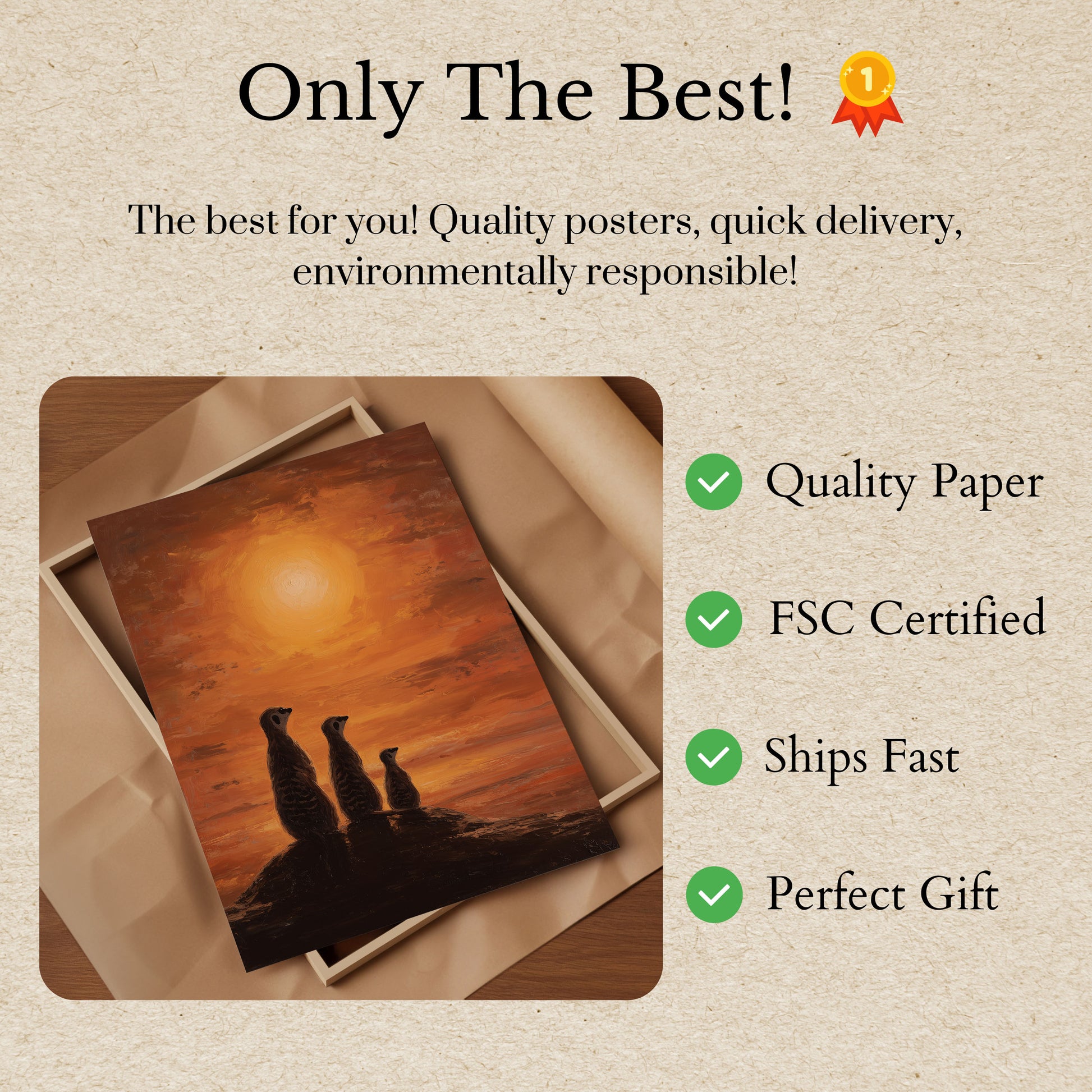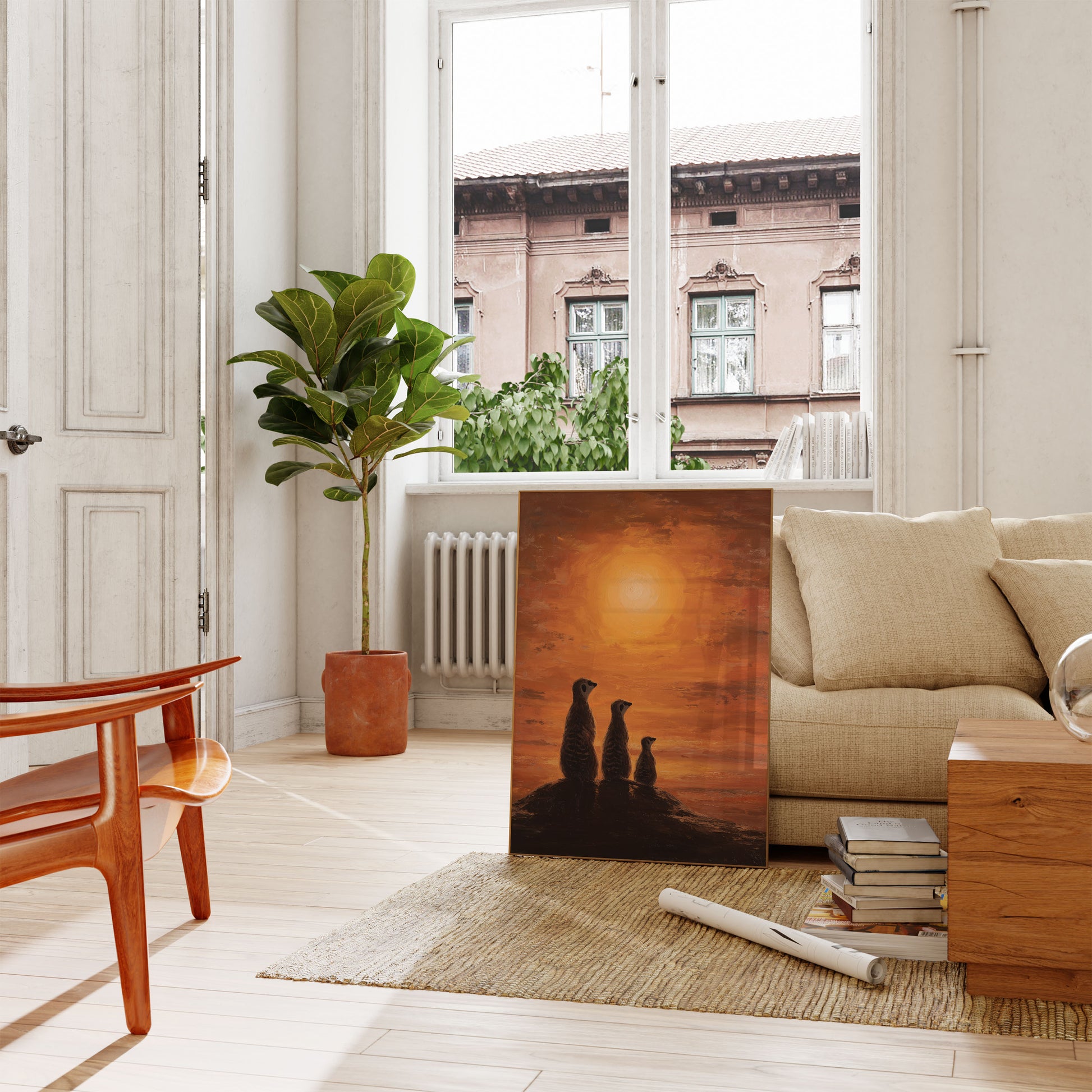 Regardez trois suricates curieux faire sentinelle contre un coucher de soleil désertique à couper le souffle dans cette superbe œuvre d'art animalière. Les tons chauds et dorés du soleil flamboyant créent un décor fascinant tandis que ces animaux emblématiques sont en silhouette sur un terrain rocheux, leurs postures alertes capturant leur vigilance naturelle et leur charme. Cette belle composition capture parfaitement l'esprit de la faune africaine, mêlant un éclairage dramatique à un portrait animalier intime pour créer une expérience visuelle inoubliable qui apporte chaleur et émerveillement à n'importe quel espace.