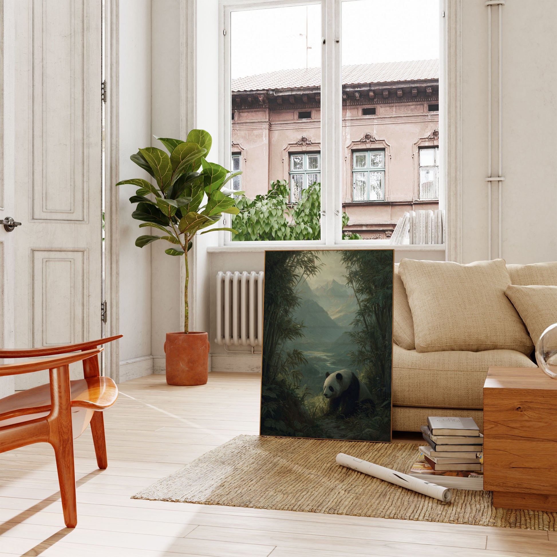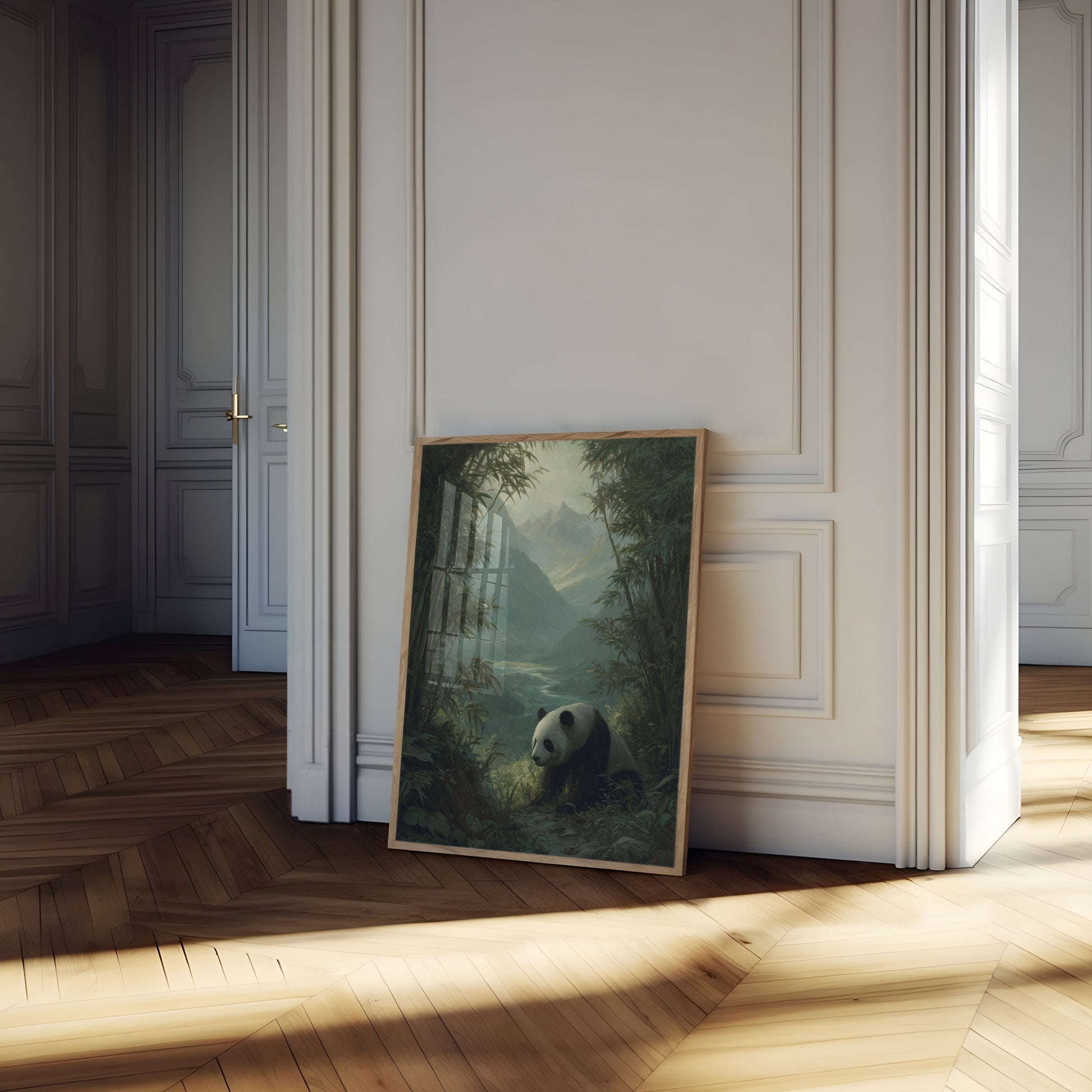 Un paysage serein dévoile un panda solitaire se reposant au cœur de luxuriantes forêts de bambous et de chaînes de montagnes éthérées. Des tons doux de vert et de bleu créent une atmosphère paisible, capturant l'essence sereine de l'habitat naturel du panda. L'œuvre mêle harmonieusement faune et paysage, invitant le spectateur à un moment de contemplation silencieuse.