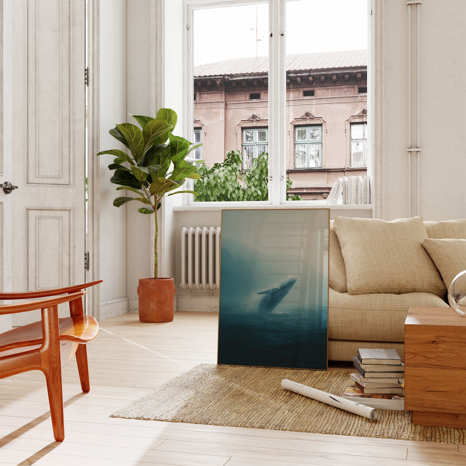 Dive into the ethereal world of marine majesty with this stunning poster capturing a humpback whale mid-breach in a soft, blue-green seascape. The image radiates tranquility and power, with the massive whale emerging from misty waters, creating a breathtaking moment of raw natural beauty. Soft gradient tones and delicate atmospheric details transform this marine scene into a mesmerizing visual experience that connects viewers to the profound mystery of ocean life.
