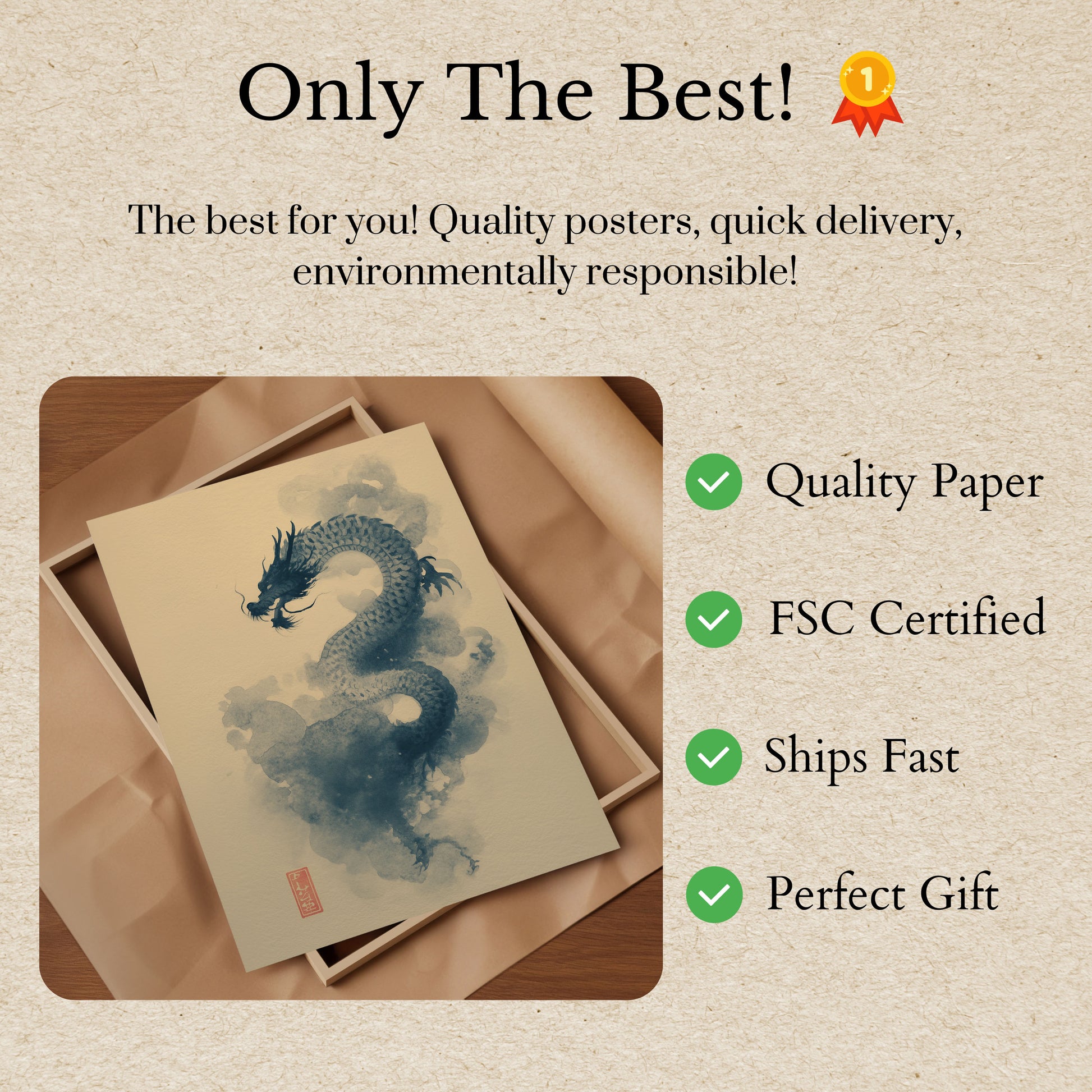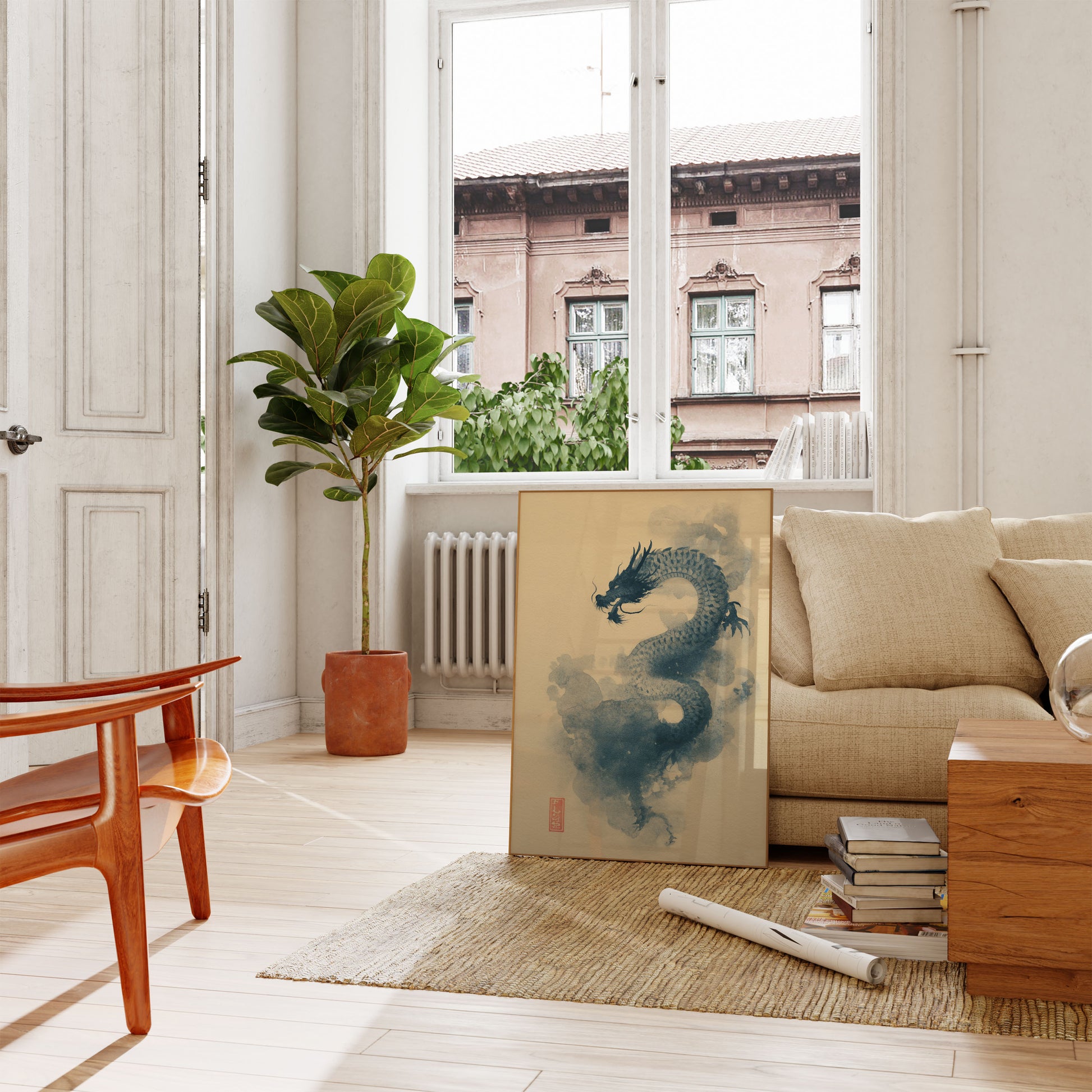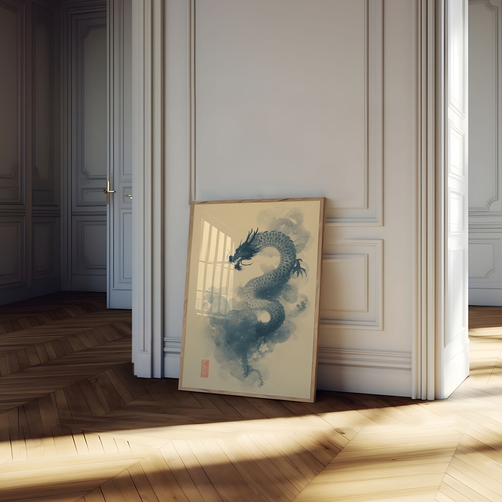 Plongez dans l'univers éthéré de cette superbe illustration de dragon chinois, réalisée dans d'élégantes nuances de bleu-gris à l'aquarelle. Le dragon tournoie à travers les nuages brumeux, son corps écailleux s'enroulant avec une grâce puissante et un mystère ancestral. Inspirée de l'art traditionnel d'Asie orientale, cette affiche capture l'esprit mythique d'une créature légendaire émergeant de paysages vaporeux et éthérés.