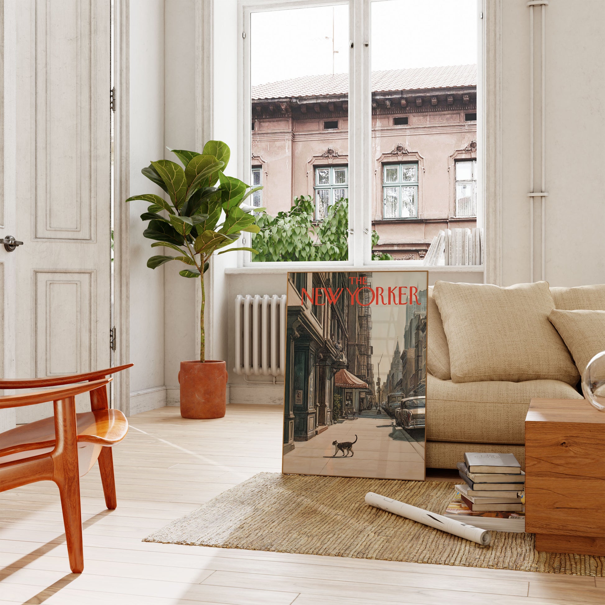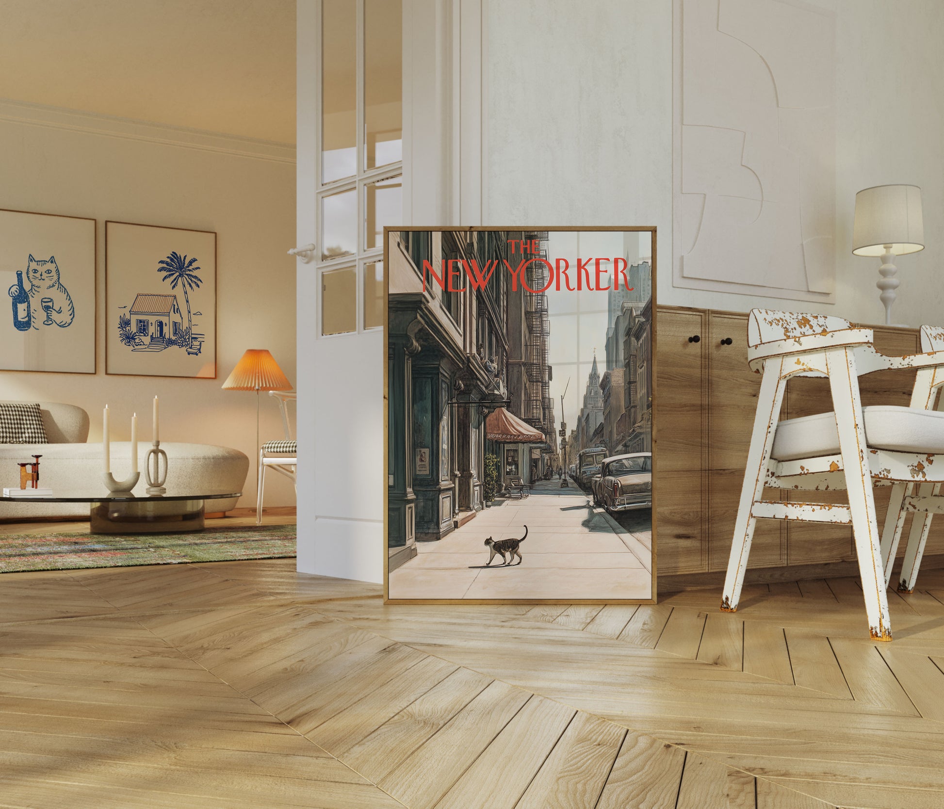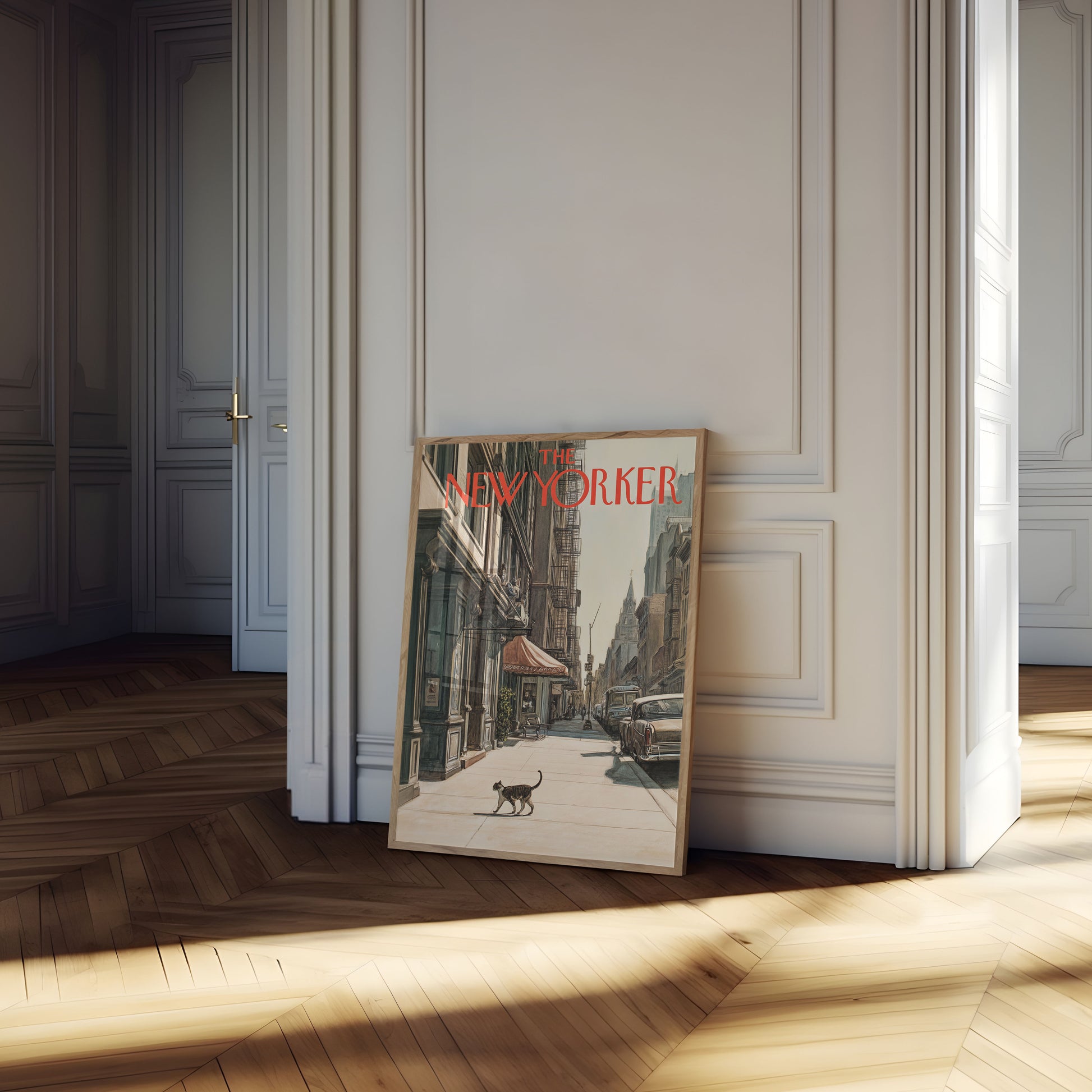 Immerse yourself in the quiet urban poetry of a classic New Yorker magazine cover, where a solitary cat traverses a sunlit sidewalk amidst towering buildings and vintage cars. This beautifully rendered illustration captures the essence of mid-century New York City - a moment of serene stillness in the bustling metropolis, with architectural details and soft color palette that evoke nostalgia and urban tranquility.