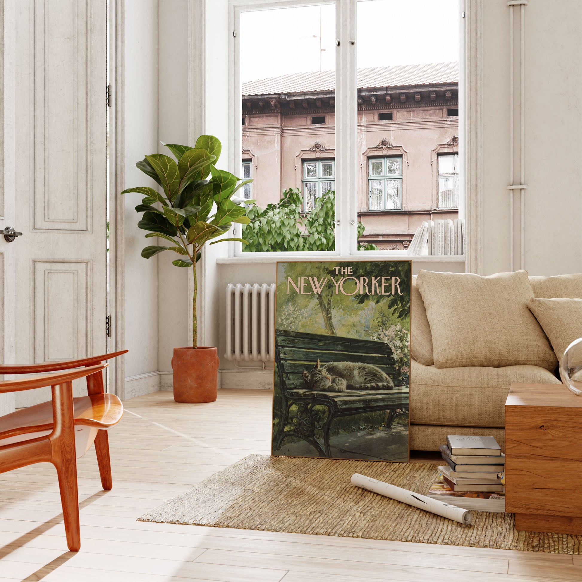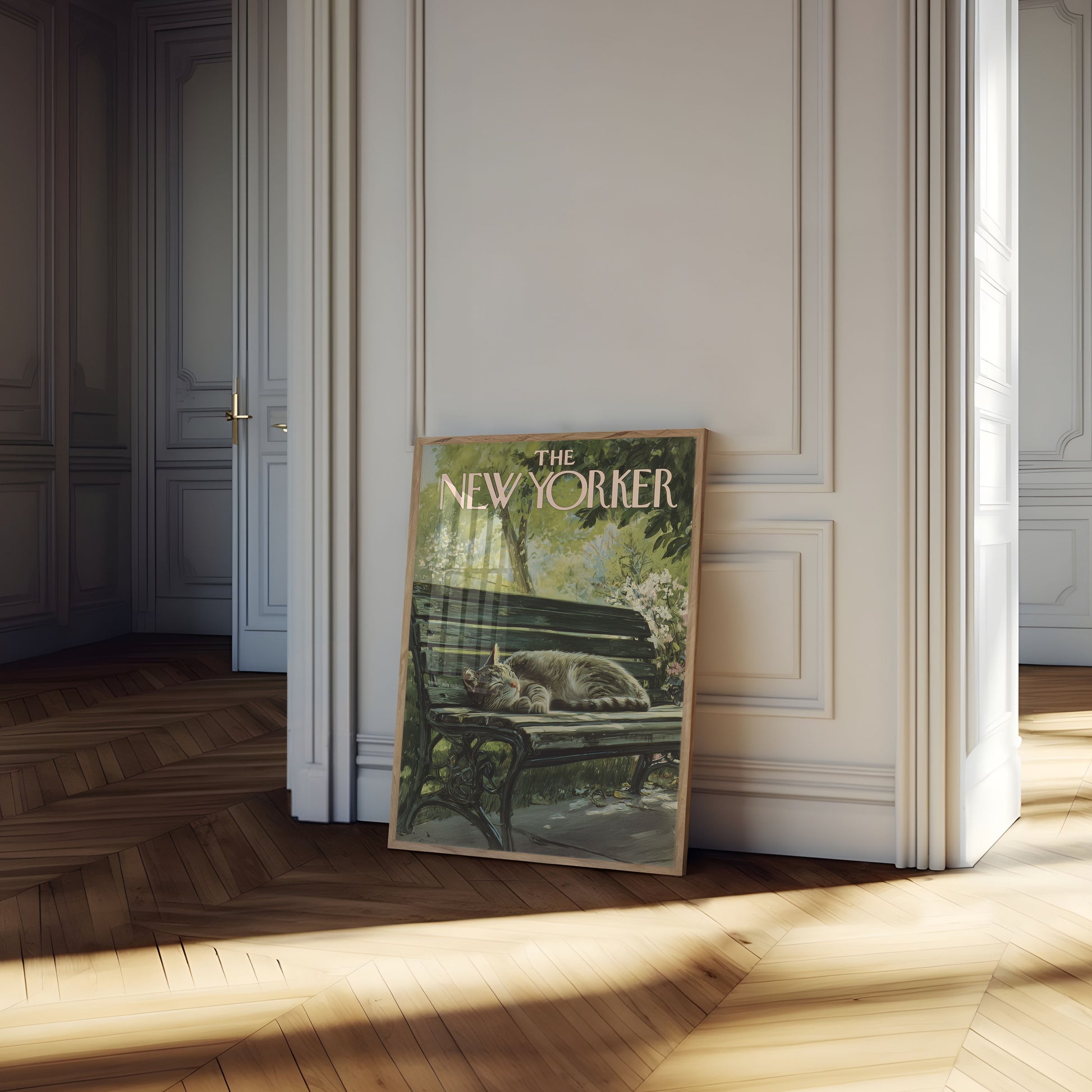 A serene scene captures a contented cat napping peacefully on a park bench, surrounded by lush green foliage and delicate white blossoms. The vintage New Yorker magazine cover style creates a nostalgic and tranquil atmosphere, inviting viewers into a moment of pure relaxation. This charming illustration celebrates the simple joy of a cat's leisurely afternoon in a verdant urban setting.