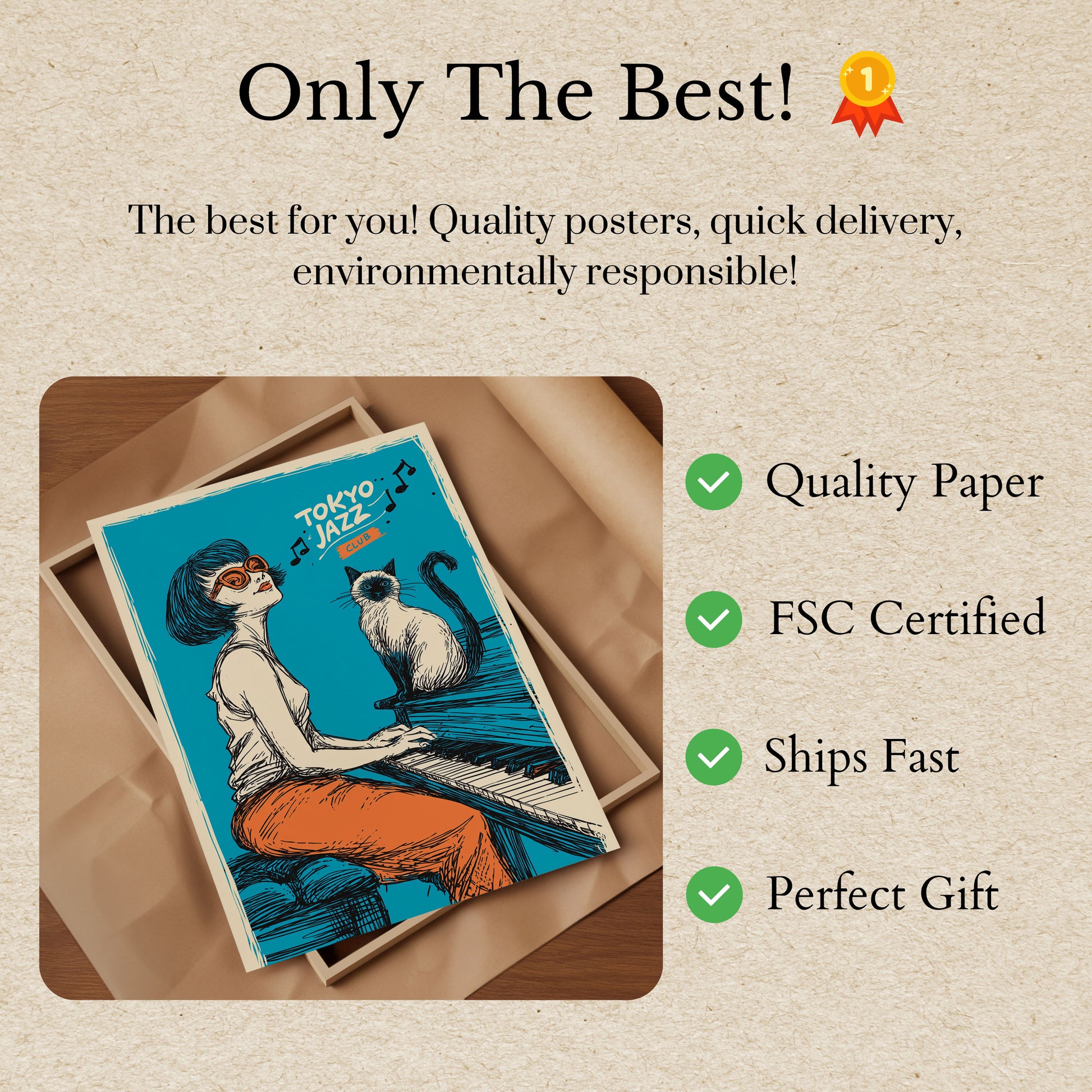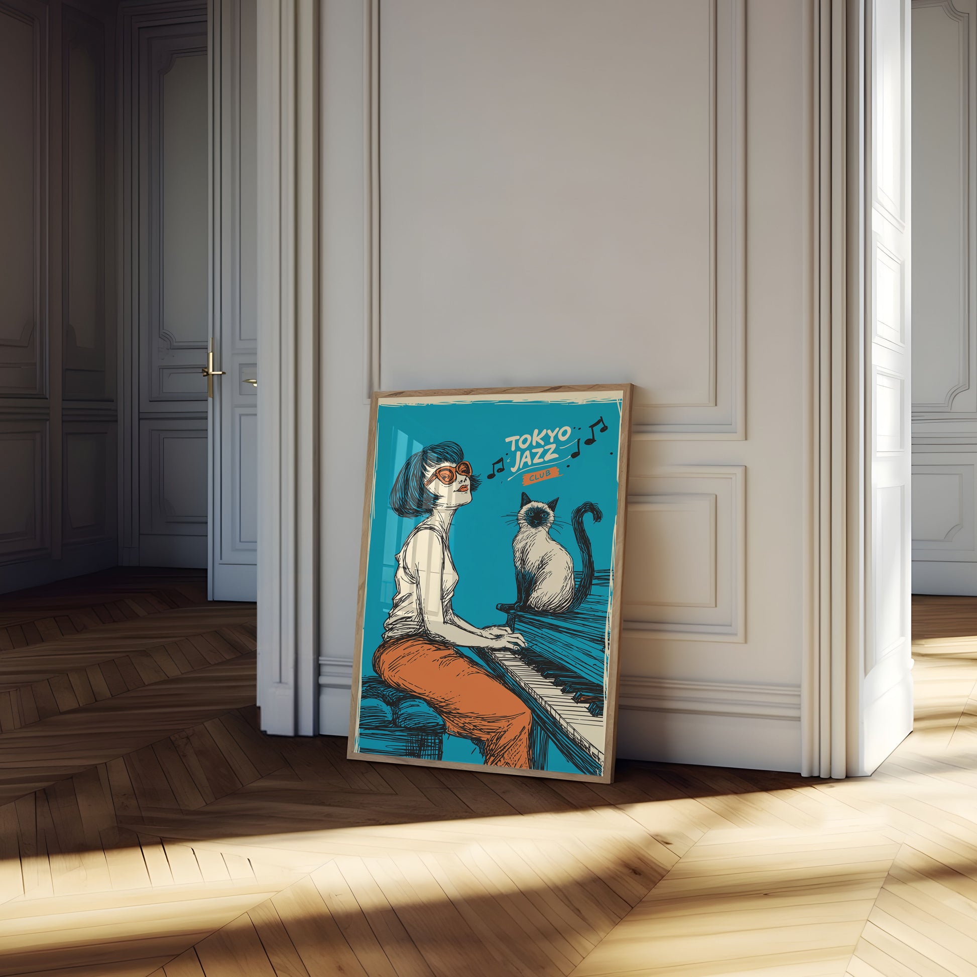 Dive into the cool, vibrant world of Tokyo's jazz scene with this stylish illustration featuring a chic woman in orange pants and sunglasses playing piano, accompanied by an elegant Siamese cat. Rendered in a striking blue and orange color palette, this poster captures the essence of mid-century jazz club aesthetics with its bold graphic design and musical notes dancing across the background.