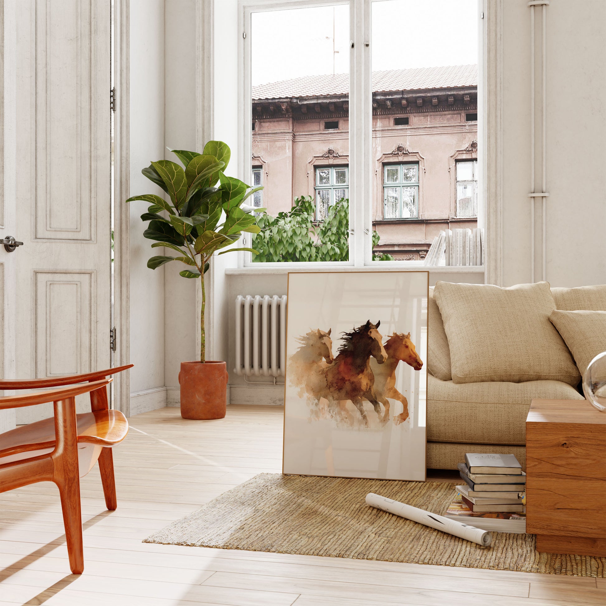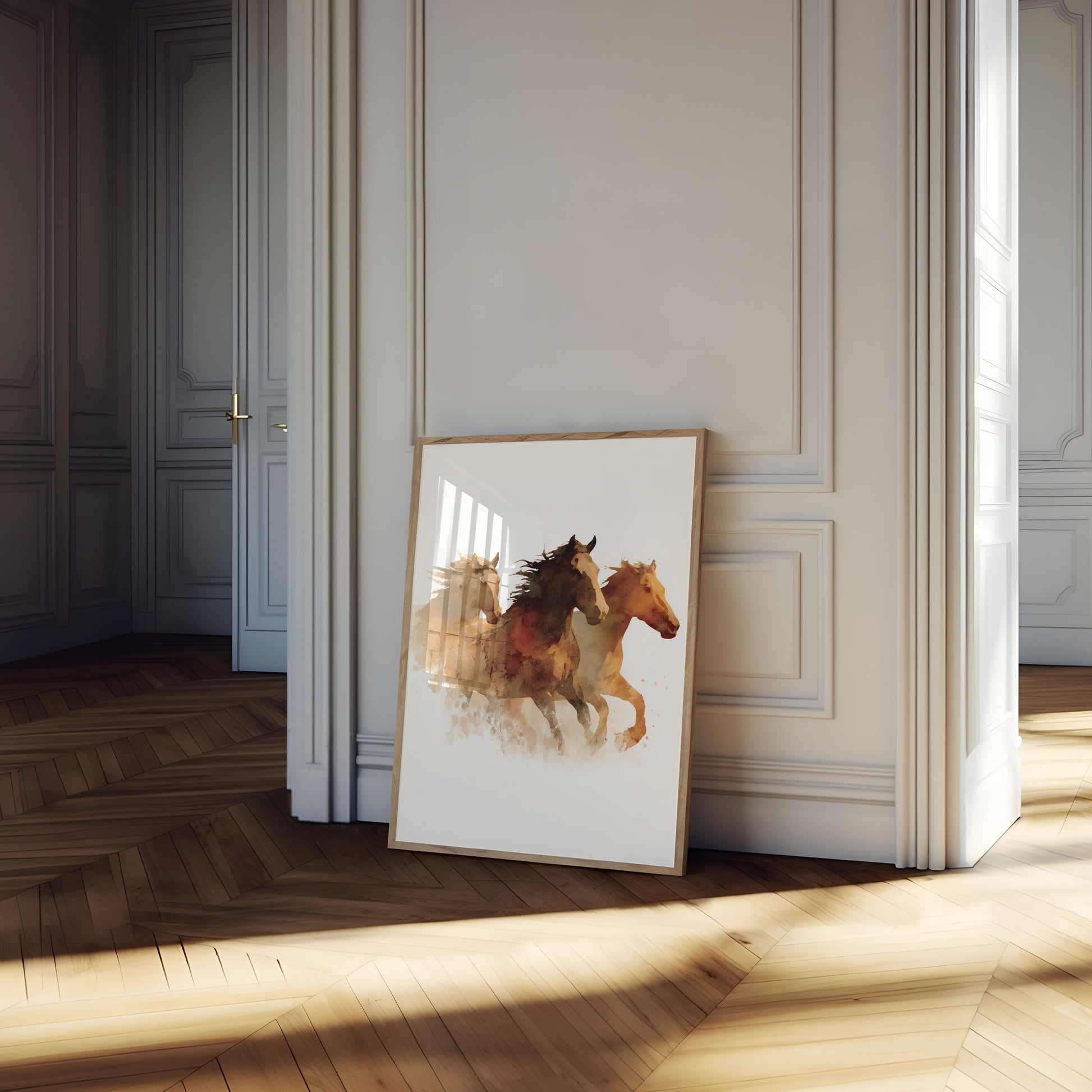 Unleash the raw energy and untamed spirit of the wilderness with this stunning watercolor print featuring three majestic horses in motion. Rendered in rich earth tones of amber, rust, and deep brown, the horses surge forward in a dynamic composition that captures the essence of freedom and power. Each horse is beautifully blended with soft, flowing watercolor techniques that create a sense of movement and emotion against a soft, ethereal background.