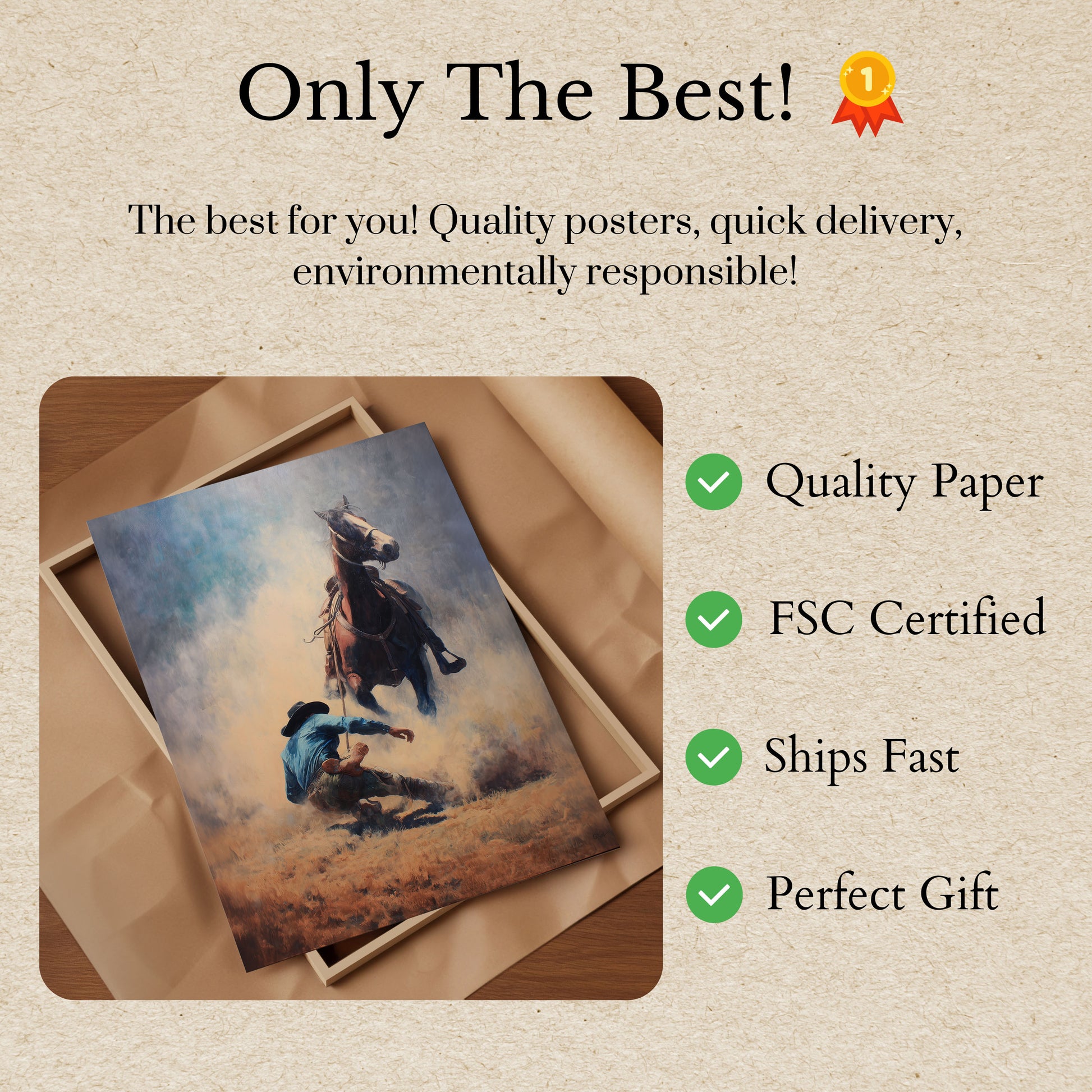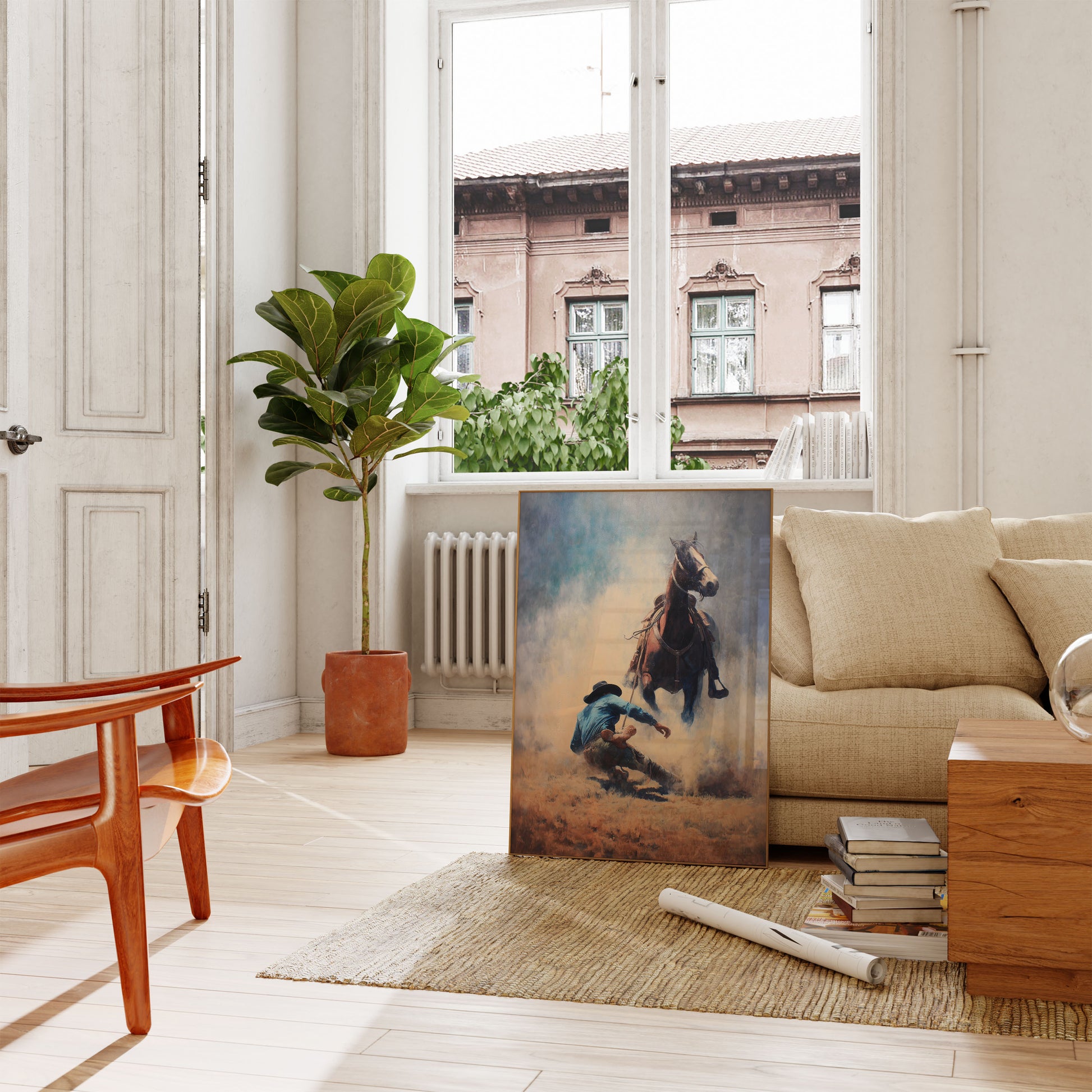 Capture the raw intensity of cowboy life with this dramatic fine art print depicting a heart-pounding rodeo scene. A powerful horse rears up as a cowboy tumbles through a dusty, windswept landscape, embodying the untamed spirit of the American West. Rich, moody blues and warm earth tones create a cinematic atmosphere that brings the action and emotion of this intense moment to life.