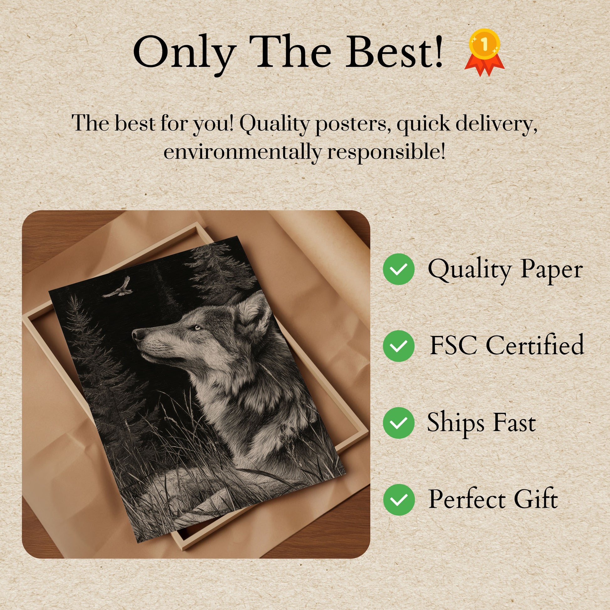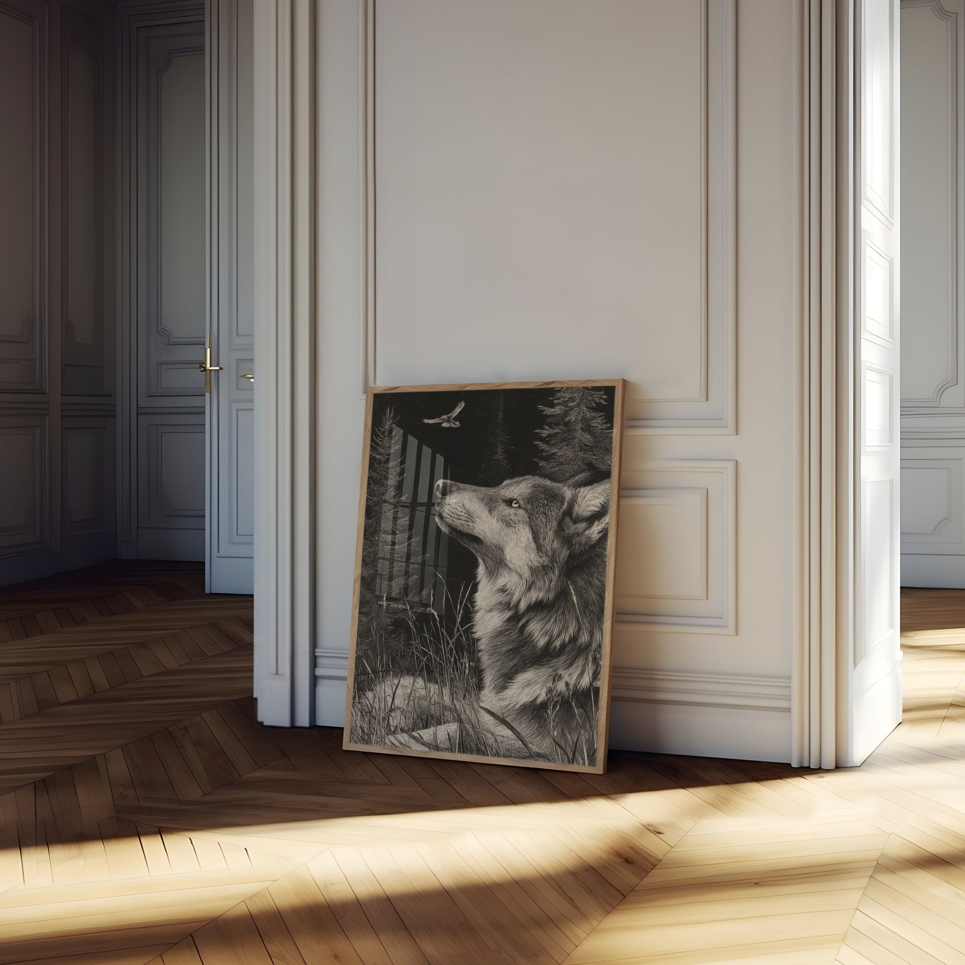 A breathtaking black and white artwork captures the profound spirit of a wolf in its natural habitat. The intricate scratchboard illustration reveals every delicate hair and nuanced texture, with the wolf's intense gaze fixed upward towards a soaring bird against a dark, pine-laden background. This stunning piece evokes the raw, untamed essence of wilderness and the silent communication between predator and prey.