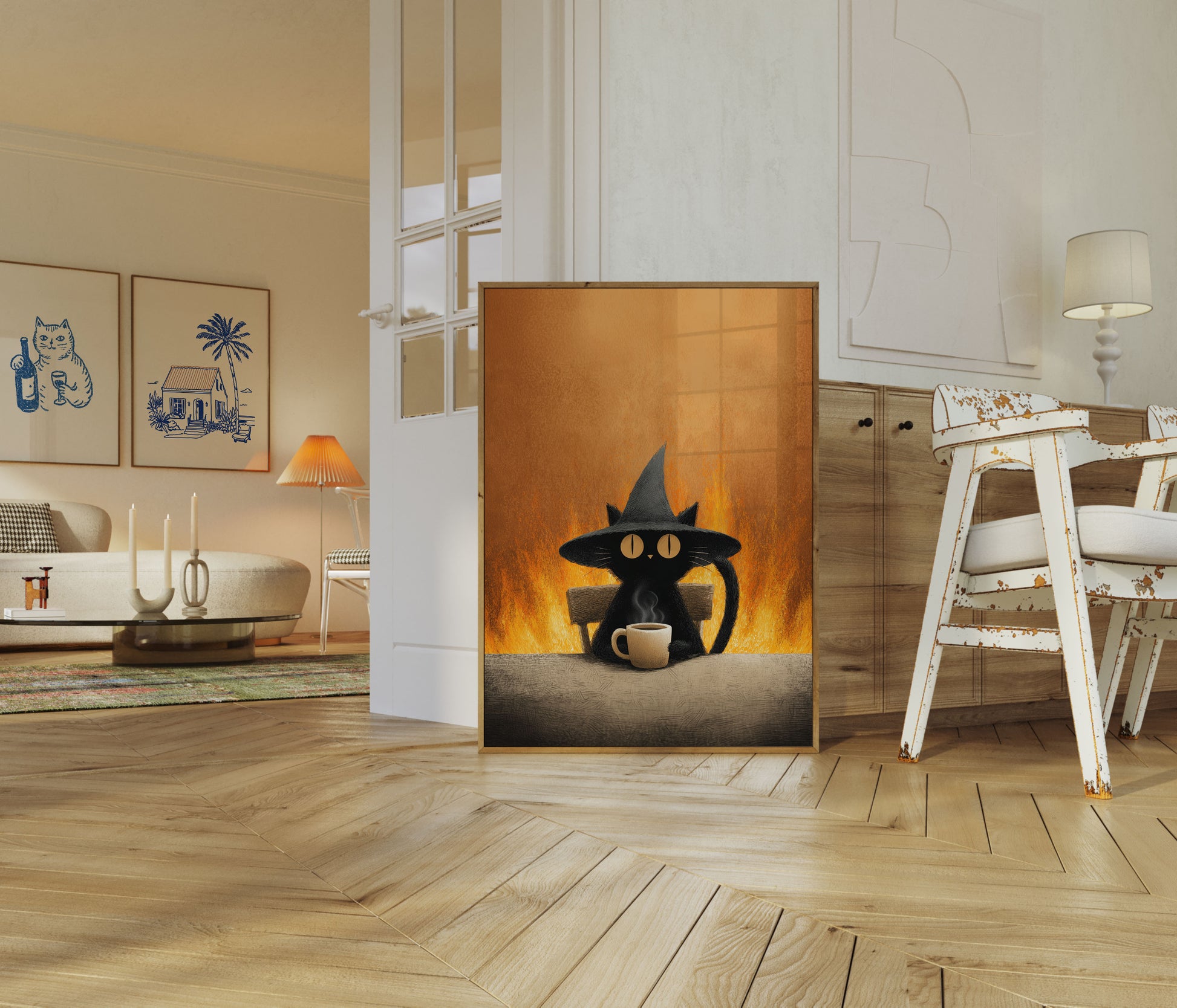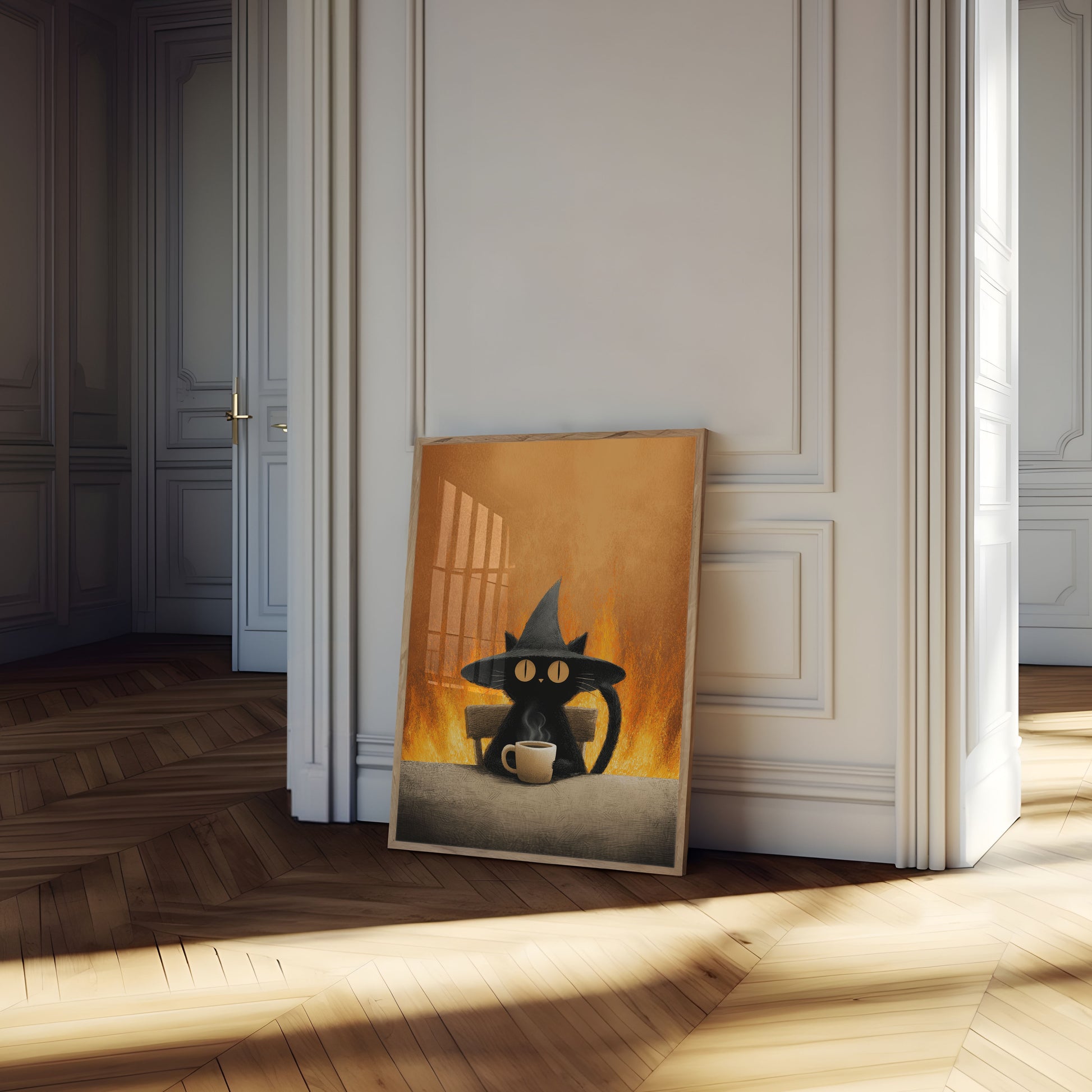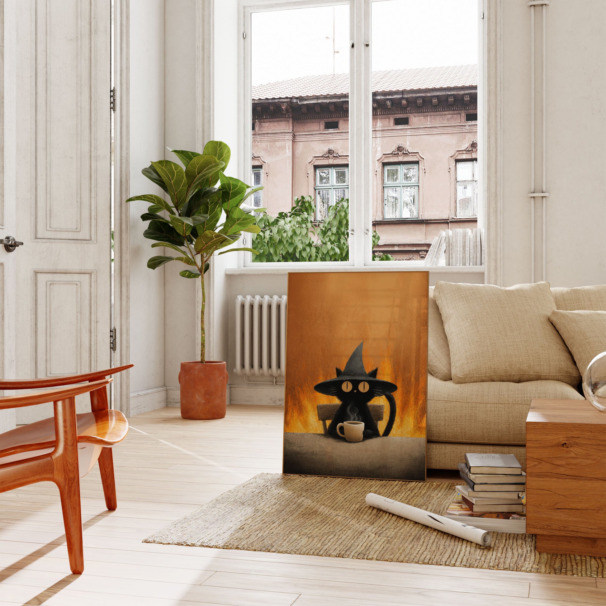In a blazing world of fiery orange, a mischievous black cat wearing a pointy witch hat sits serenely amidst dancing flames, clutching a steaming coffee mug. With large, hypnotic yellow eyes and a perfectly poised silhouette, this magical feline embodies the perfect blend of Halloween spirit and morning coffee ritual. The artwork captures a delightfully quirky moment of calm amid supernatural chaos.
