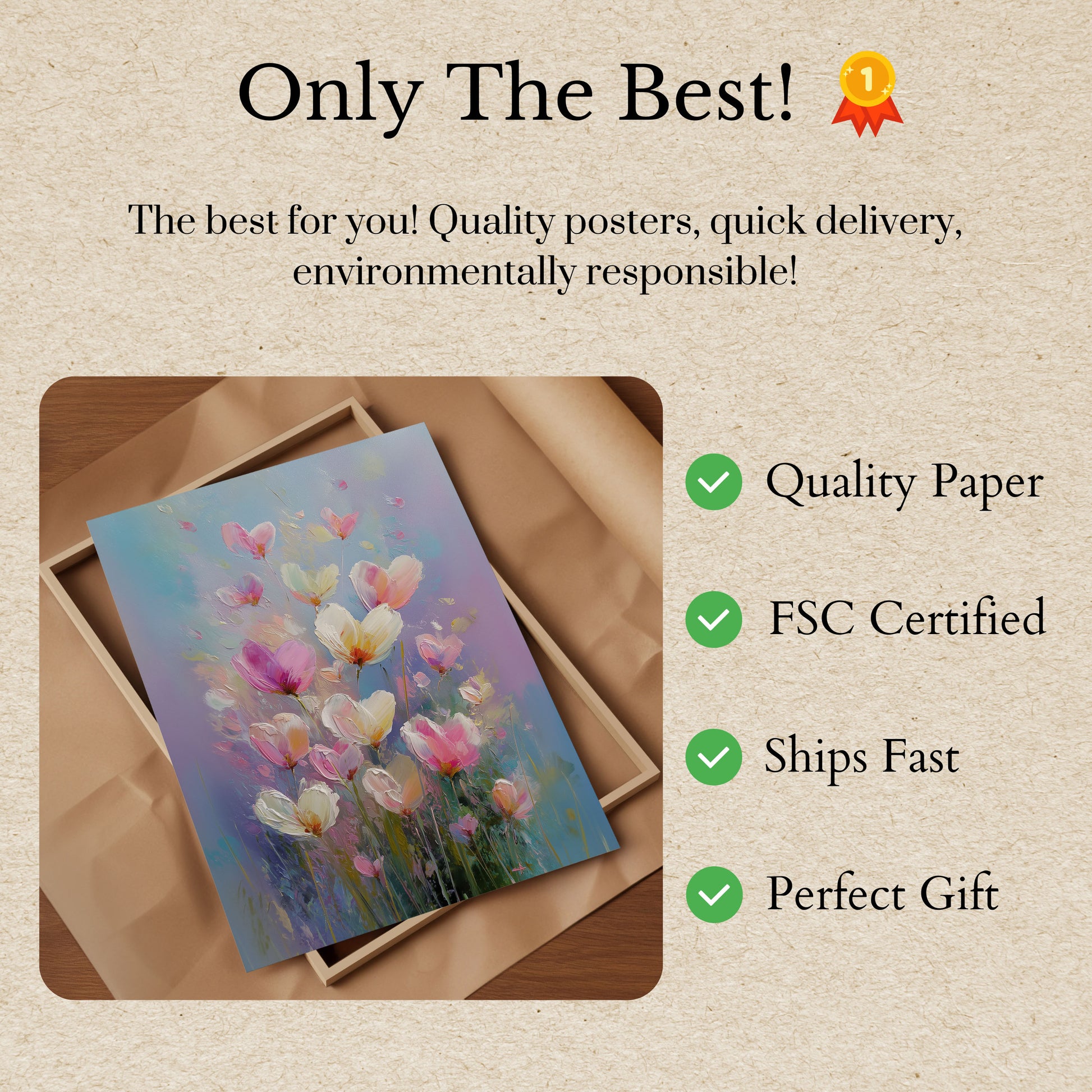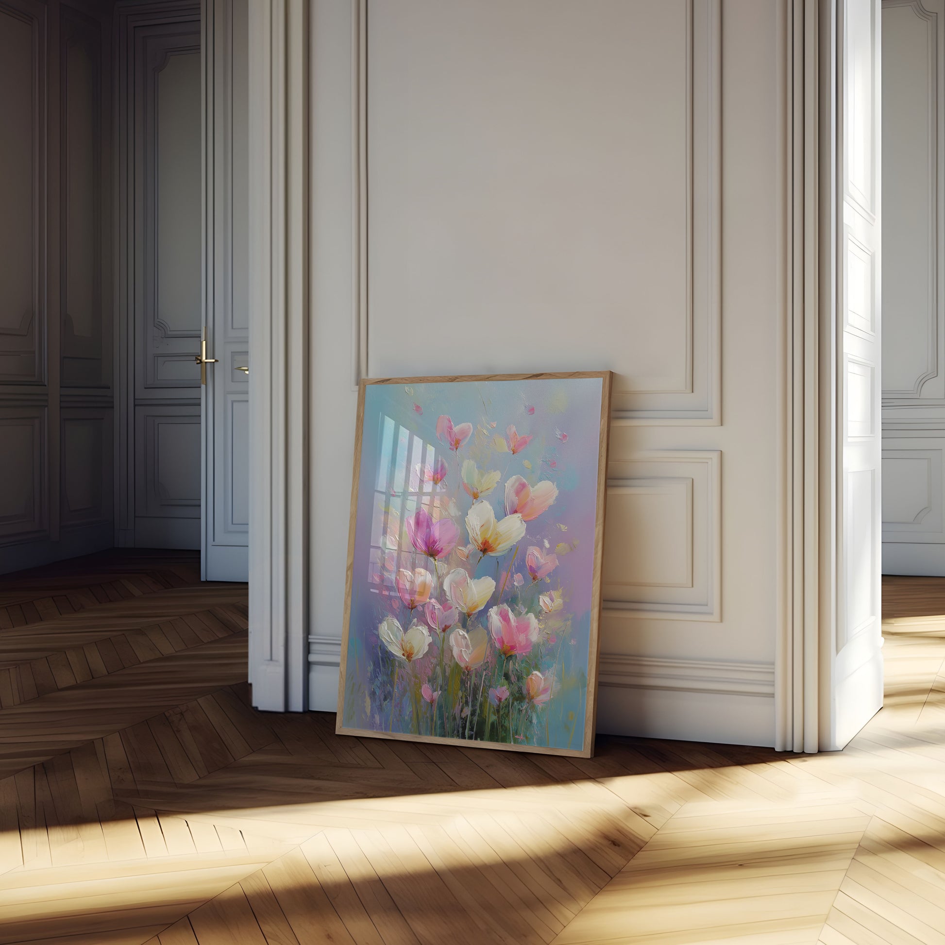 Questo straordinario dipinto cattura un giardino onirico di fiori cosmos in piena fioritura, reso con pennellate morbide e colori eterei. La composizione presenta delicati petali rosa, bianchi e color crema che danzano contro un cielo sereno blu e viola, creando un'atmosfera pacifica e edificante. Lo stile impressionistico sciolto conferisce movimento e vita alla scena, con petali che galleggiano dolcemente nell'aria, rendendo quest'opera d'arte perfetta per chiunque desideri aggiungere tranquillità e bellezza naturale al proprio spazio.