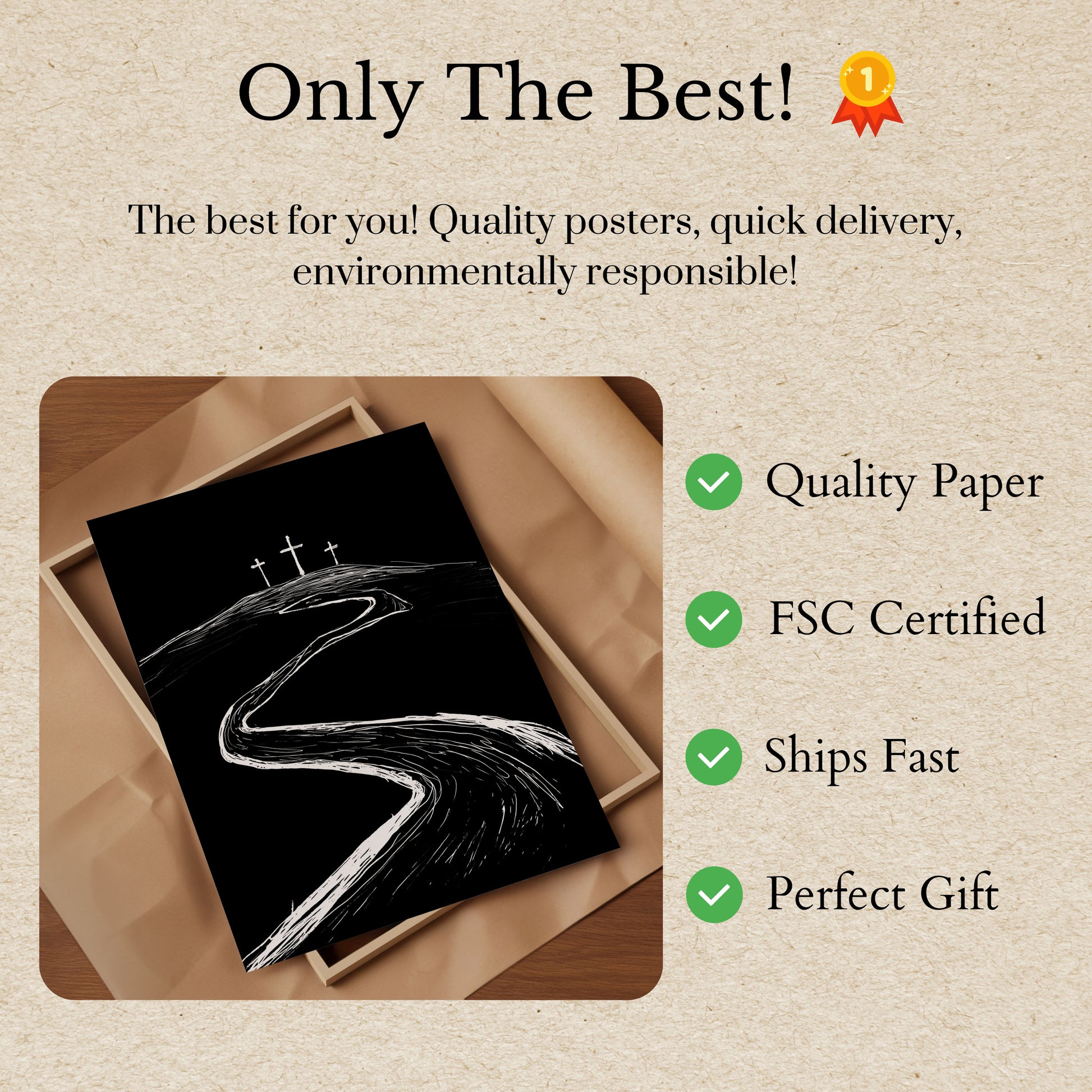 Una rappresentazione artistica in bianco e nero di tre croci su una collina, che simboleggia il profondo viaggio spirituale della redenzione. Il sentiero tortuoso che porta alla vetta crea una potente metafora visiva del difficile percorso spirituale della vita, con le croci che si ergono come fari di speranza e sacrificio contro lo sfondo scuro.