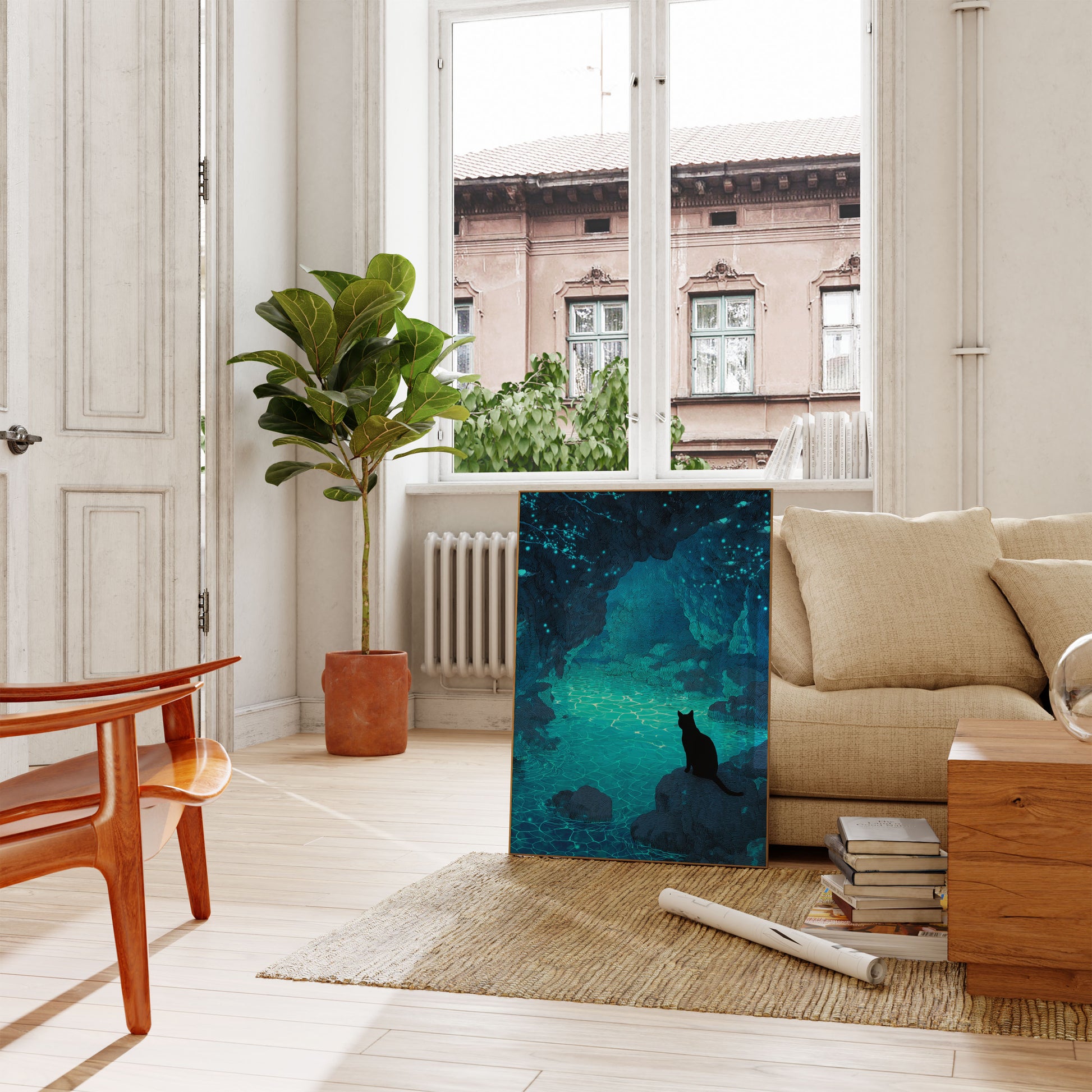 Questo affascinante capolavoro cattura un solitario gatto nero seduto tranquillamente su spiagge rocciose, che contempla un lago sotterraneo luminescente. La scena è immersa in tonalità eteree di ciano e turchese, con delicate luci brillanti sparse sul soffitto della grotta come stelle, creando un'atmosfera di meraviglia magica e contemplazione serena. Il lavoro lineare intricato e i riflessi dell'acqua scintillante si combinano per creare un ambiente onirico, quasi mistico, che ti attira in questo mondo sotterraneo nascosto.