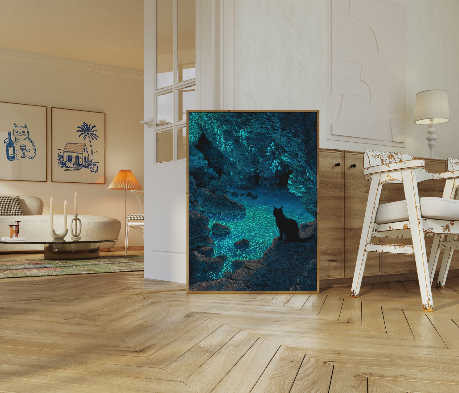 Entra in un mondo magico dove un gatto in silhouette siede a contemplare una grotta luminescente piena di acque bioluminescenti brillanti. Questa affascinante opera d'arte cattura un sereno momento di solitudine e meraviglia, con la forma scura del gatto perfettamente incorniciata dal bagliore turchese etereo che illumina la grotta rocciosa. I dettagli intricati delle texture di pietra contrastano splendidamente con la luce onirica e ultraterrena, creando un'atmosfera che sembra sia mistica che tranquilla. La ricca tavolozza di colori di blu profondi e azzurro vibrante evoca un senso di mistero e tranquillità che trasformerà qualsiasi spazio in un santuario contemplativo.