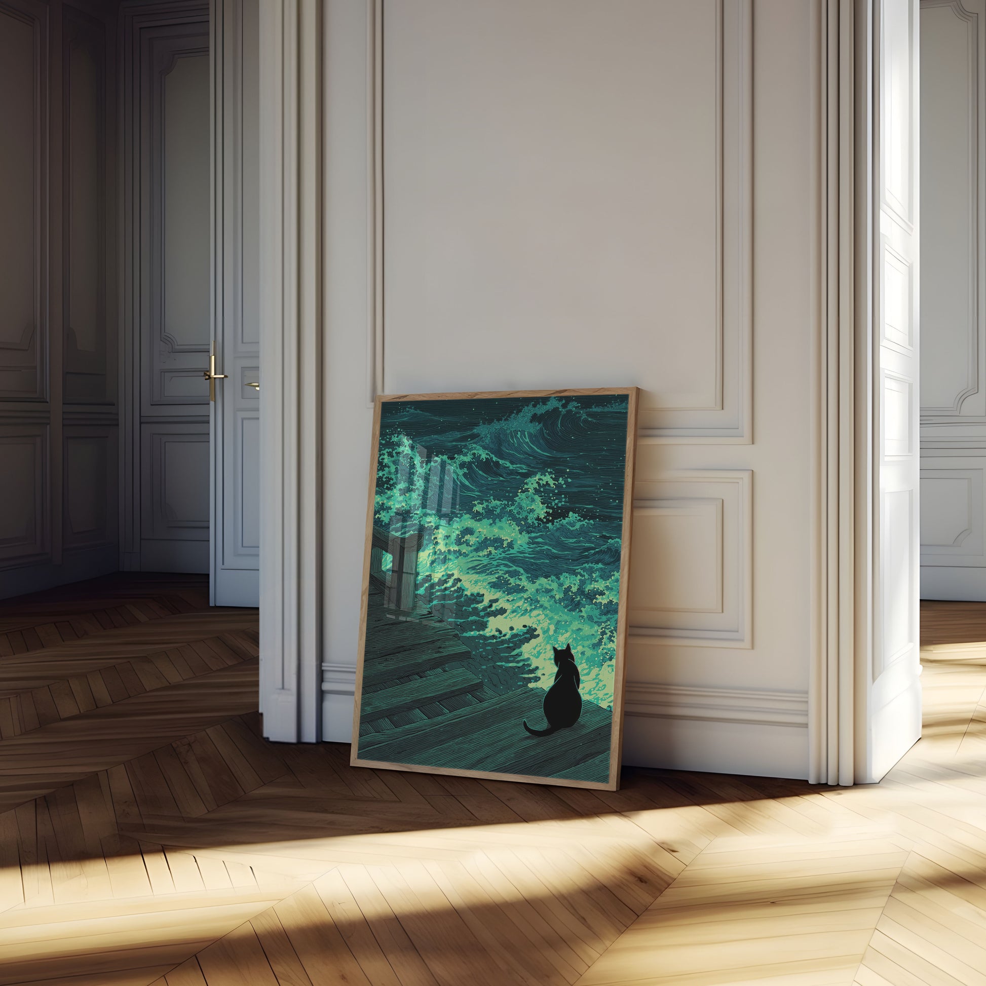 Poster del Gatto che Osserva le Onde Bioluminescenti